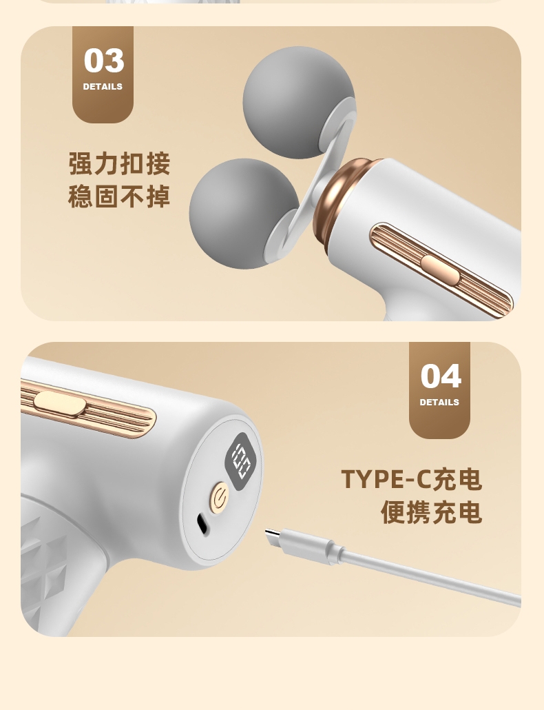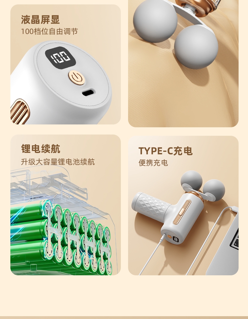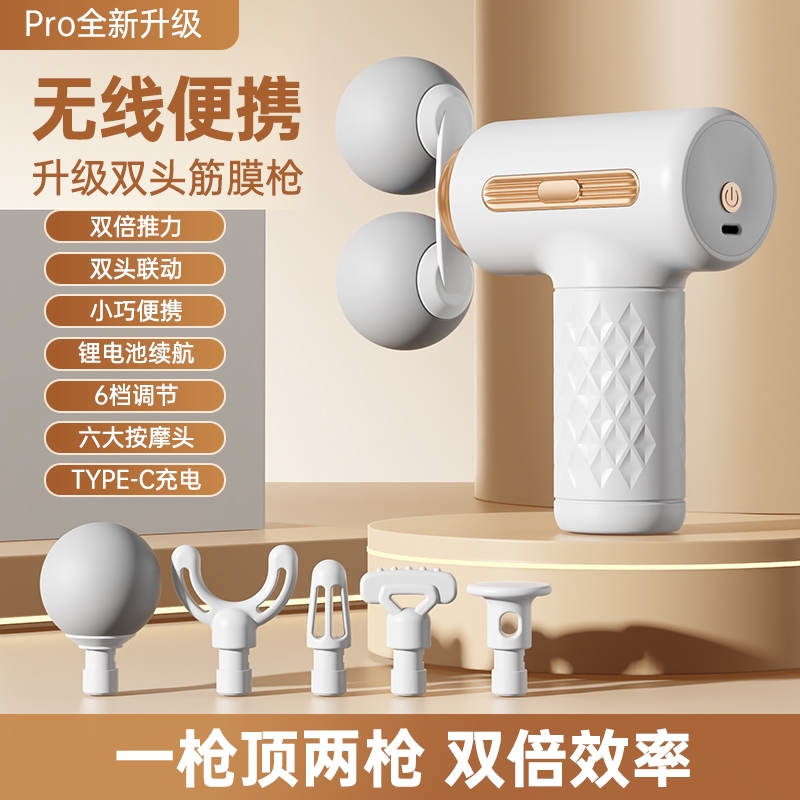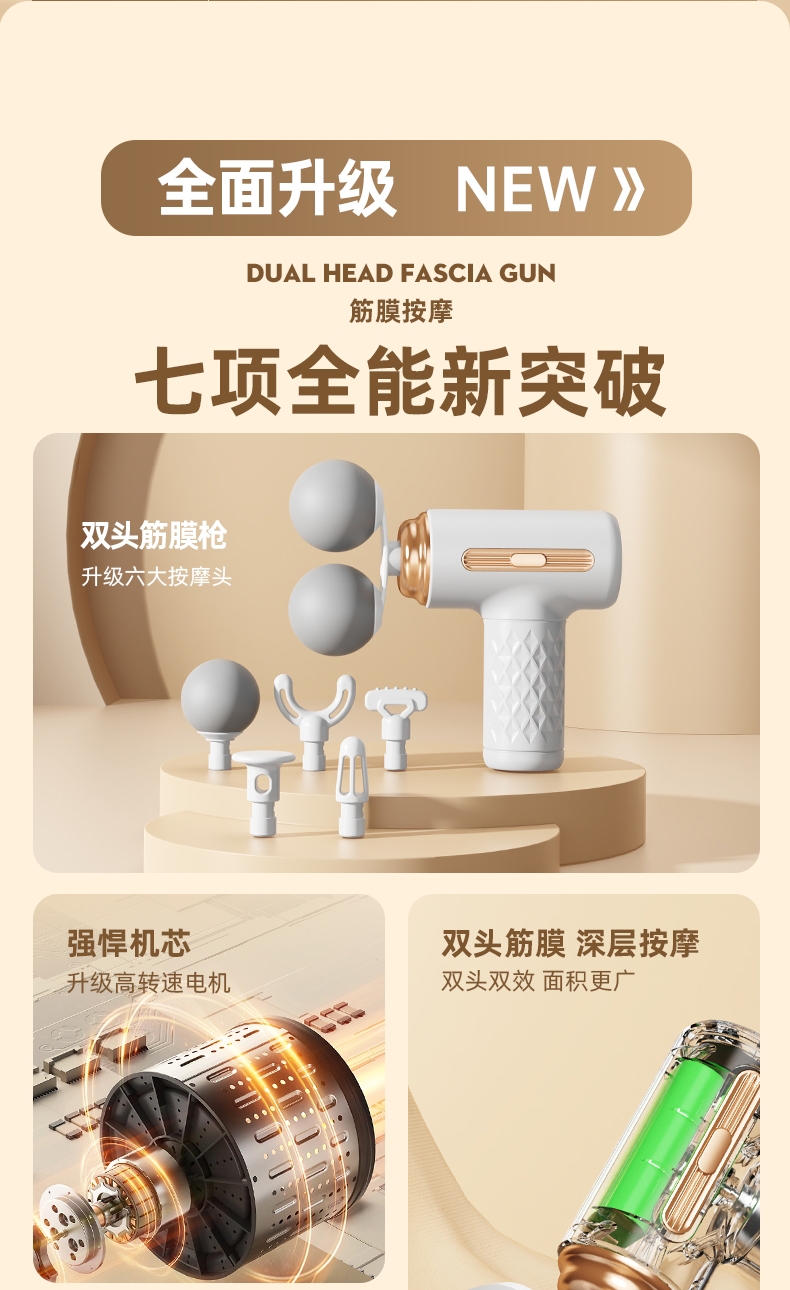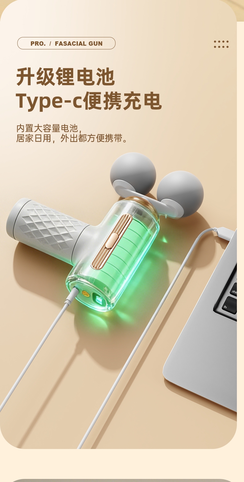 双头筋膜按摩;锂电续航,升级大容量锂电池续航;TYPE-C充电, 便携充电