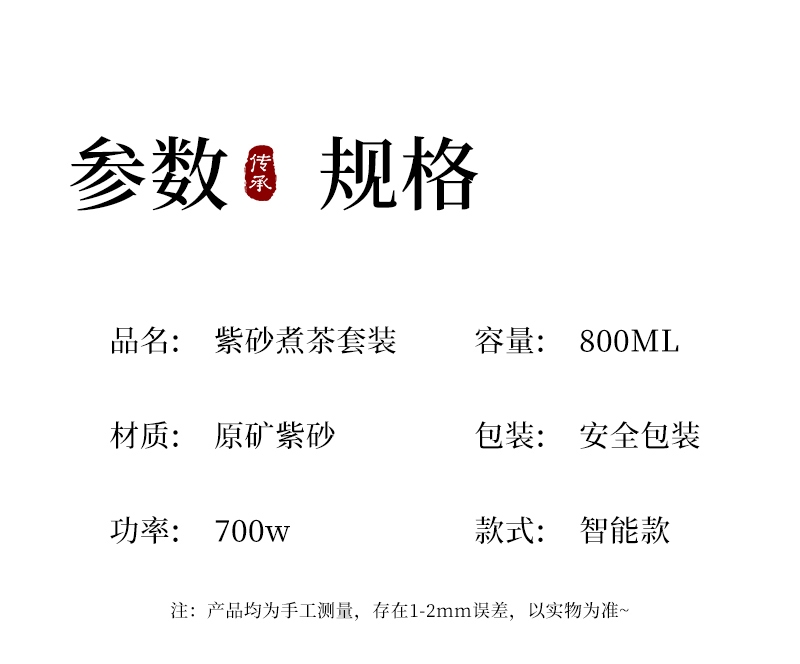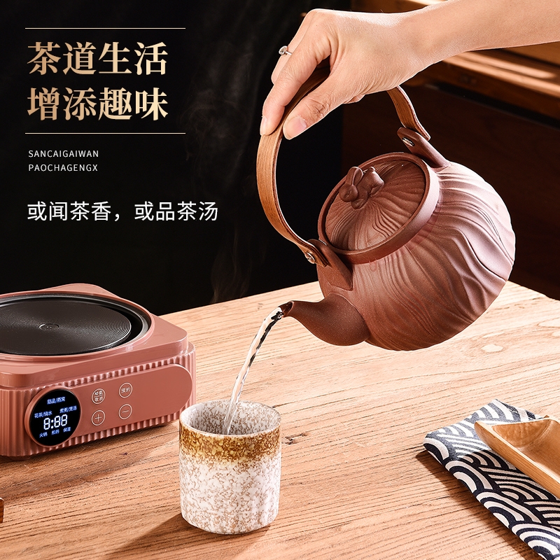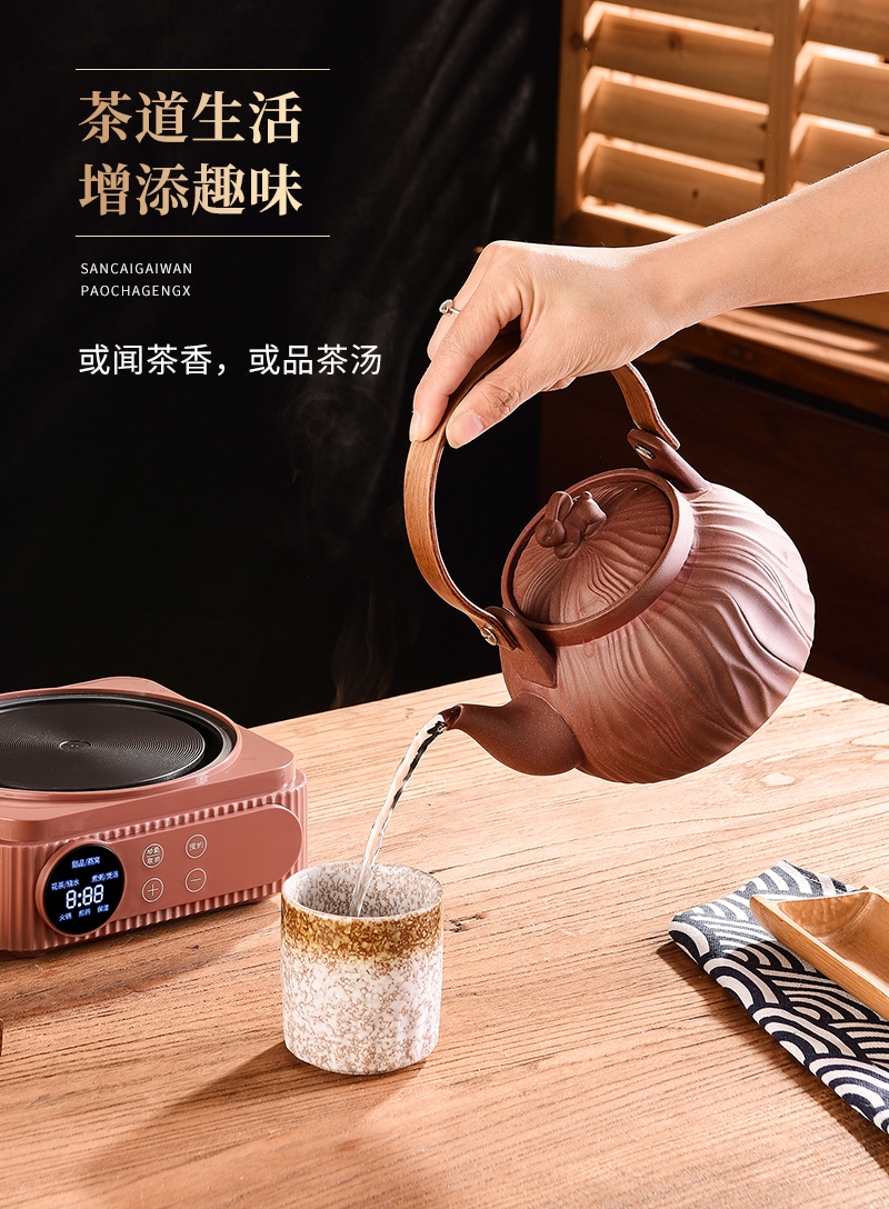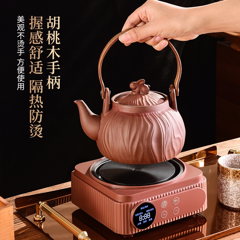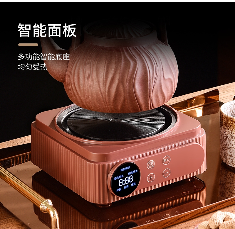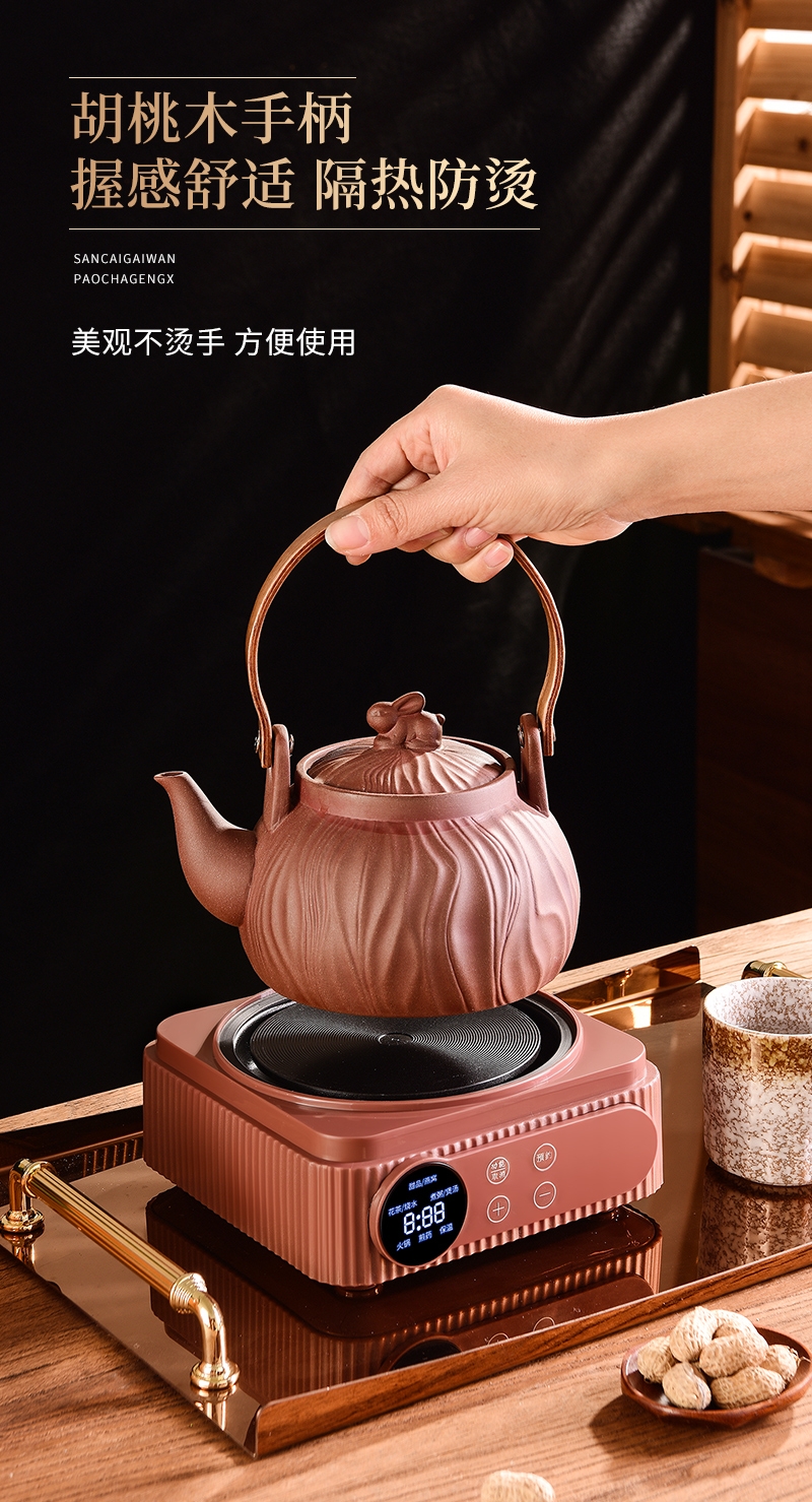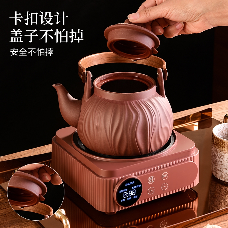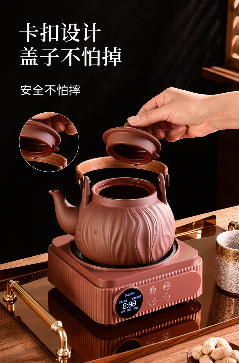 原矿紫砂,匠心打造;一键智能触控,多功能菜单;360º聚热底座,加大发热面,受热均匀,不挑锅具;胡桃木手柄,握感舒适,隔热防烫;卡扣设计,盖子不怕掉,安全不怕摔