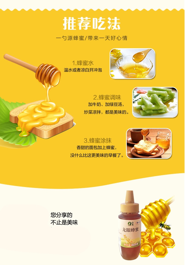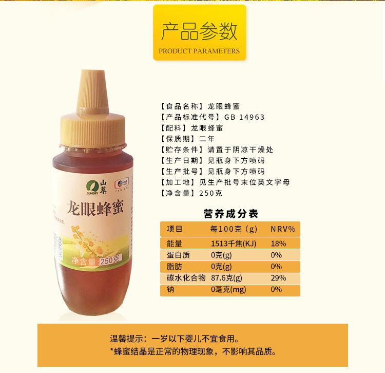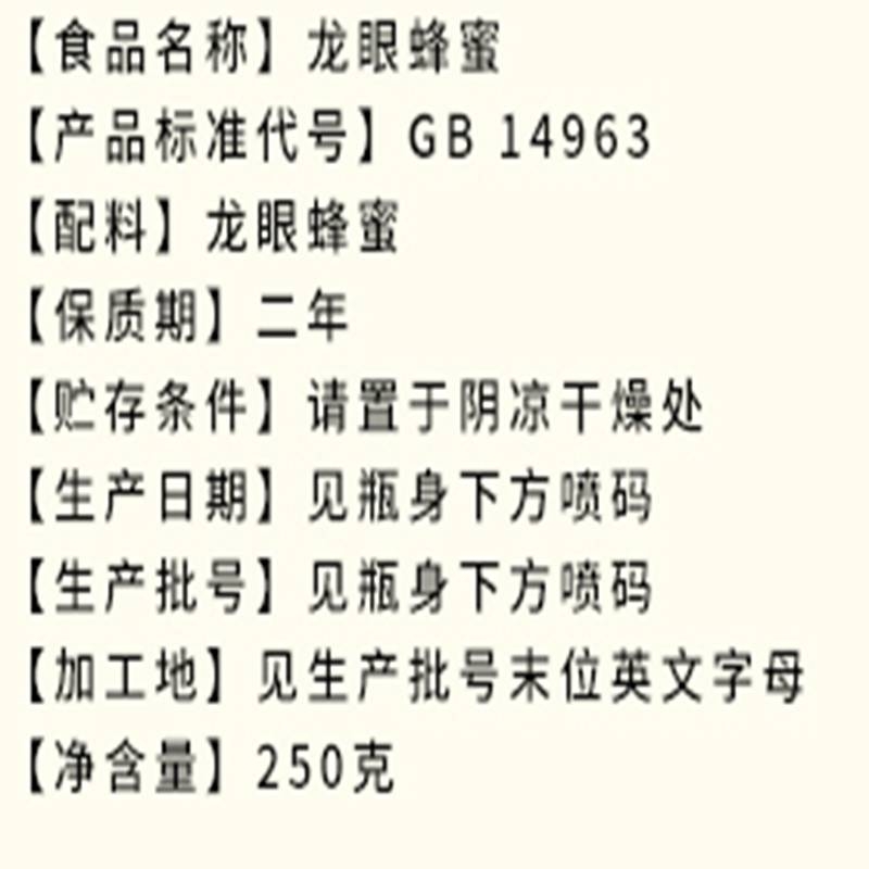 精选优质龙眼蜜源,纯正无添加自然醇香;质地浓稠色泽纯正,口感清甜回味悠长;大品牌品质有保障,冲饮涂抹烘焙皆宜。