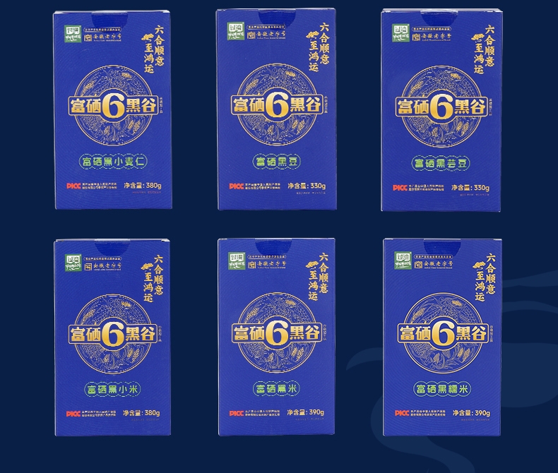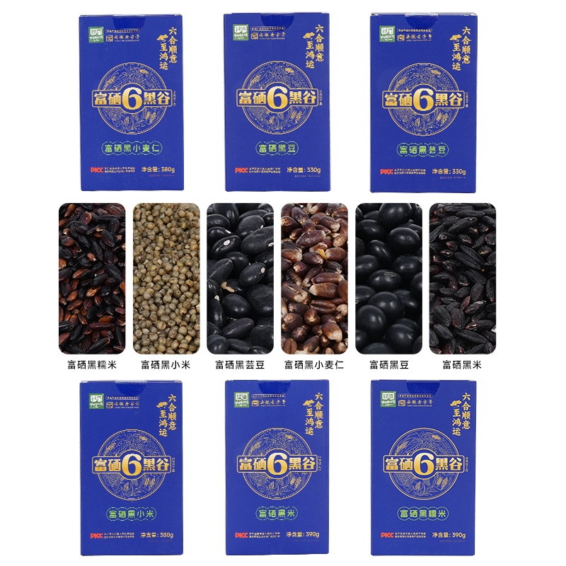 产品配置: 富硒黑豆330g*1+富硒黑米390g*1 +富硒黑糯米390g*1 +富硒黑芸豆330*1 +富硒黑小米380g*1 + 富硒黑小麦仁380g*1