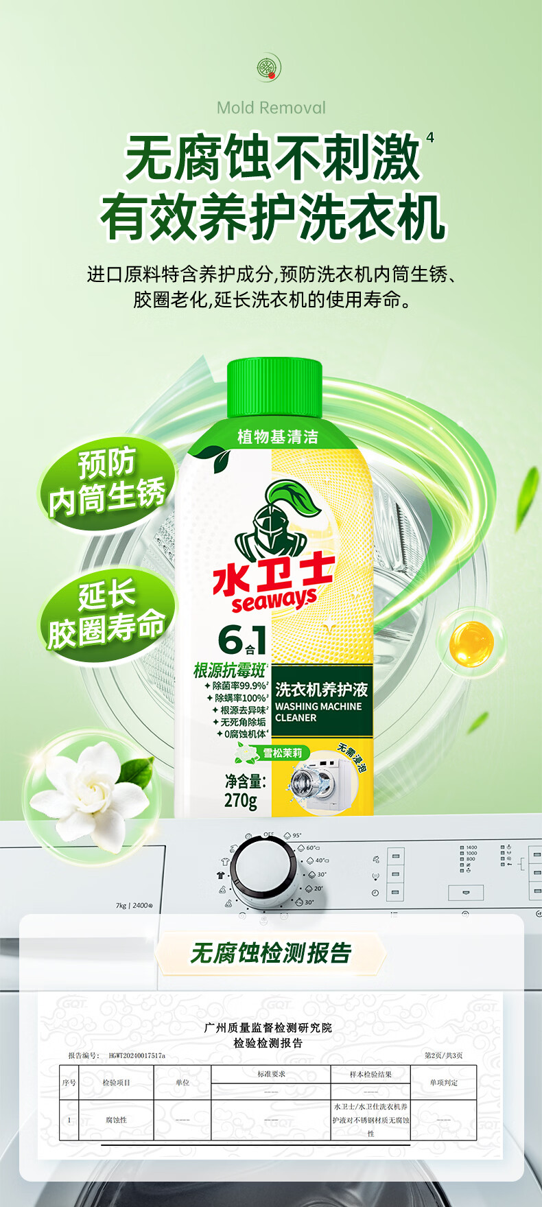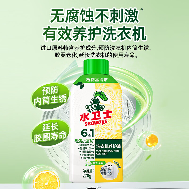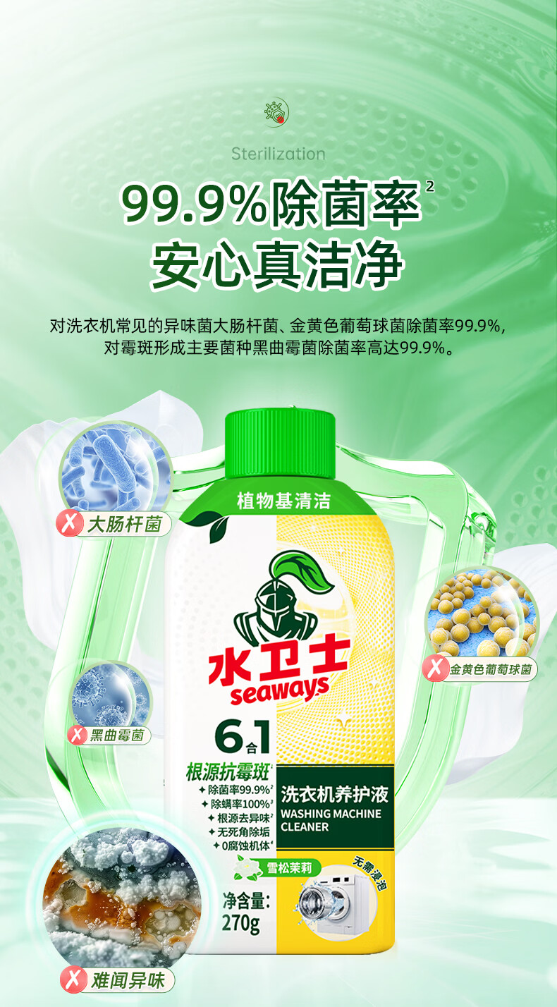 对洗衣机常见的异味菌除菌率高达99.9%;同时螨虫洗除率达100%,配方安全无腐蚀;水卫士洗衣机养护液,采用多重清洁因子专研配方