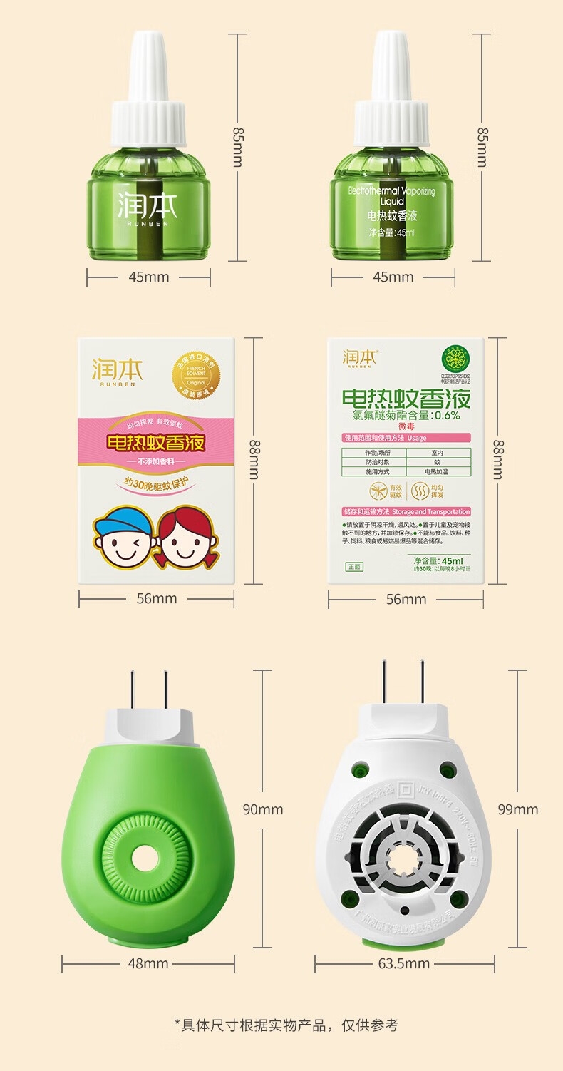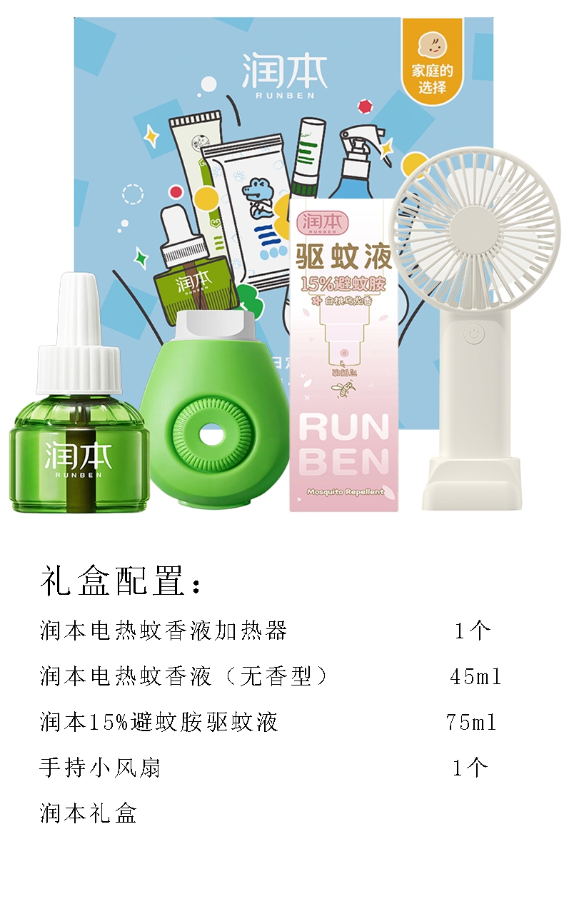 配置清单:润本电热蚊香液加热器 1个 润本电热蚊香液(无香型) 45ml 润本15%避蚊胺驱蚊液 75ml 手持小风扇 1个 润本礼盒 1个