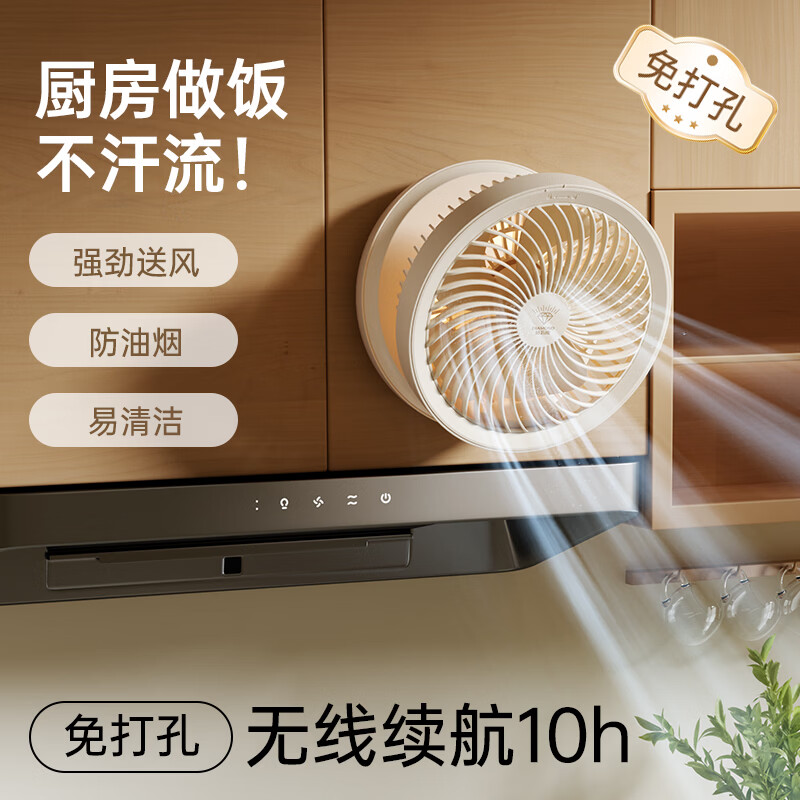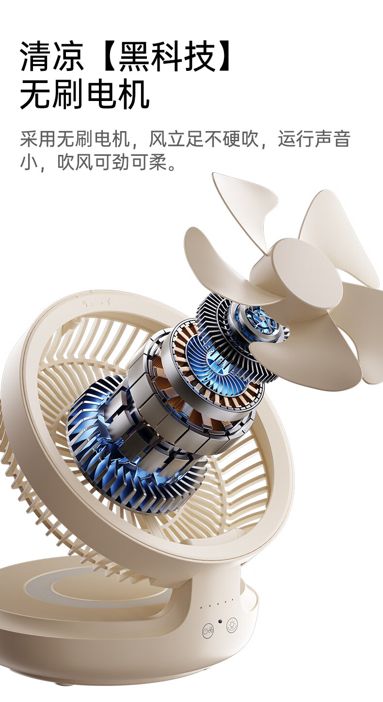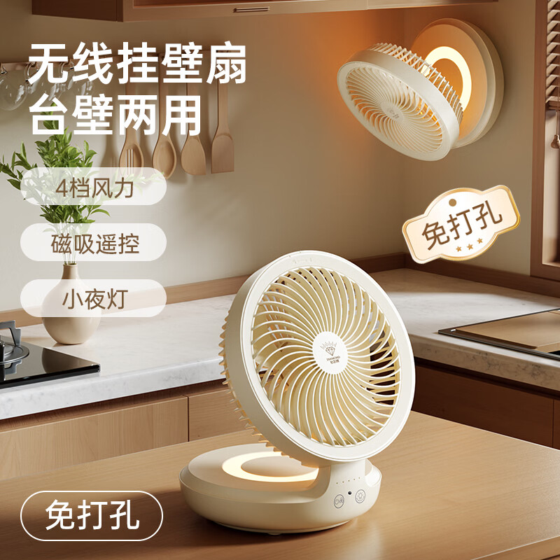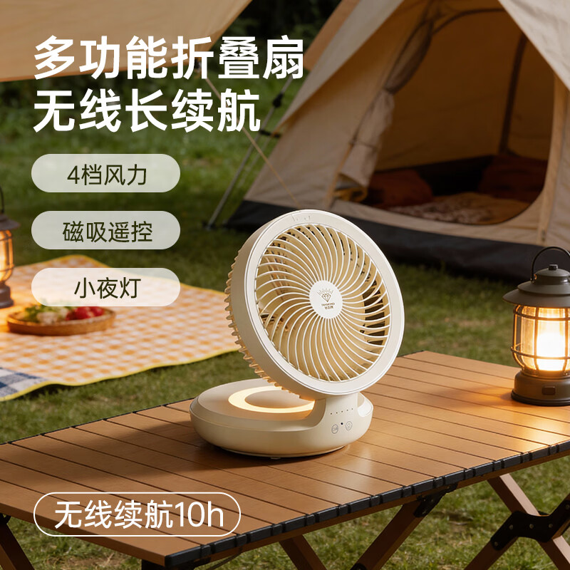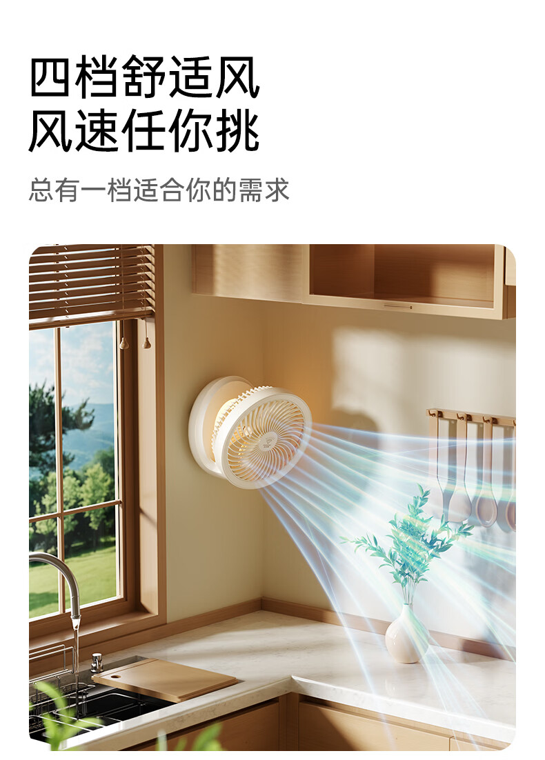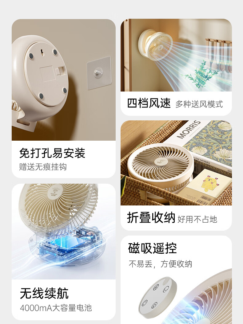 免打孔安装,折叠收纳;4000毫安电池,4档风速,任何地方都可用;磁吸遥控,无刷电机