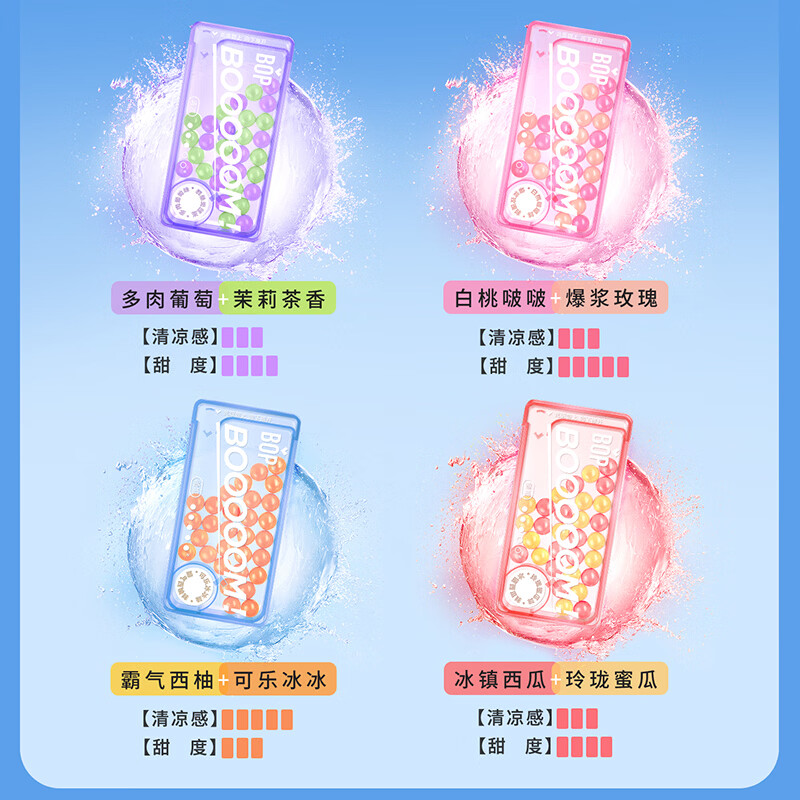 一咬即爆,立感清新;无需咀嚼,告别咬肌;0蔗糖,好吃不长胖