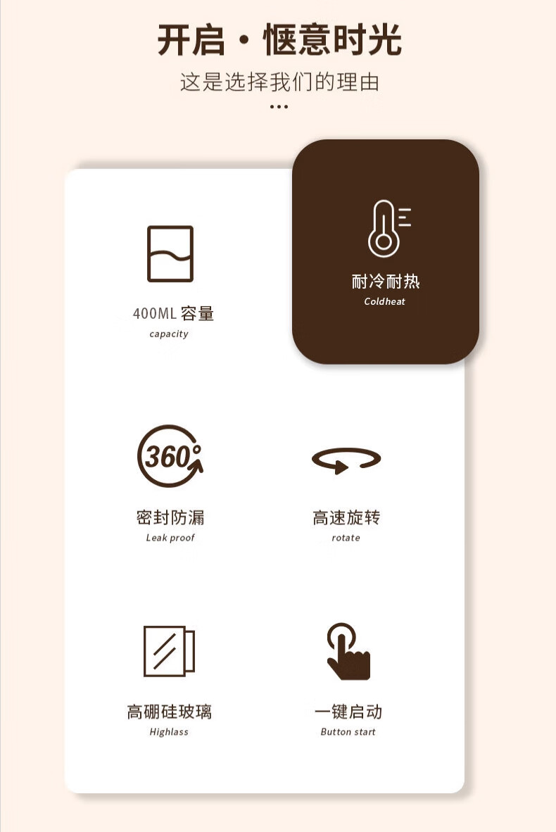 耐冷耐热、密封防漏;高速旋转、一键启动;食品级PP材质、加厚高硼玻璃