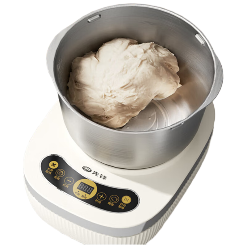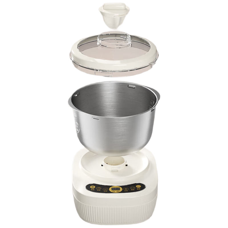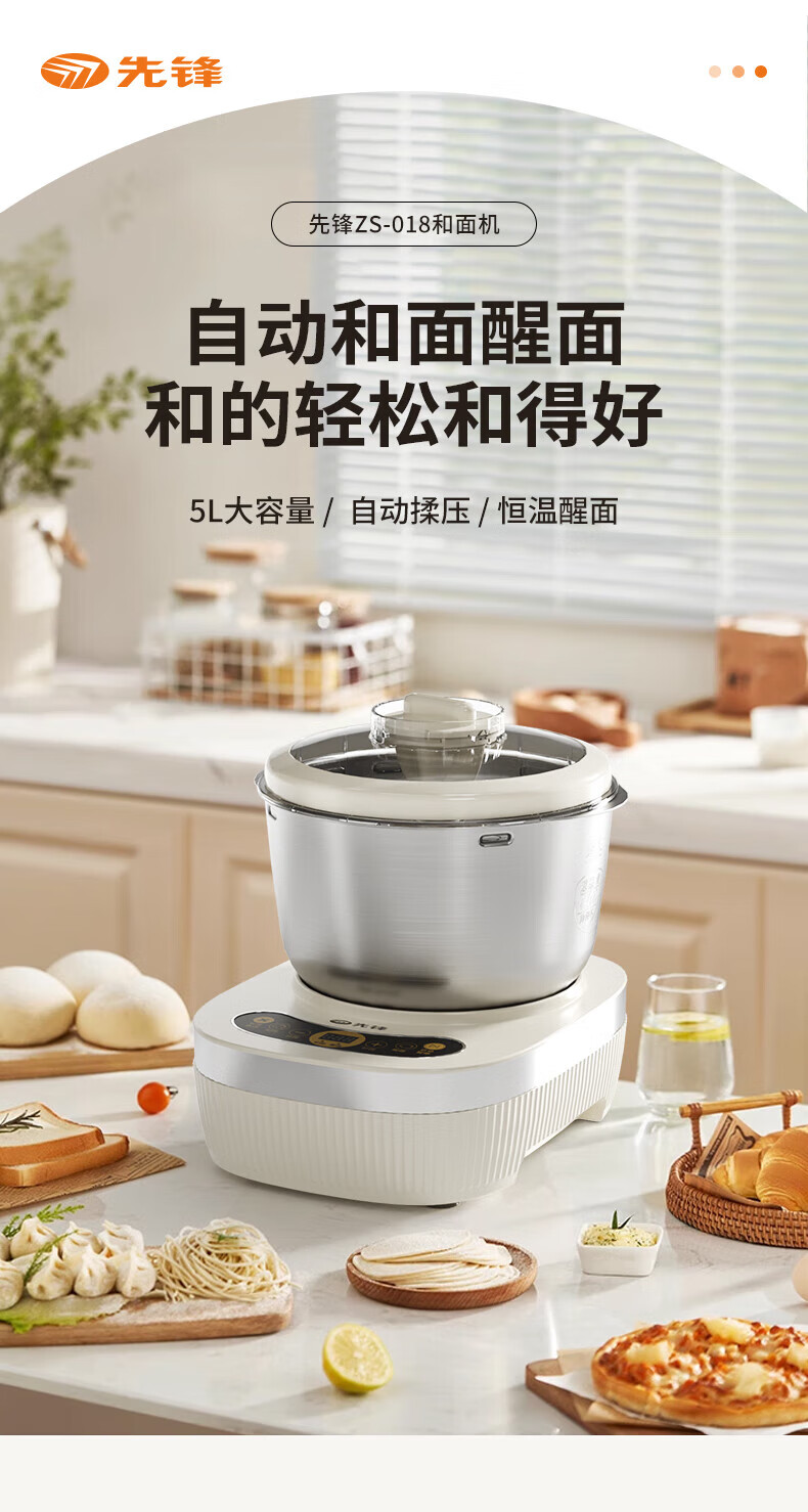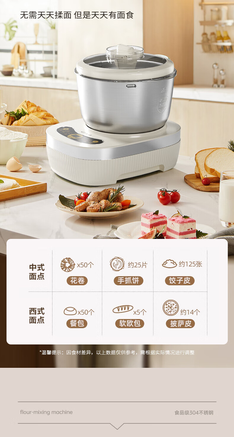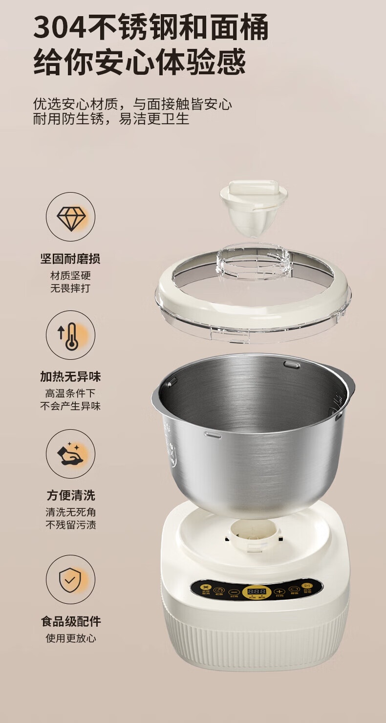 智能触控操作、轻触快速和面;可视双盖设计,途加料更方便;5L家宴大容量一次可和1~5斤面团