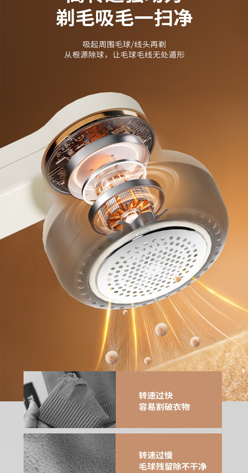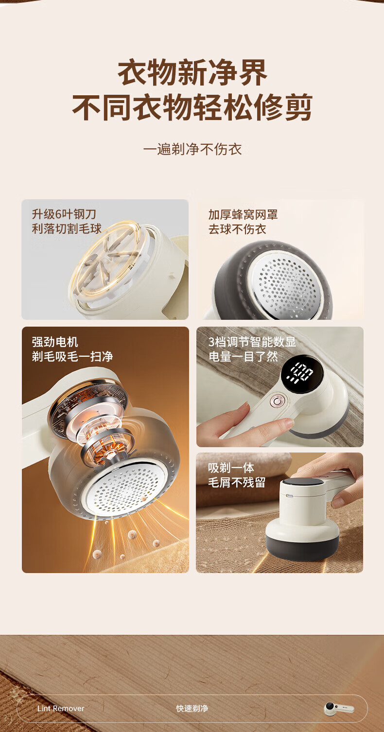 先吸再剃,让毛球无所遁形;轻松去球,自带衣物护理属性;三档调节,搞定各类面料衣物,加大面积网罩,开启剃毛