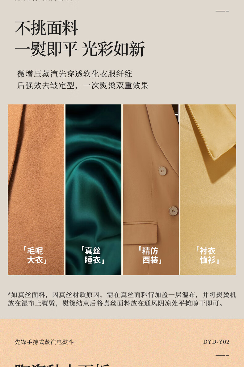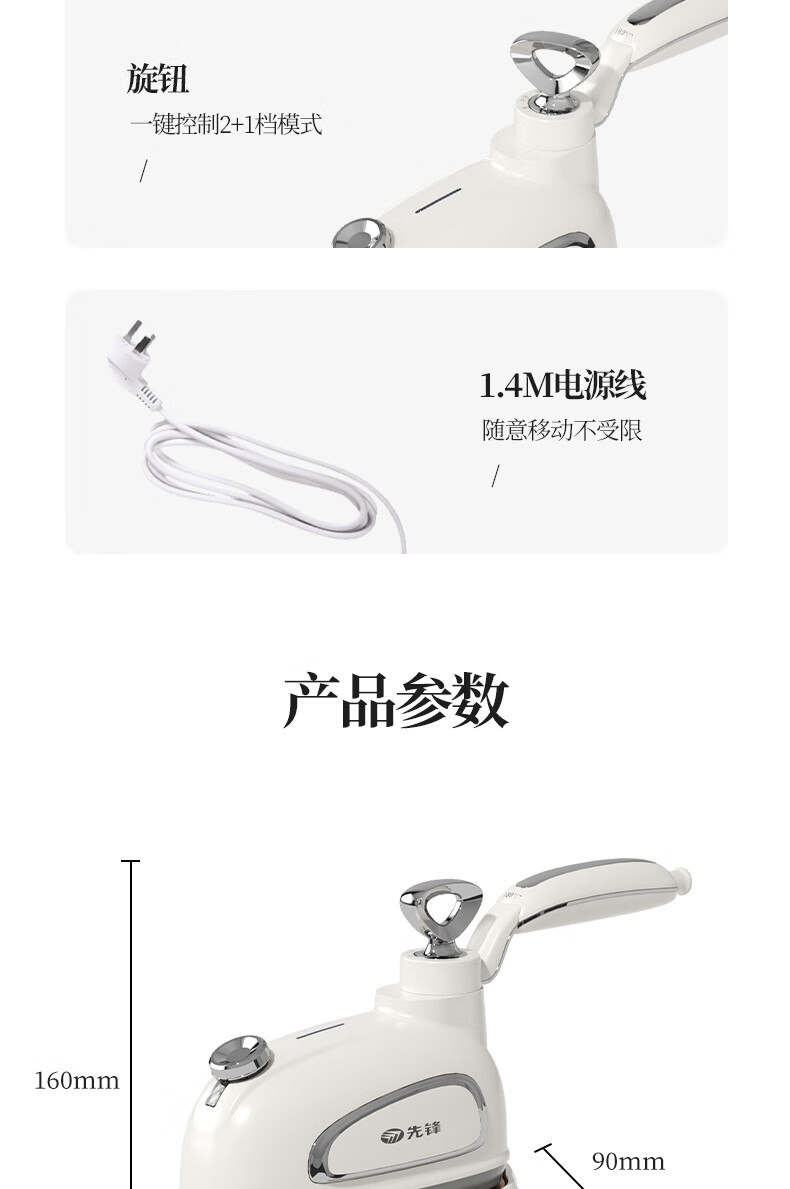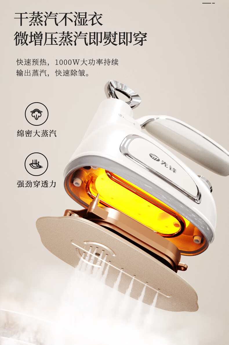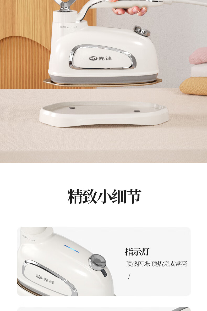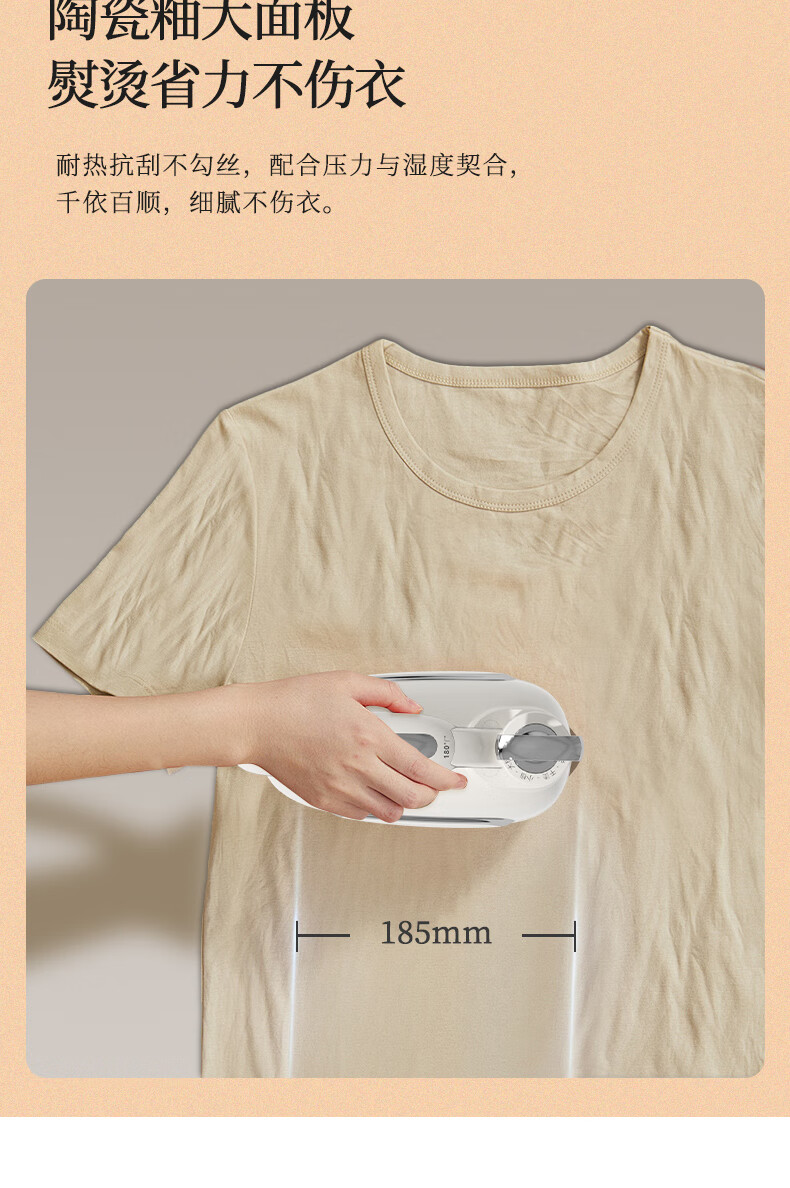 陶瓷底板,熨烫更顺滑,更耐磨 二档蒸汽,熨烫更随;180旋转手柄,前进后退更方便 干烫;大小蒸汽,多种选择