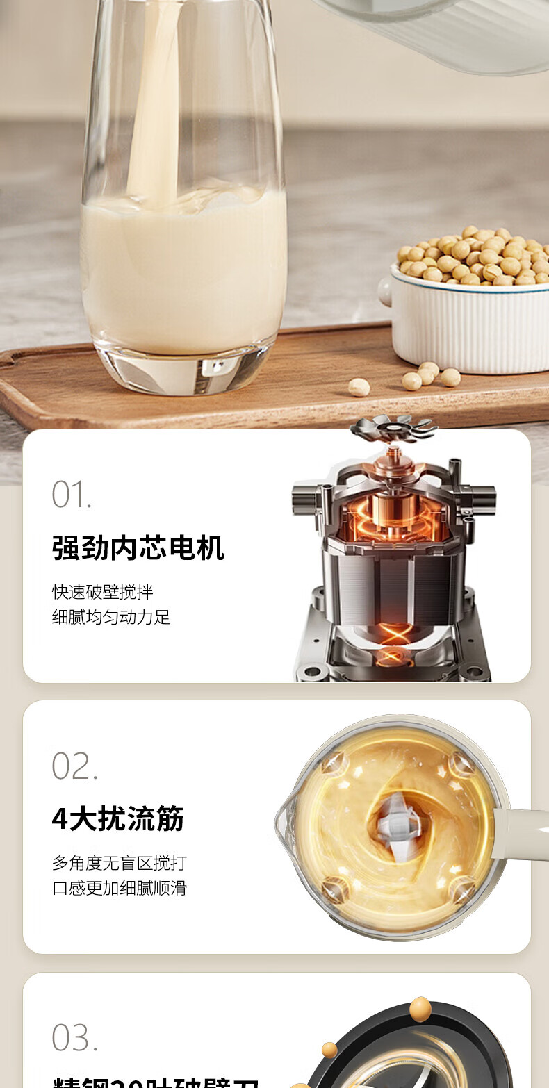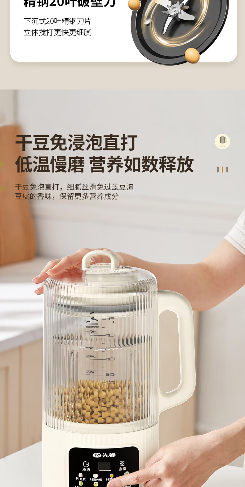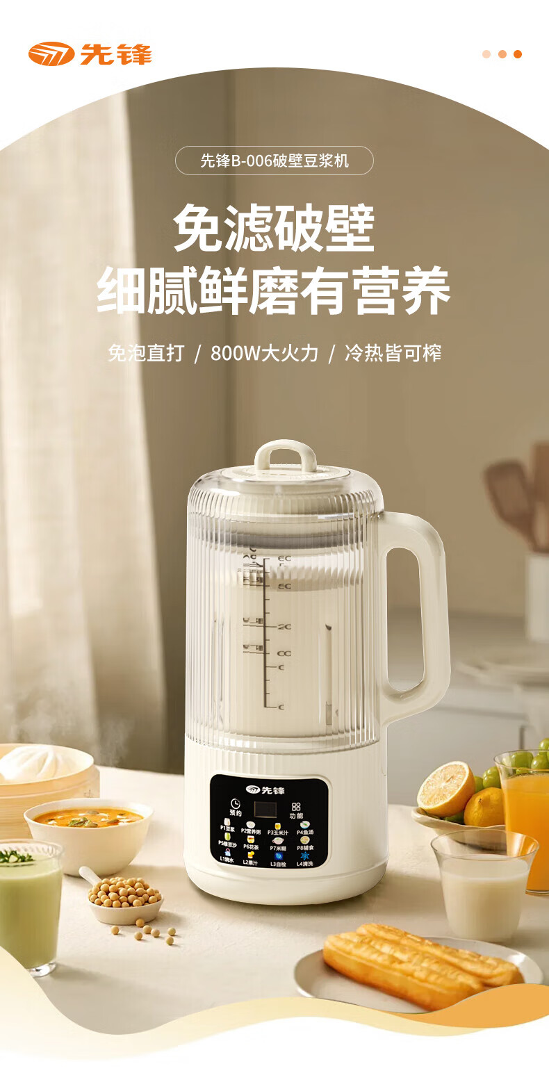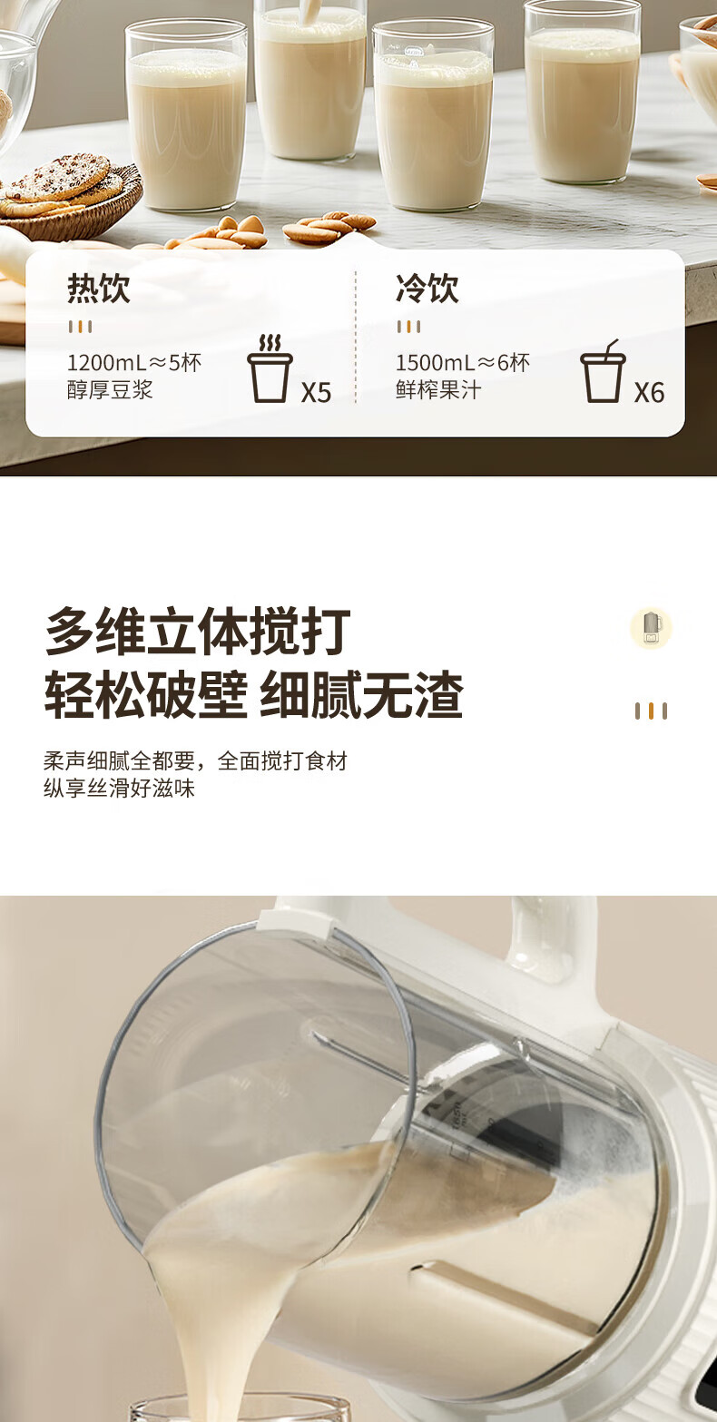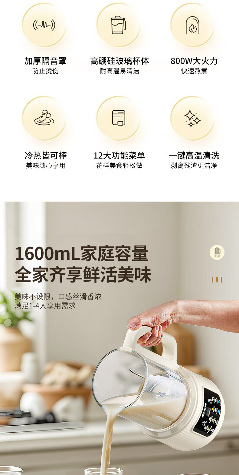 1600mL家庭容量全家齐享鲜活美味 免滤破壁细腻;800W大火熬煮香浓四溢、丝滑入喉;升级不粘底盘不粘不糊、轻松清洗