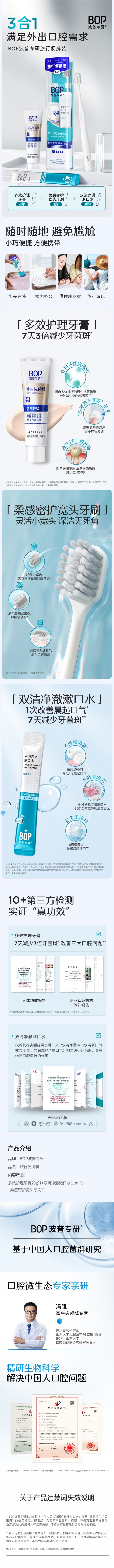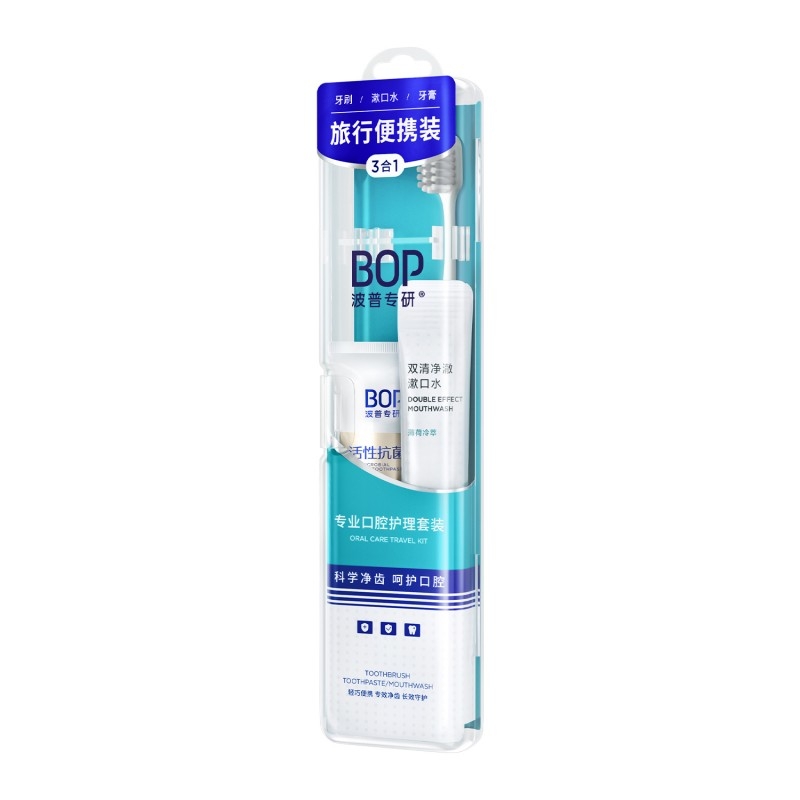 配置清单:BOP波普专研柔感密护宽头牙刷*1、BOP波普专研多效护理牙膏20g*1、BOP波普专研双清净澈漱口水薄荷冷萃11ml*1