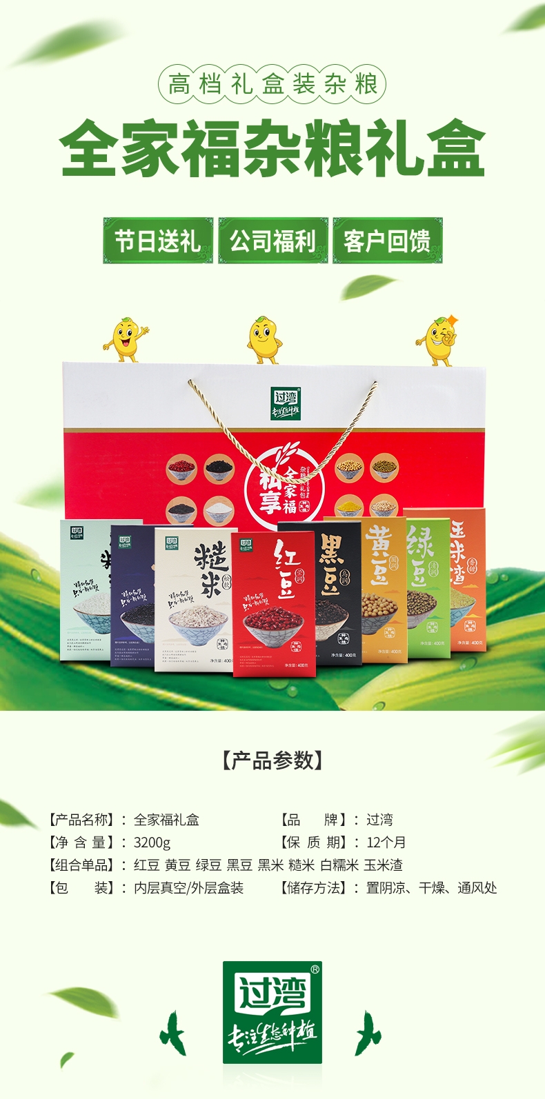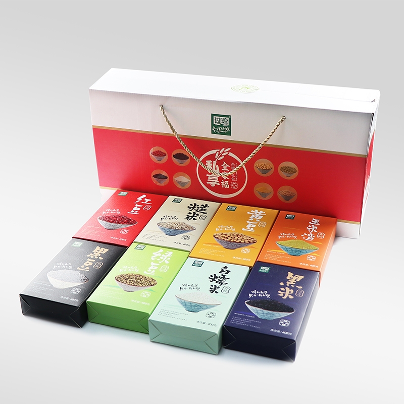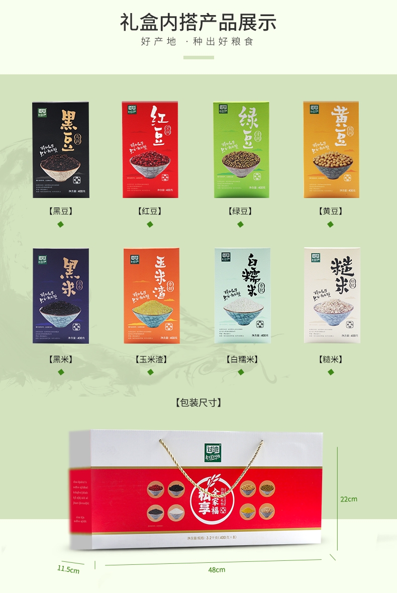 配置清单:过湾全家福空礼盒+红豆400g*1+绿豆400g*1+ 黄豆400g*1+黑豆400g*1+黑米400g*1+糙米400g*1 + 玉米渣400g*1 + 白糯米400g*1