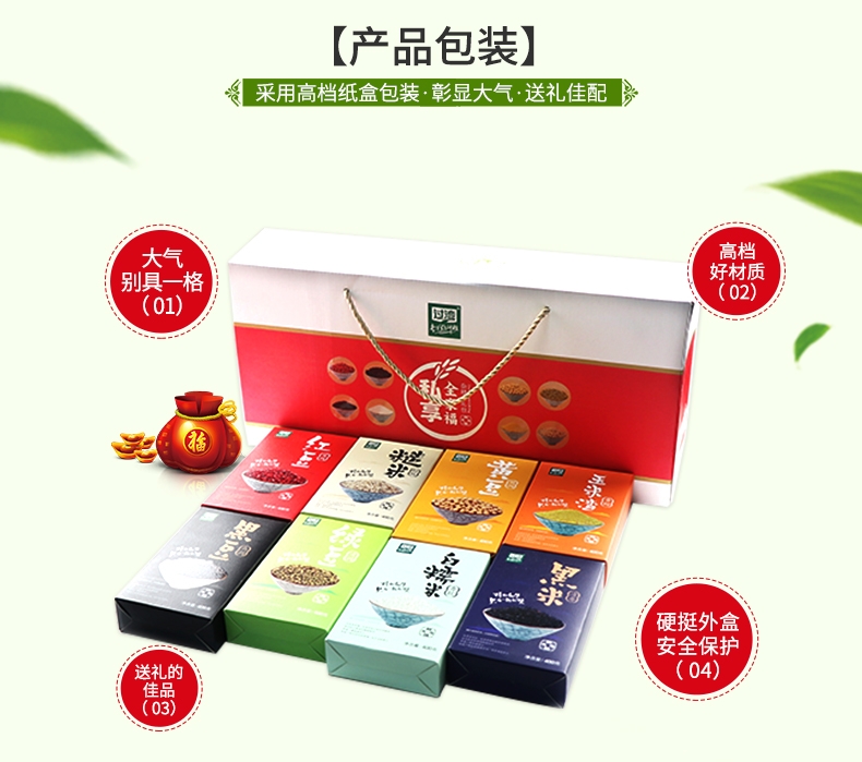 8种精选杂粮科学搭配,营养全面,满足全家膳食需求;独立小盒分装,防潮保鲜,取用便捷,烹饪更省心;安徽老字号品质礼盒,体面大气,自用送礼两相宜