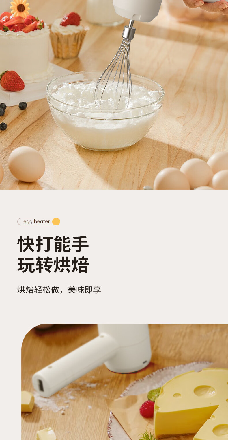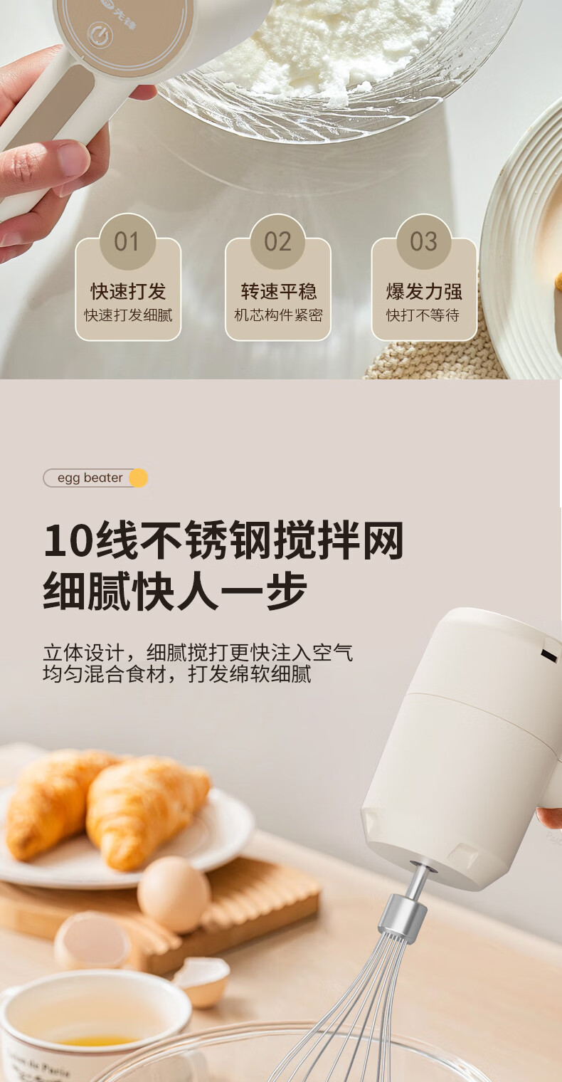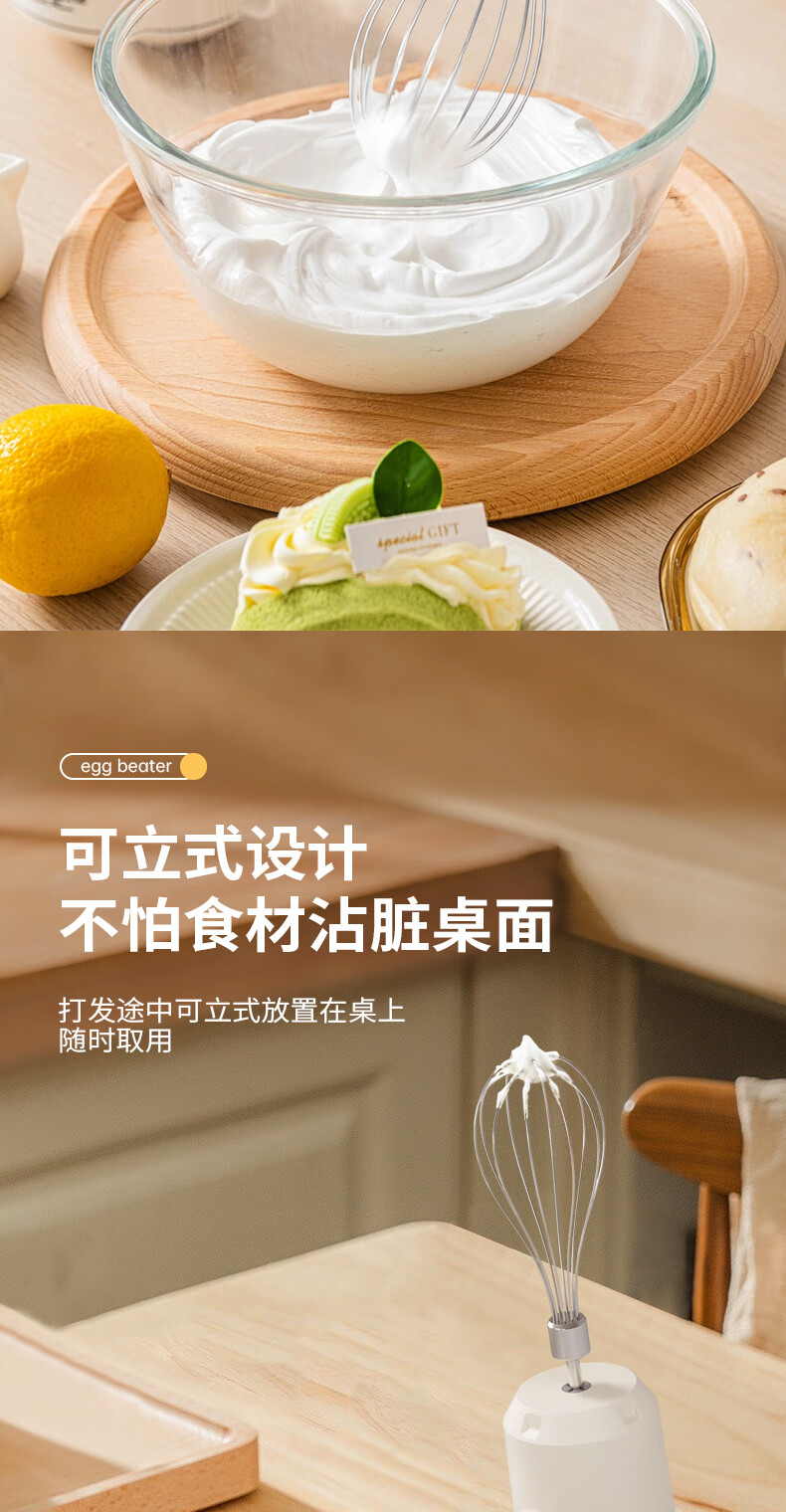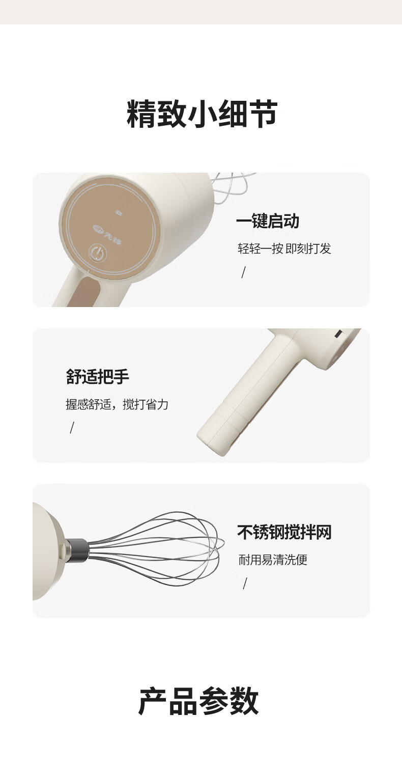 轻松打发的乐趣省去繁琐程序;不占空间纤细身形好收纳;一键开机即刻打发大动力电机快速打发没难度