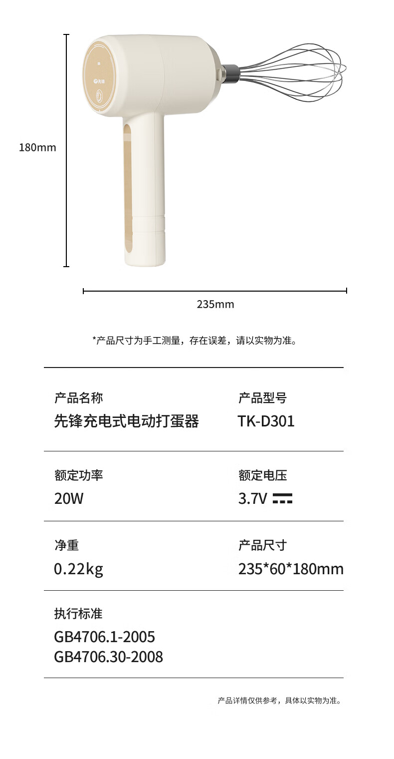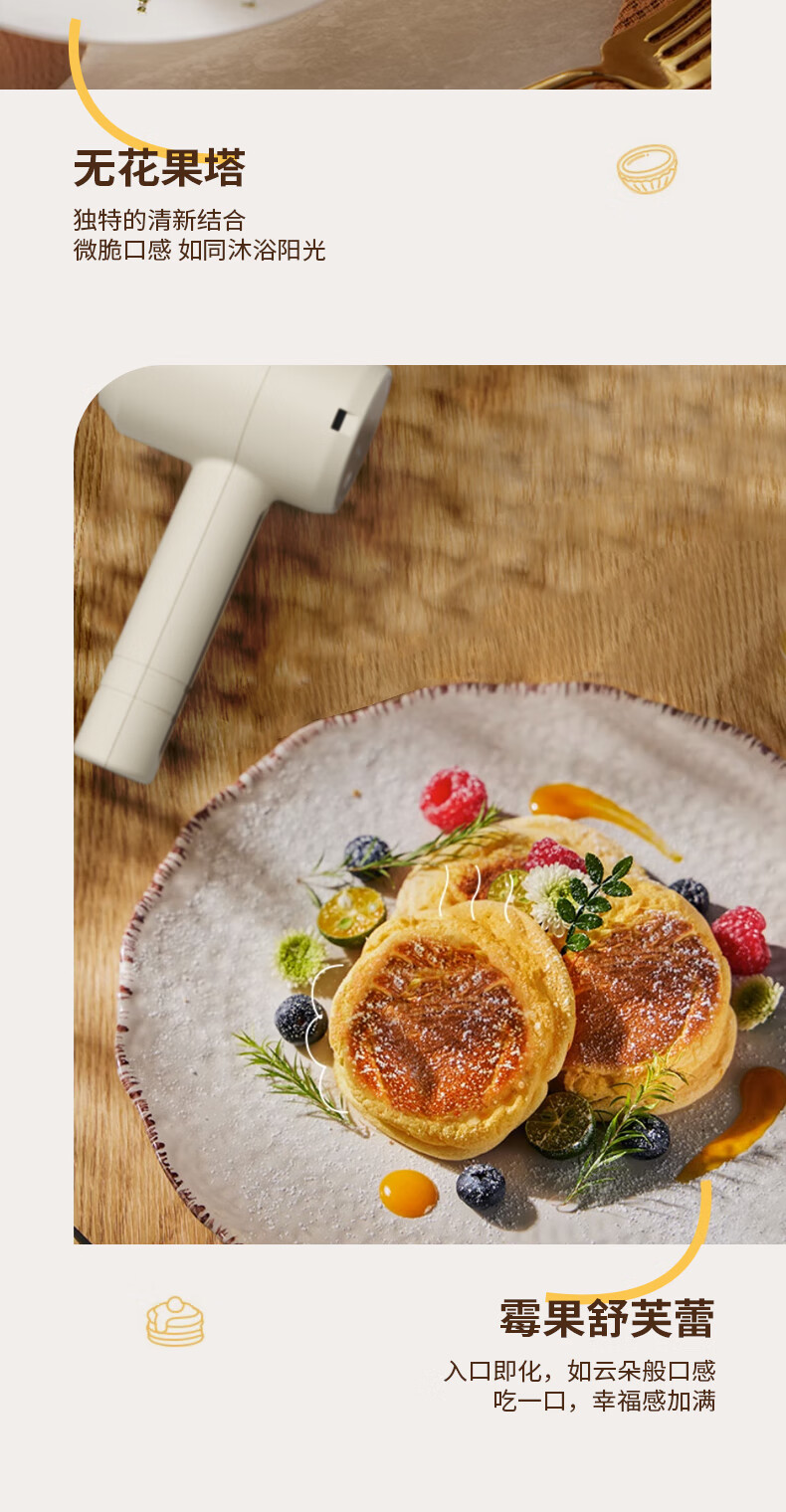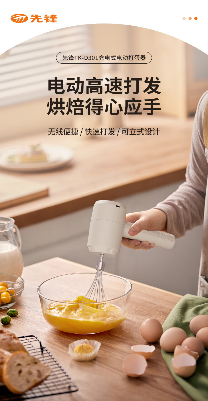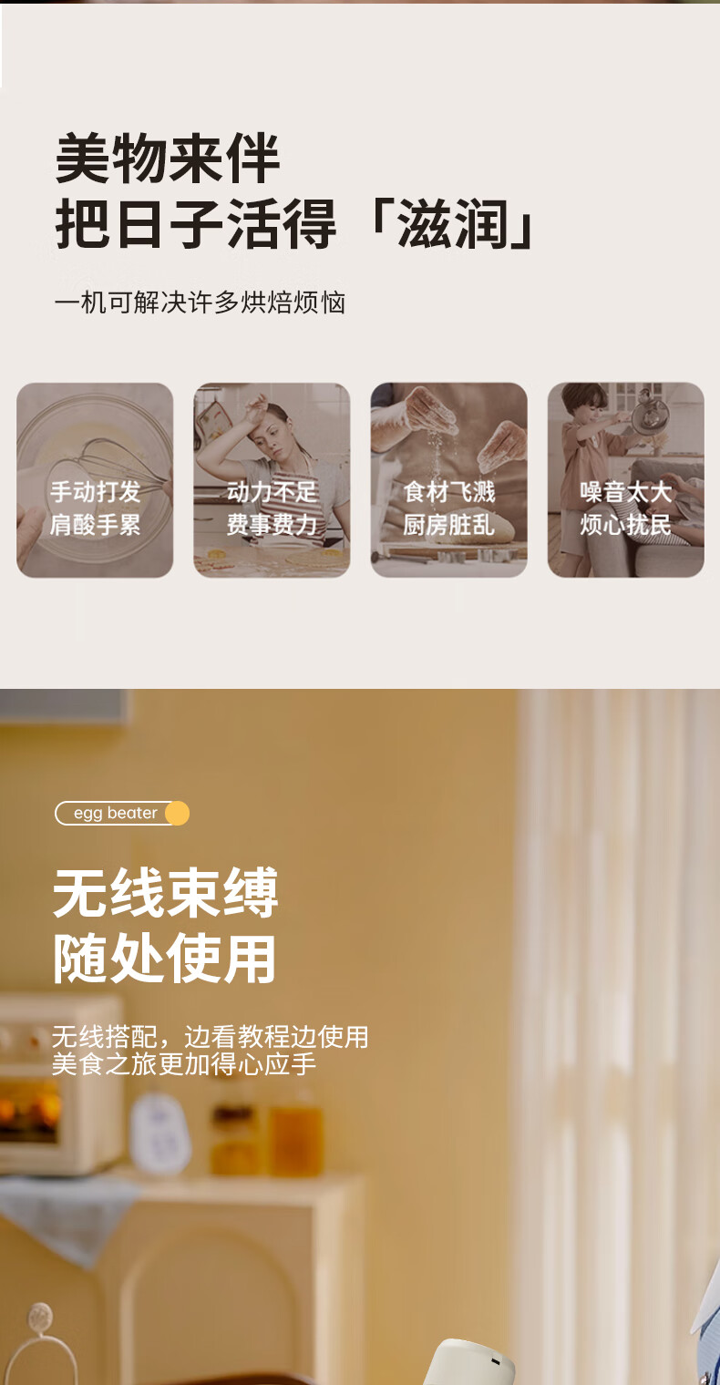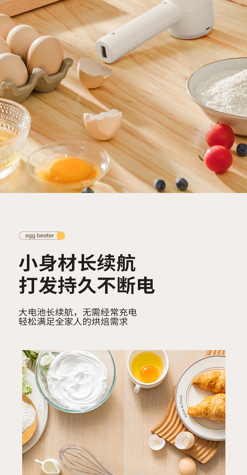 轻松打发的乐趣省去繁琐程序;不占空间纤细身形好收纳;一键开机即刻打发大动力电机快速打发没难度