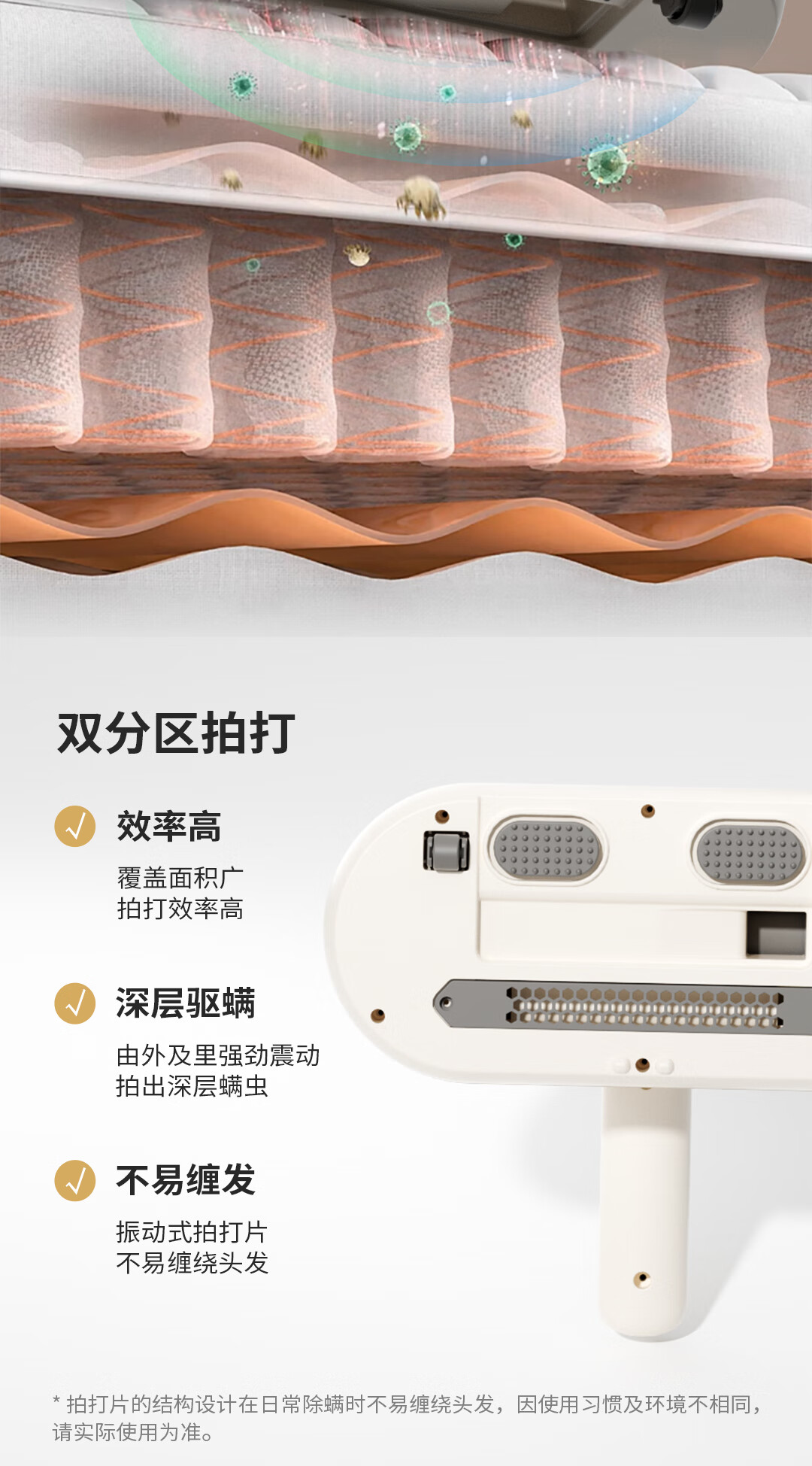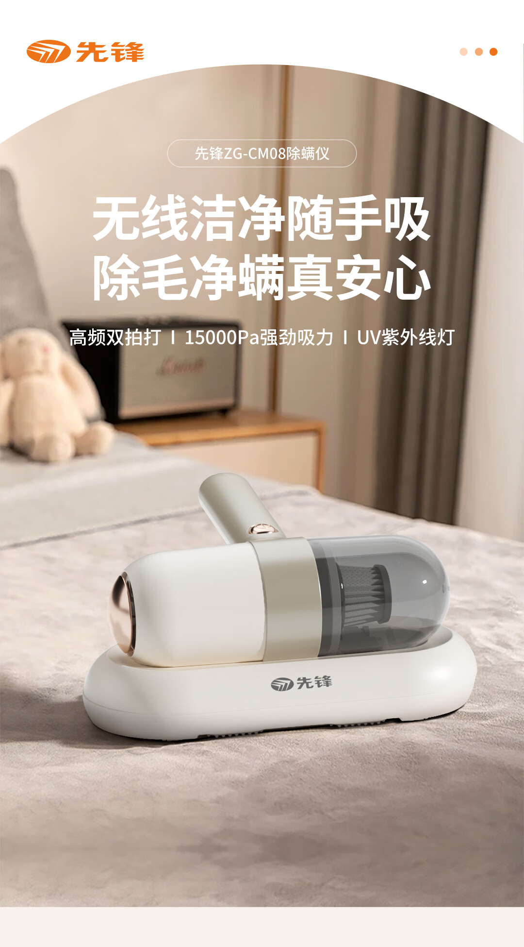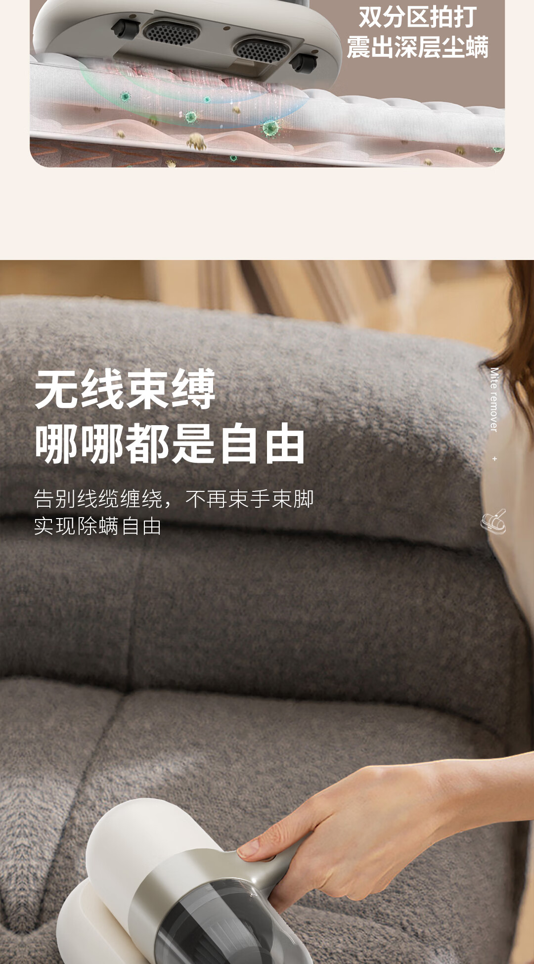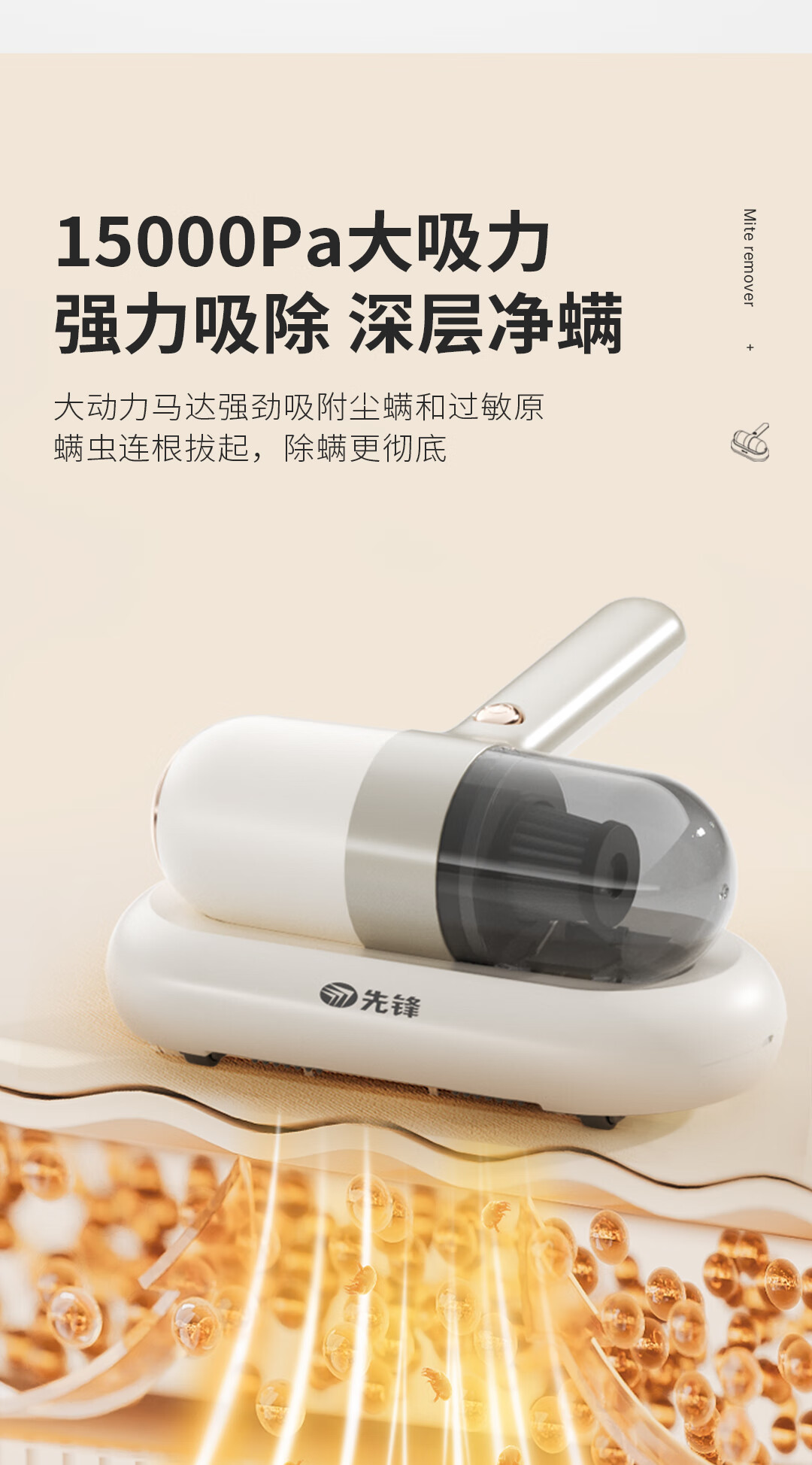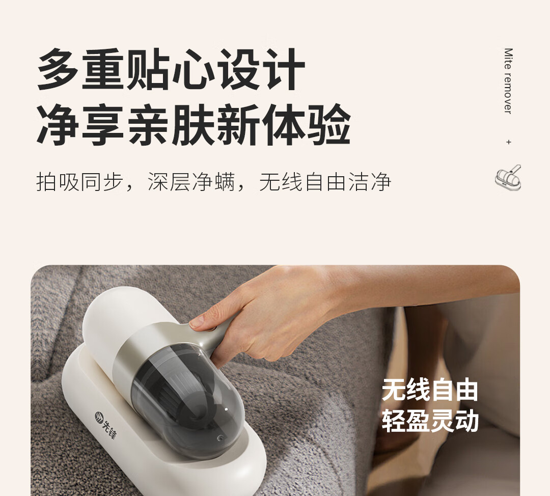 10000pa大吸力强力吸除、不留尘螨;高频次拍打床褥深层尘螨轻松震出;3000mAh容量一次充电、全屋清洁、无线自由