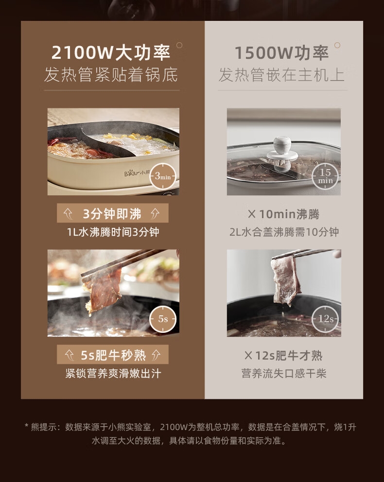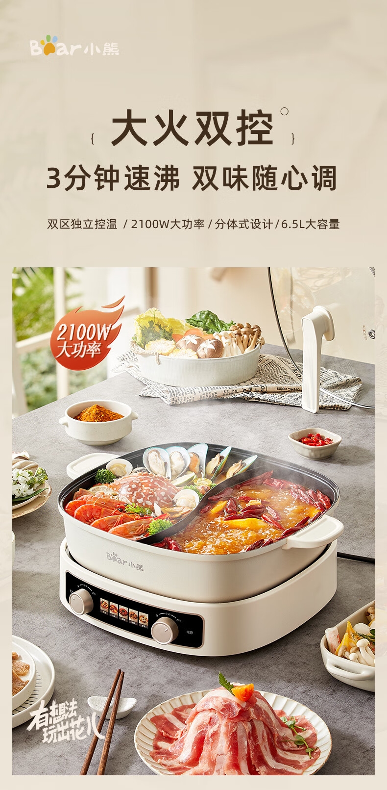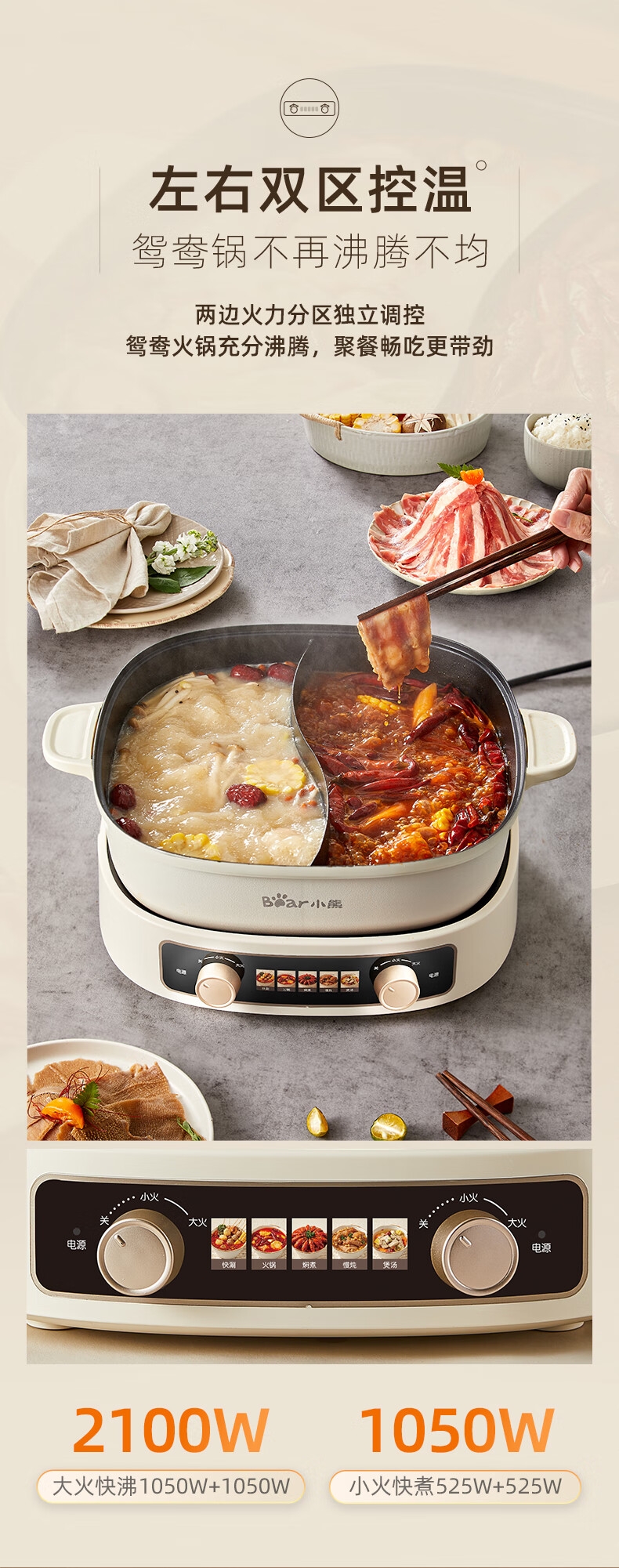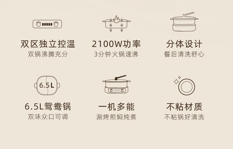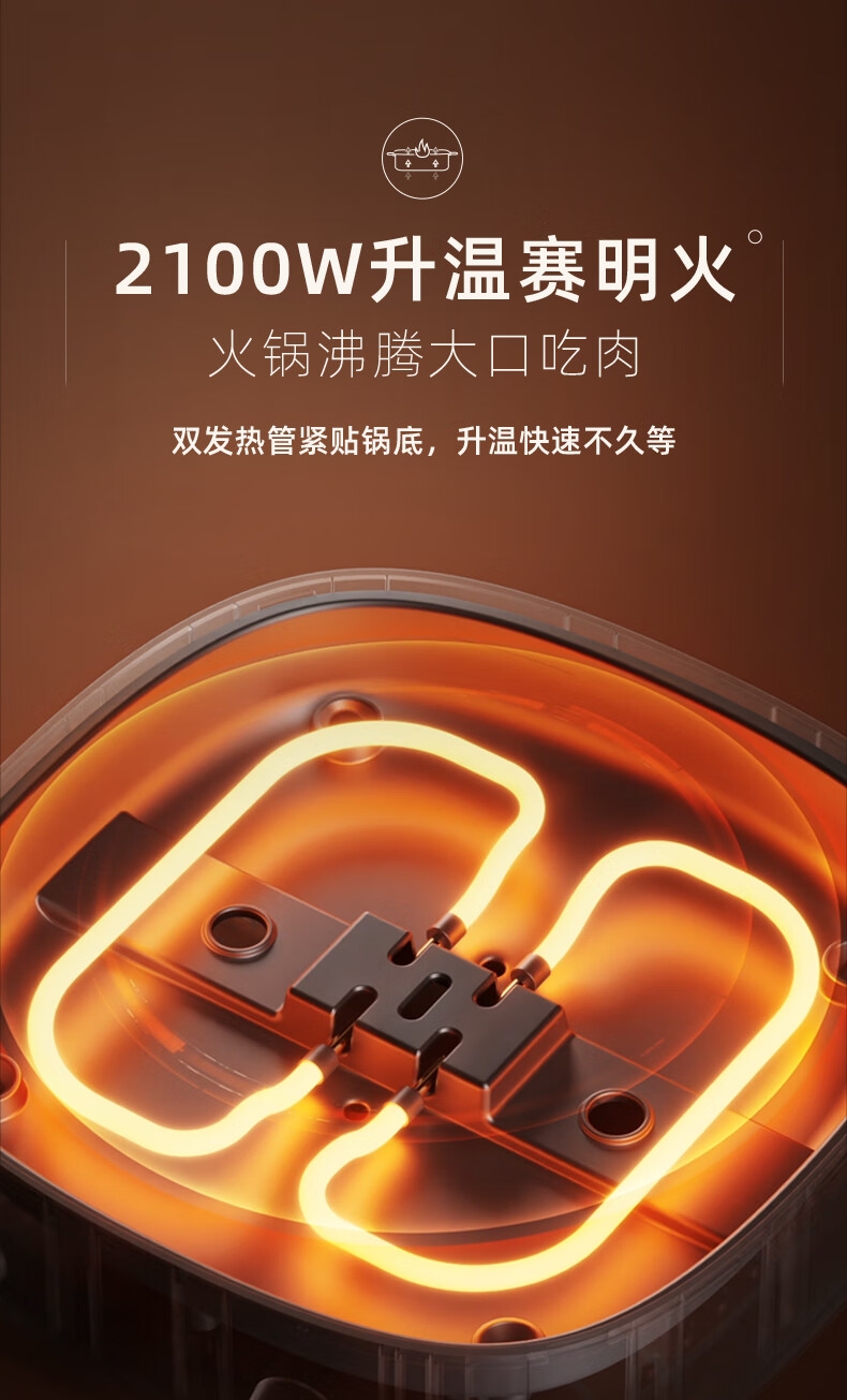 2100W速热;左右独立操控分区控温;可立式锅盖