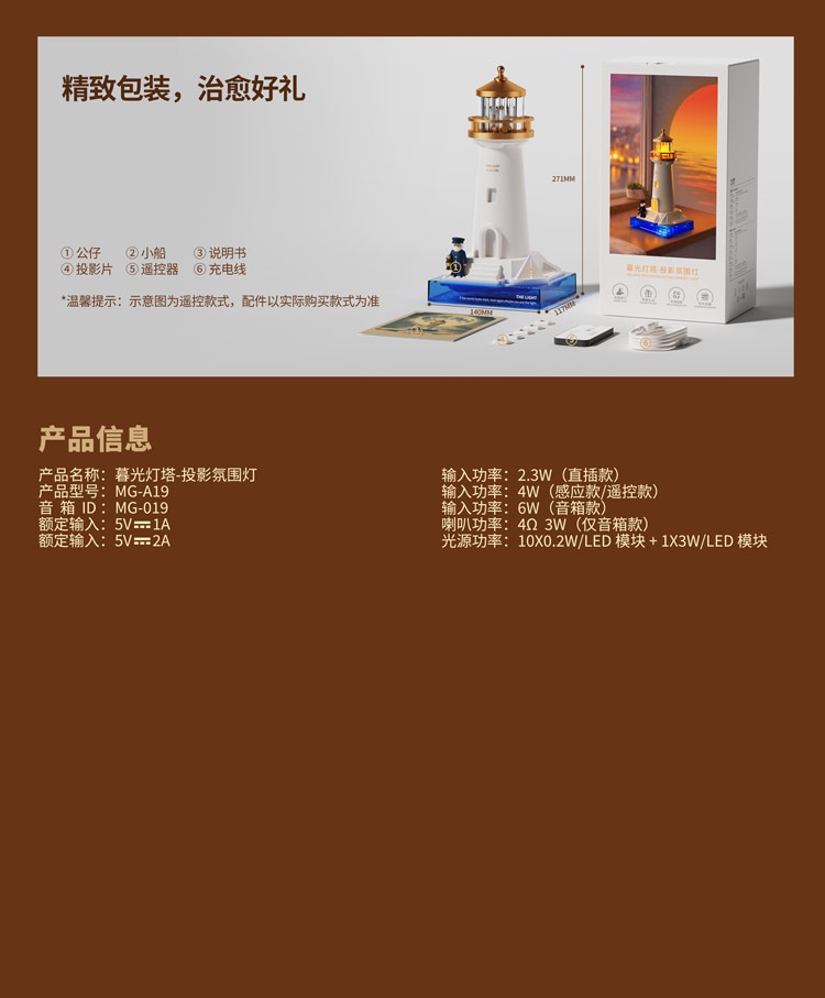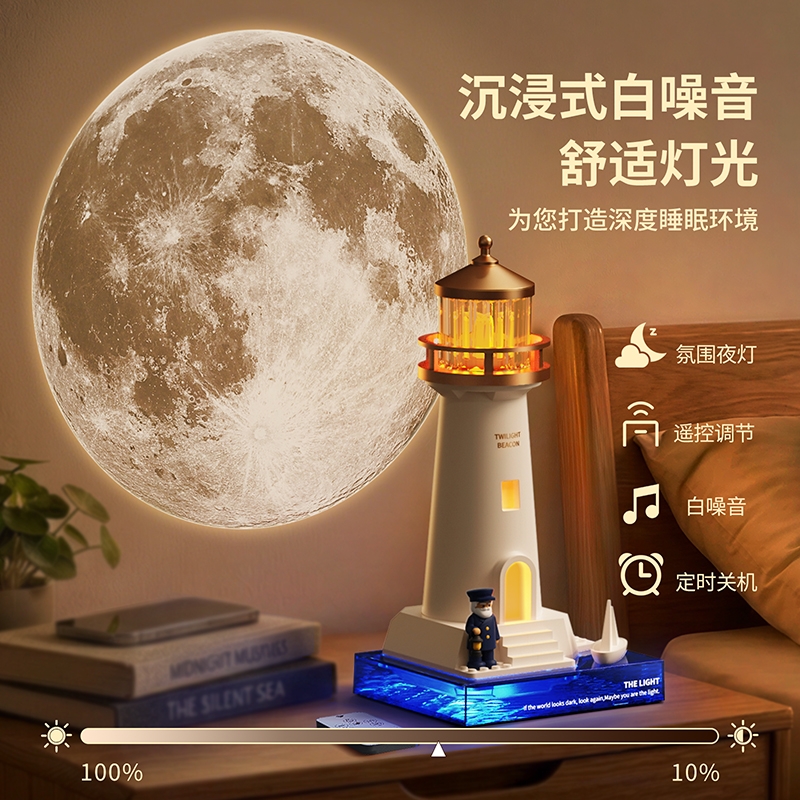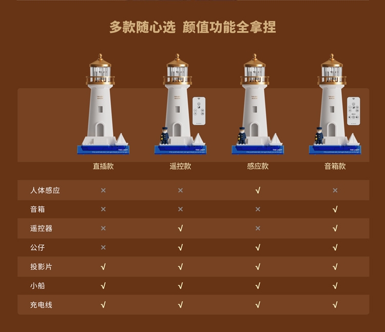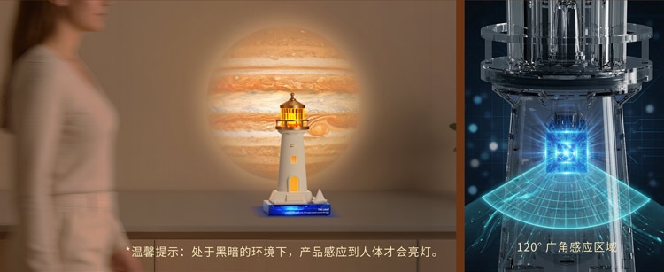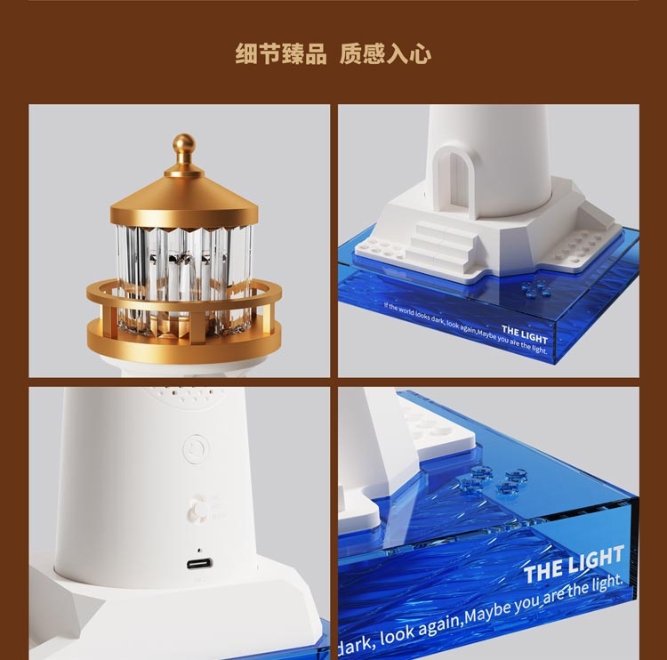 复古灯塔造型,细节质感拉满;灯塔造型暖黄灯光,柔和不刺眼;无线充电 / 电池供电,摆脱线材束缚,多场景可用