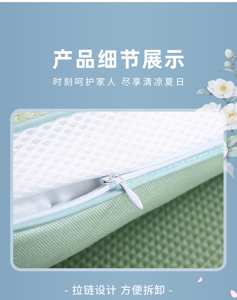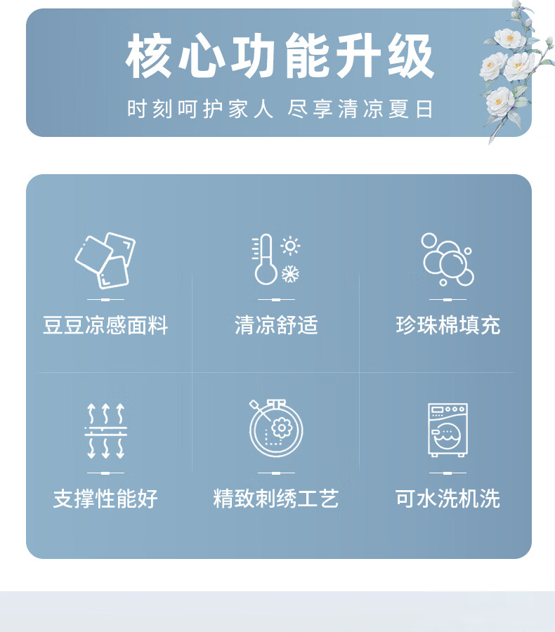 创新豆豆凉感面料,接触瞬间体感降温;珍珠棉填充,支撑性能好,填充优质珍珠棉;蓬松度高、回弹性好,能够提供均匀支撑