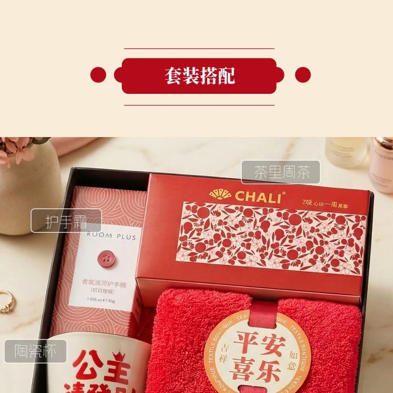 组合:茶里一周茶2g*7袋、公主请发财主人杯*1、平安喜乐毛巾75*34cm*1、ROOM PLUS 香氛护手霜30g*1