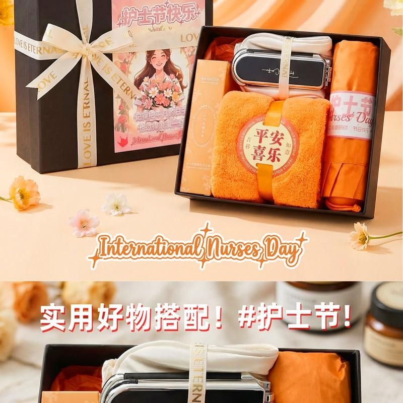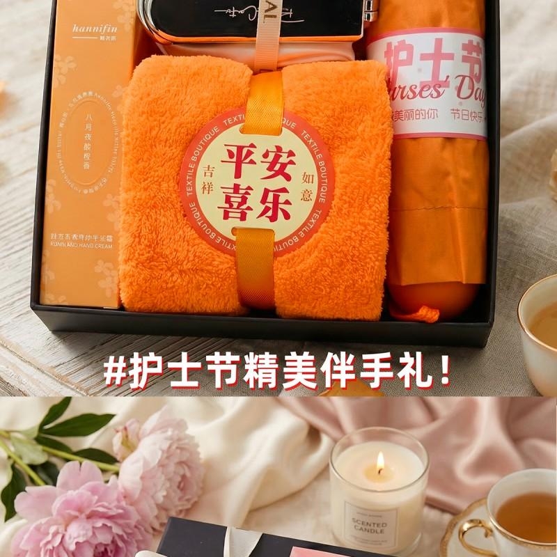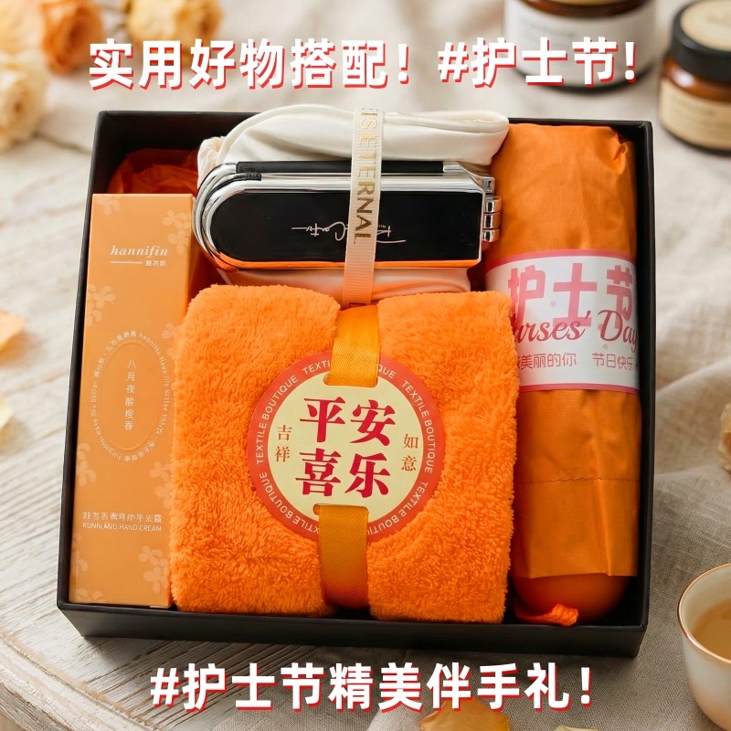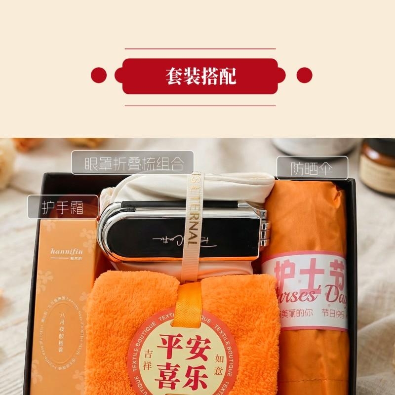 组合:胶囊防晒伞*1 平安喜乐毛巾75*34cm*1、韩方莉香氛护手霜50g*1、眼罩+镜子气囊头梳组合*1