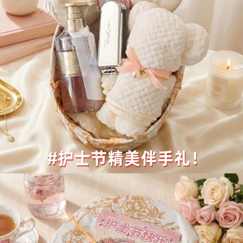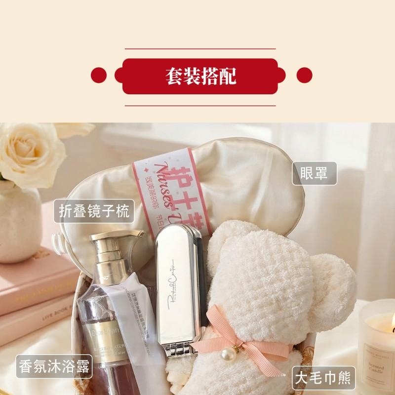 组合:眼罩*1、镜子气囊头梳*1、独特艾琳香氛沐浴露250ML*1、菠萝格纹理创意小熊毛巾75*34CM*1