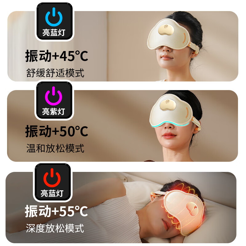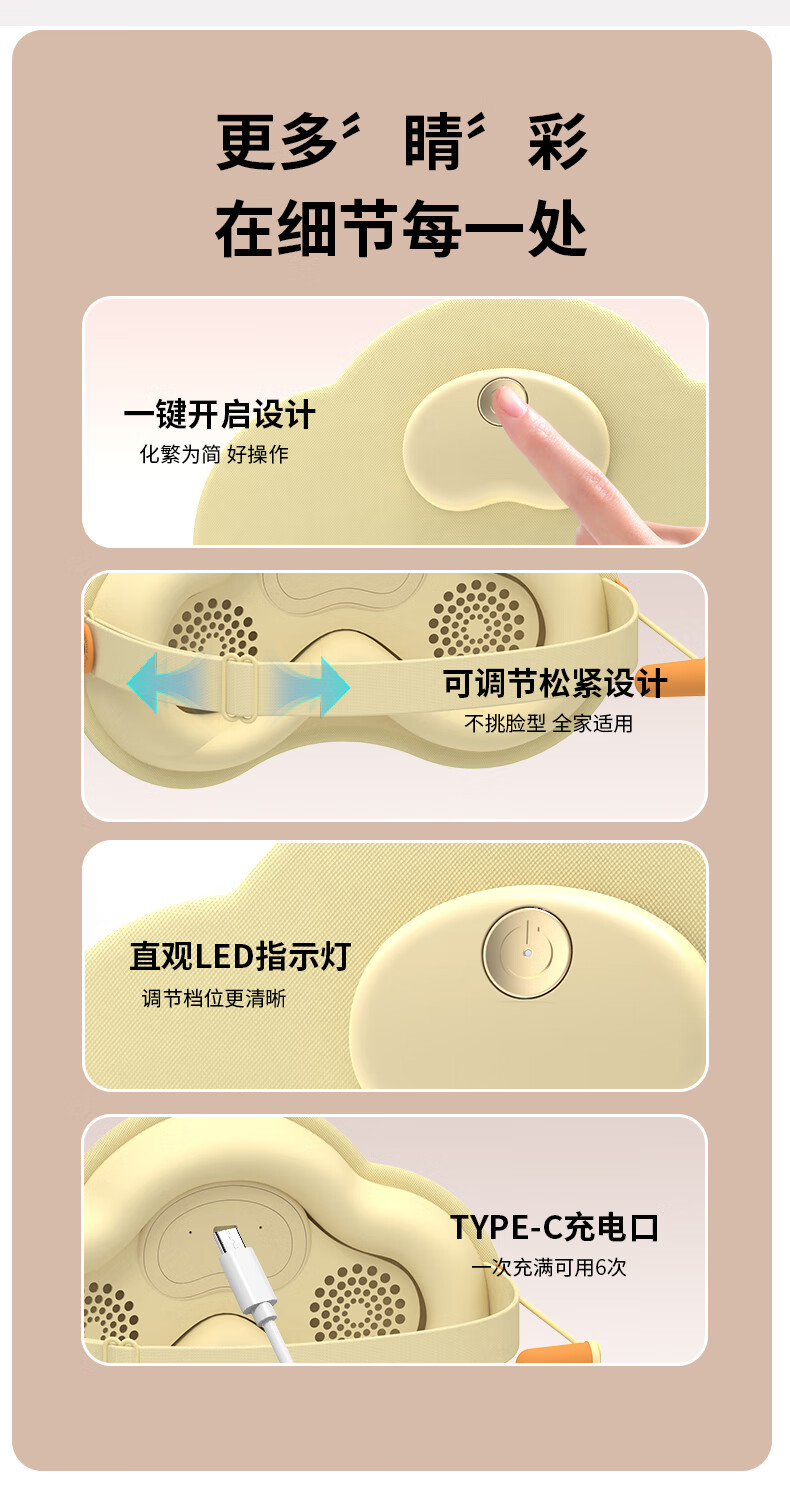 升级热敷放松,三档恒温热敷+振动按摩,智能恒温;W型贴合鼻翼,更加贴合人脸:6D鼻翼设计,佩戴更加;丝滑无痕,柔软面料:奶油般软糯触感,精选面料柔软