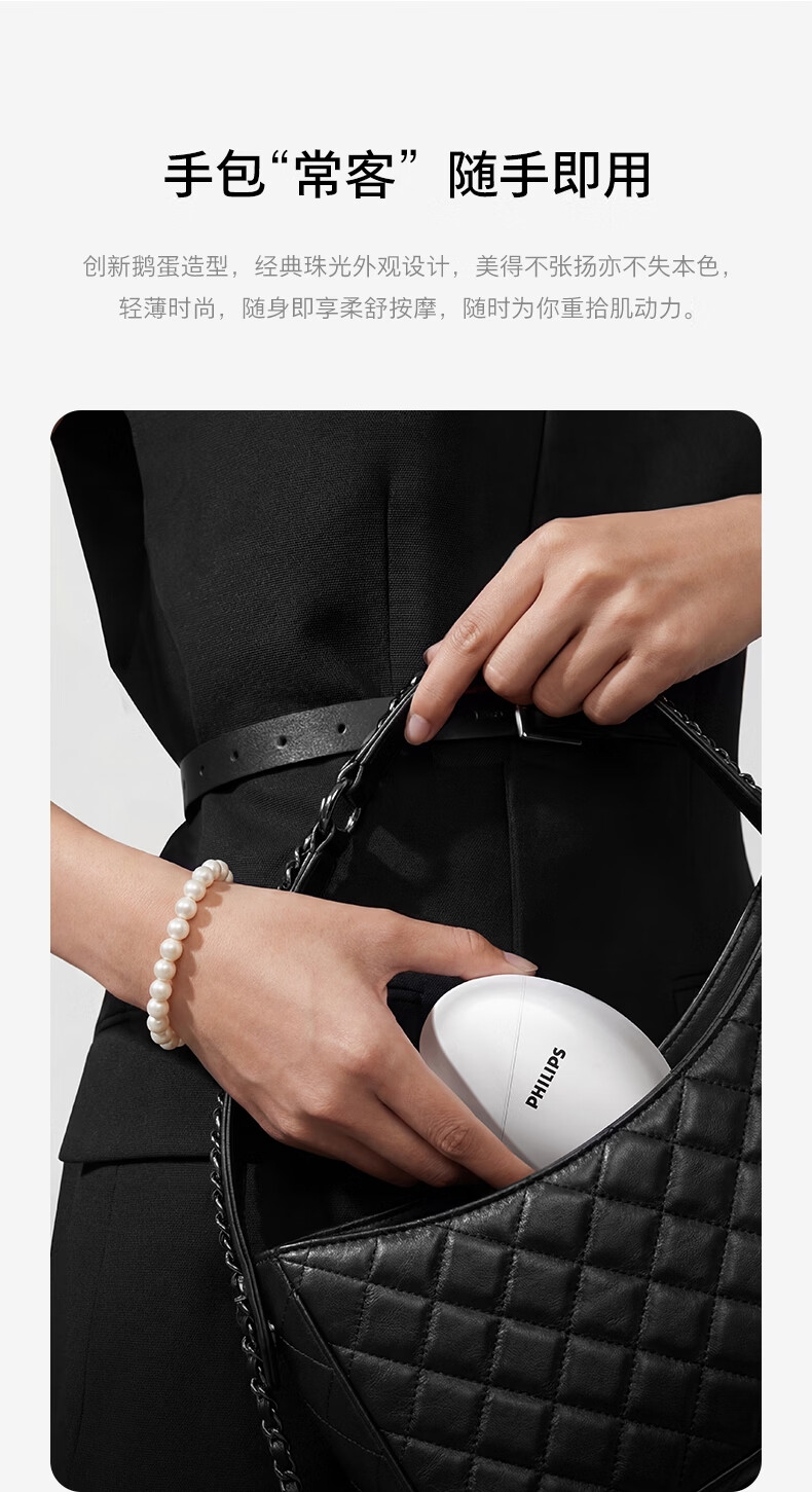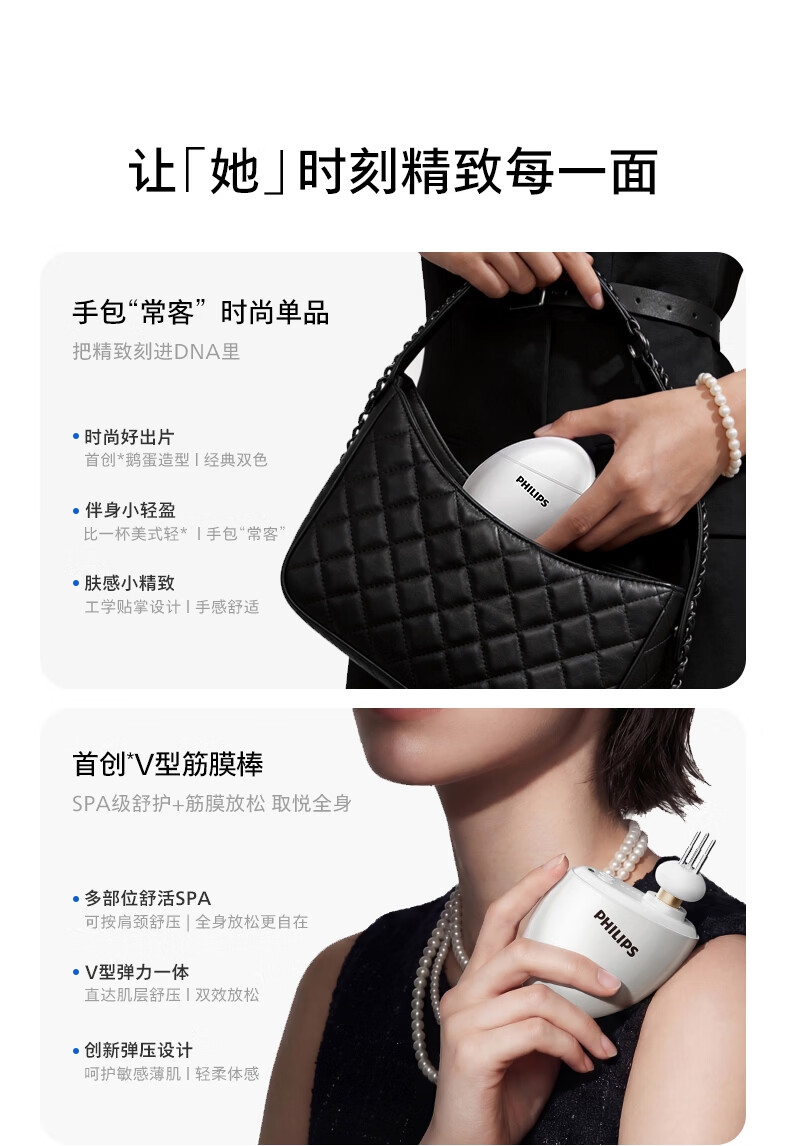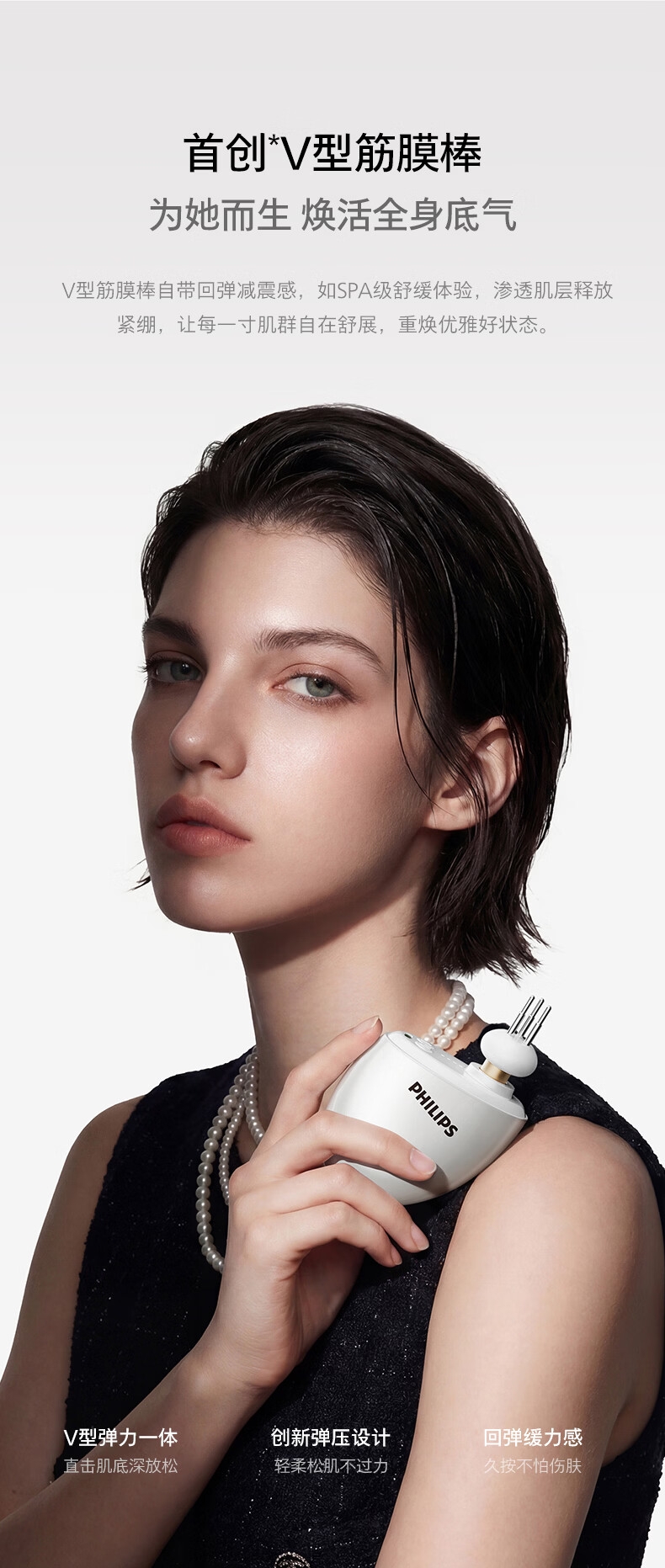 首创V型筋膜棒;强劲振感,直透筋膜更解压;创新鹅蛋造型,经典珠光外观设计