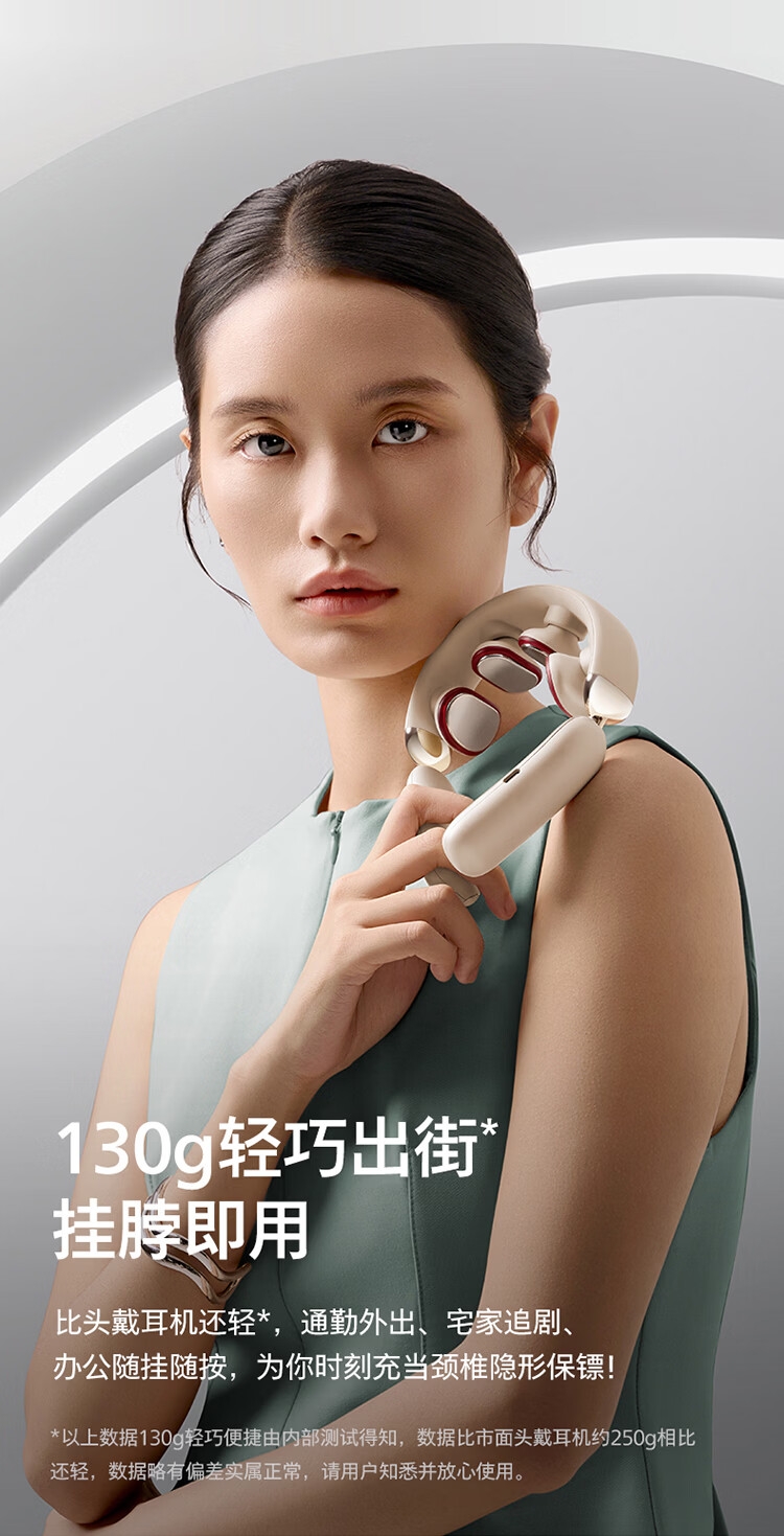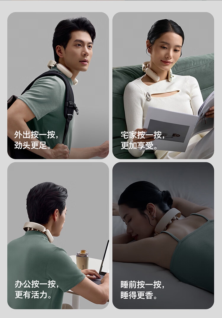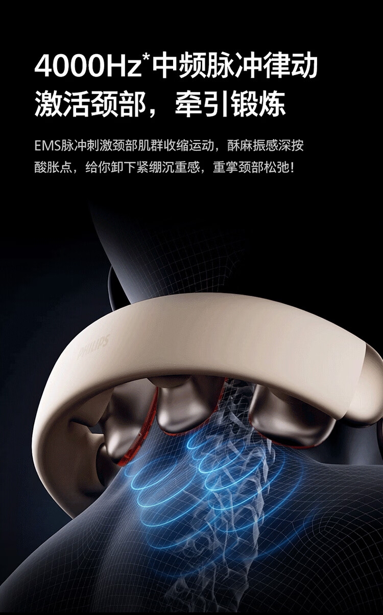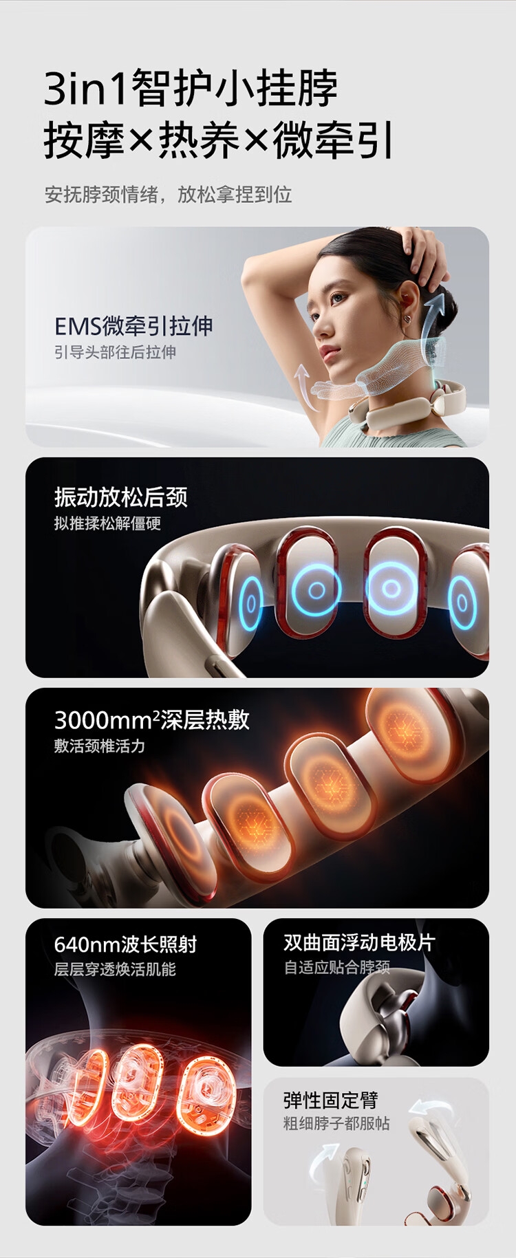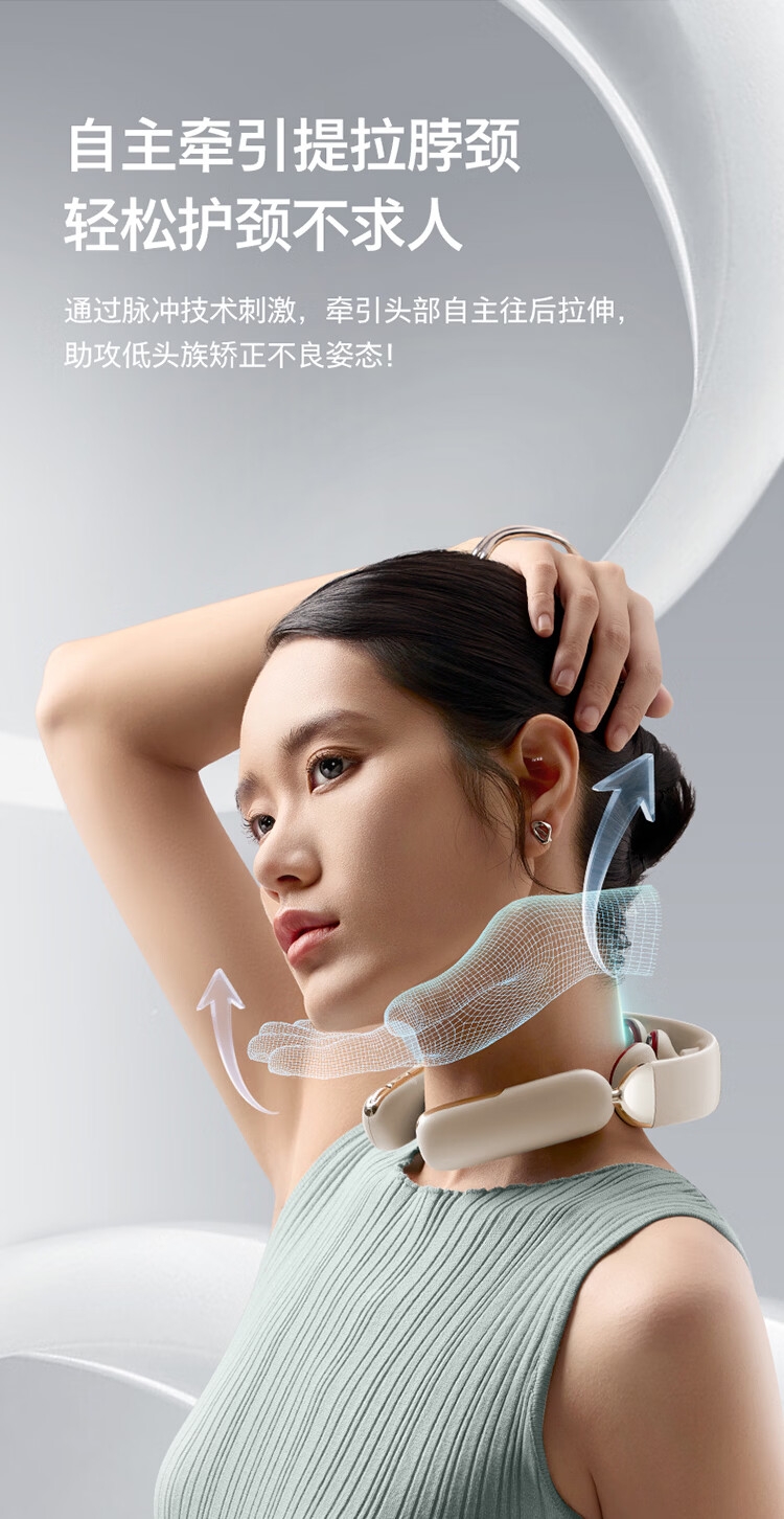 通过脉冲技术刺激,牵引头部自主往后拉伸,助攻低头族;EMS脉冲刺激颈部肌群收缩运动;2倍按摩面积提升