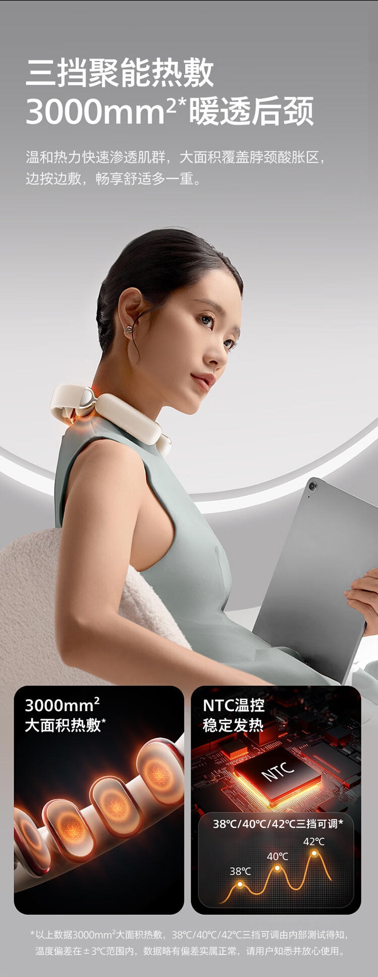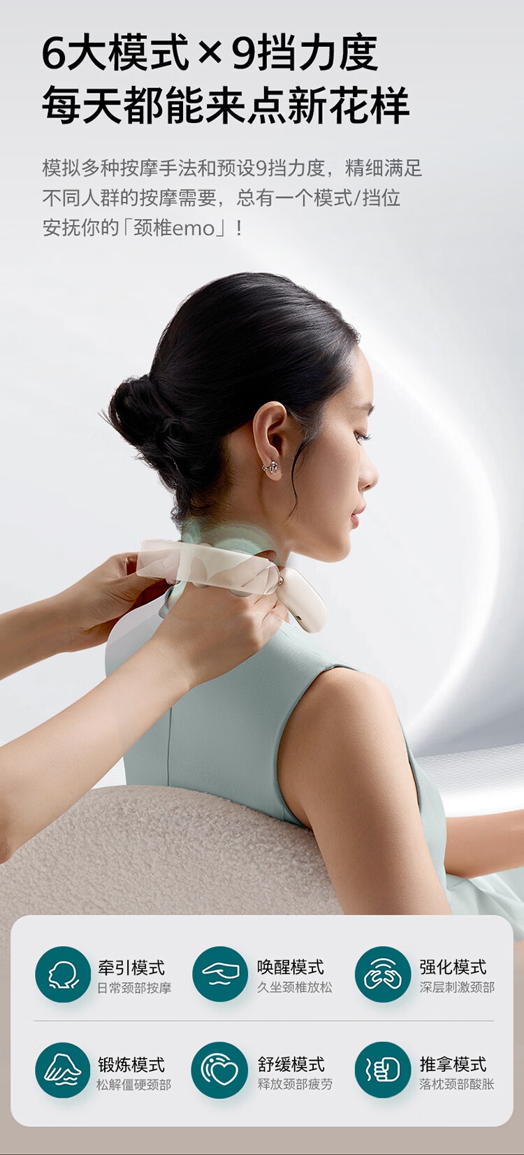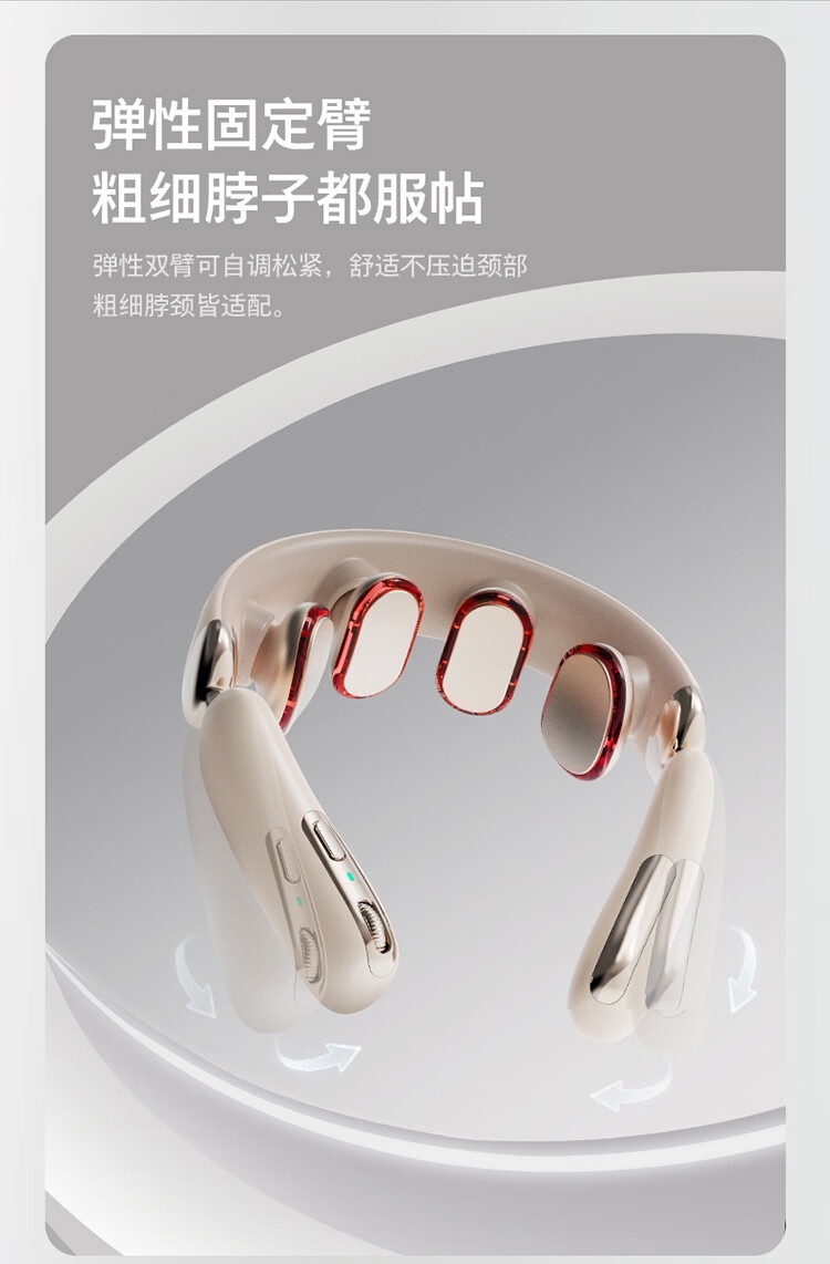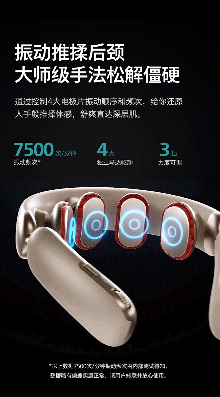 通过脉冲技术刺激,牵引头部自主往后拉伸,助攻低头族;EMS脉冲刺激颈部肌群收缩运动;2倍按摩面积提升