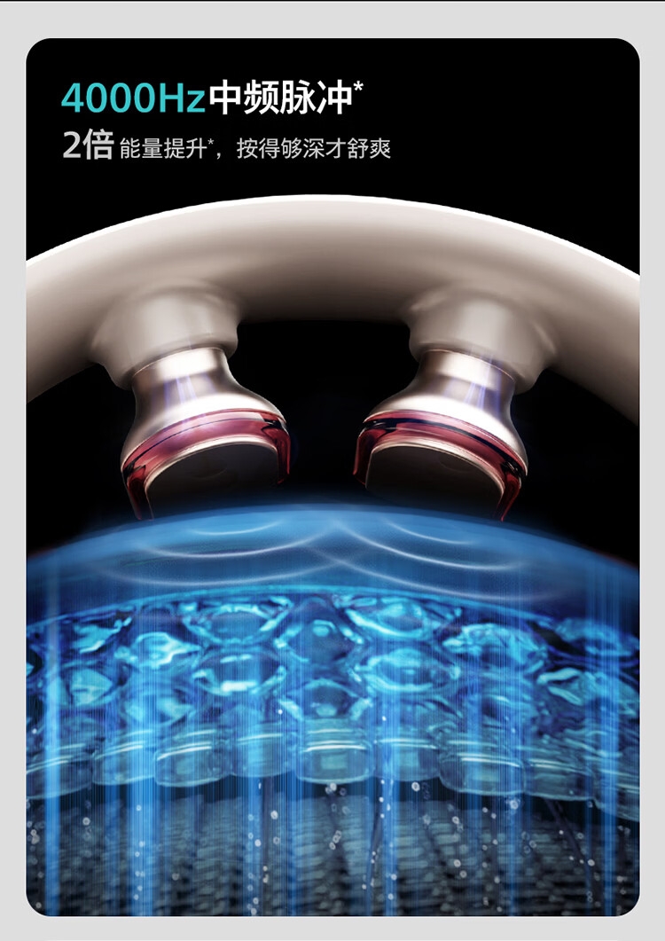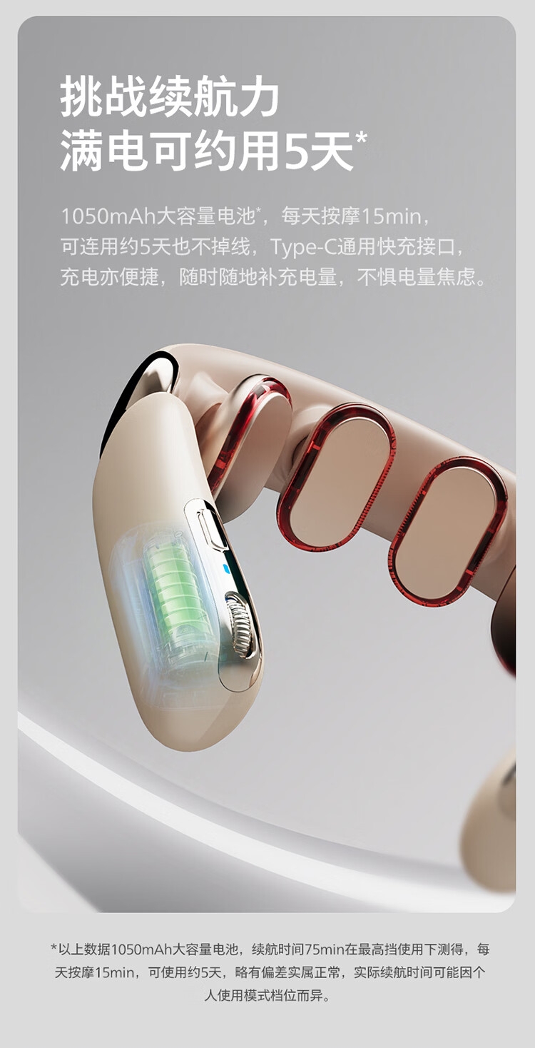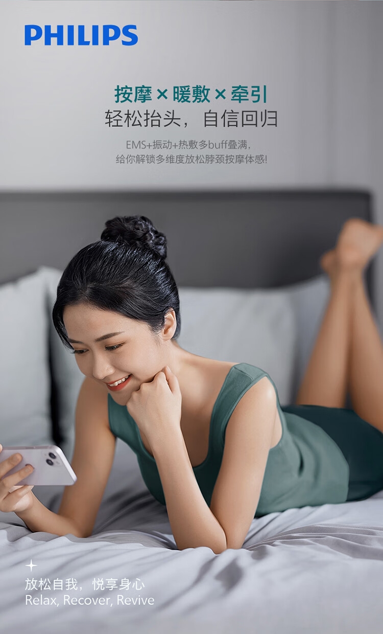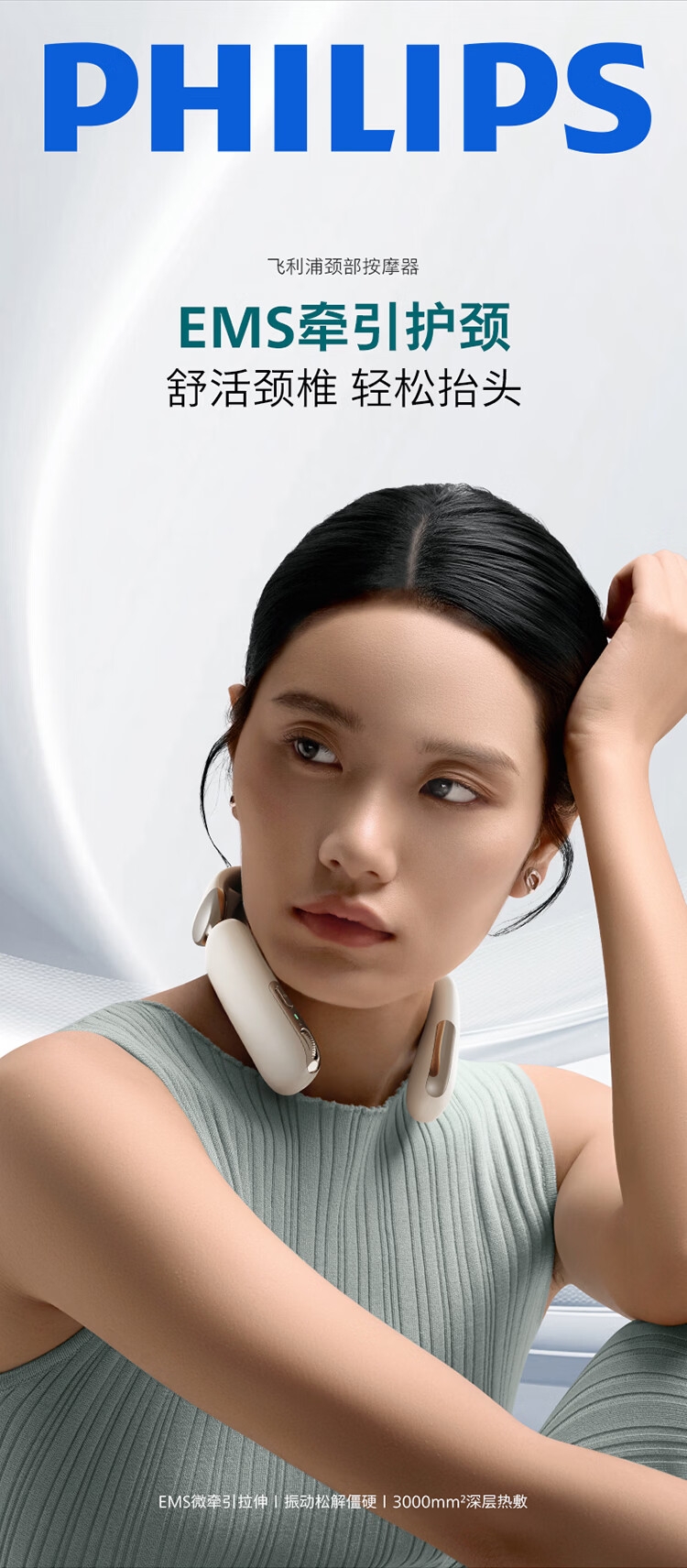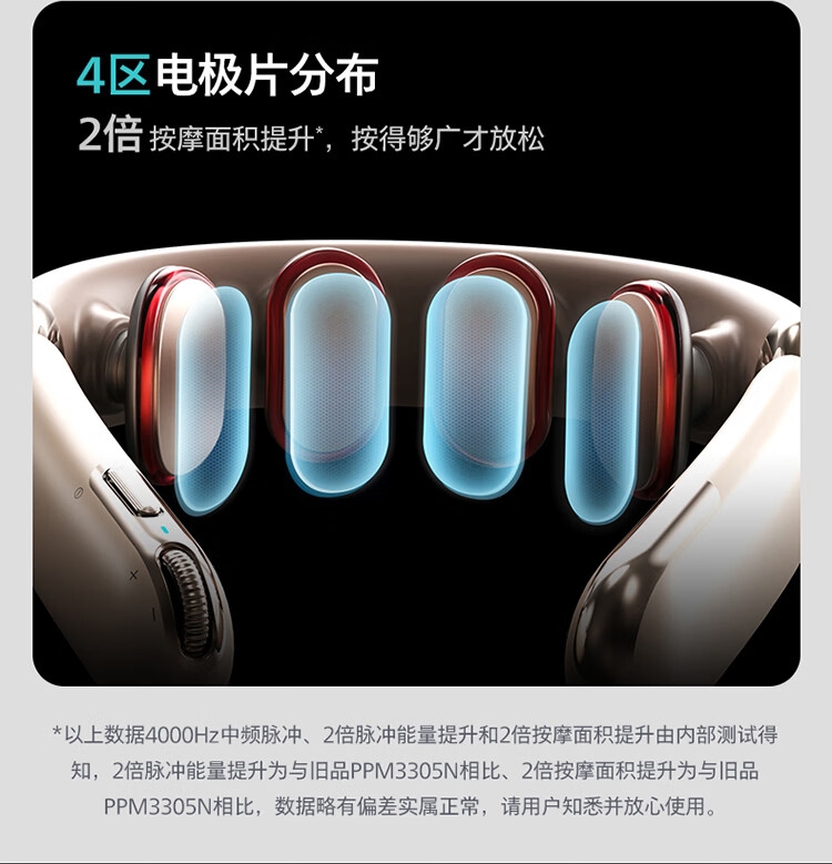 通过脉冲技术刺激,牵引头部自主往后拉伸,助攻低头族;EMS脉冲刺激颈部肌群收缩运动;2倍按摩面积提升