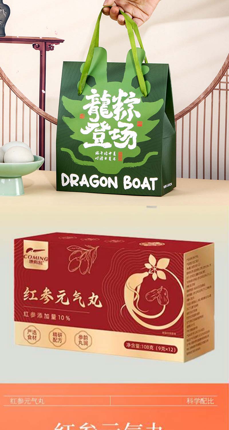 参补元气:红参黄芪丸补气养身,契合现代人健康需求;粽传情谊:桂花粽作为端午符号,承载节日文化记忆;囊纳安康:端午香囊寓意驱邪避疫,呼应传统习俗