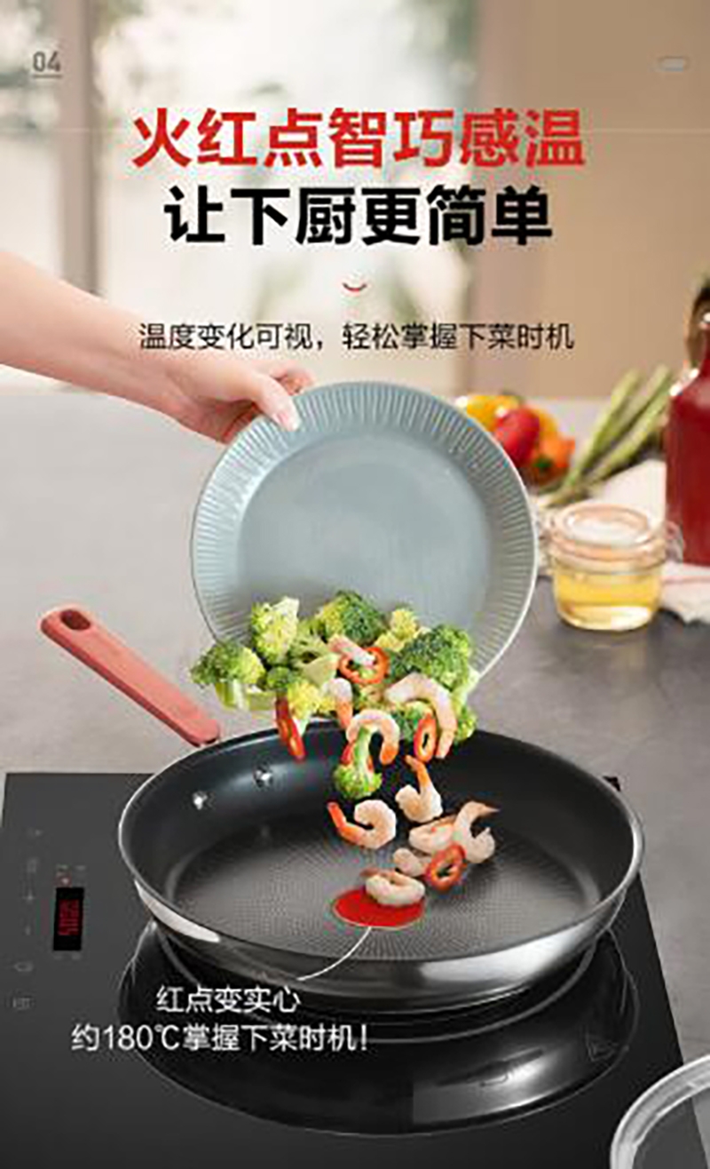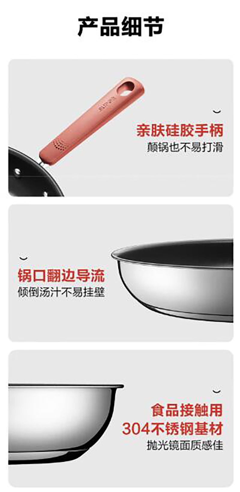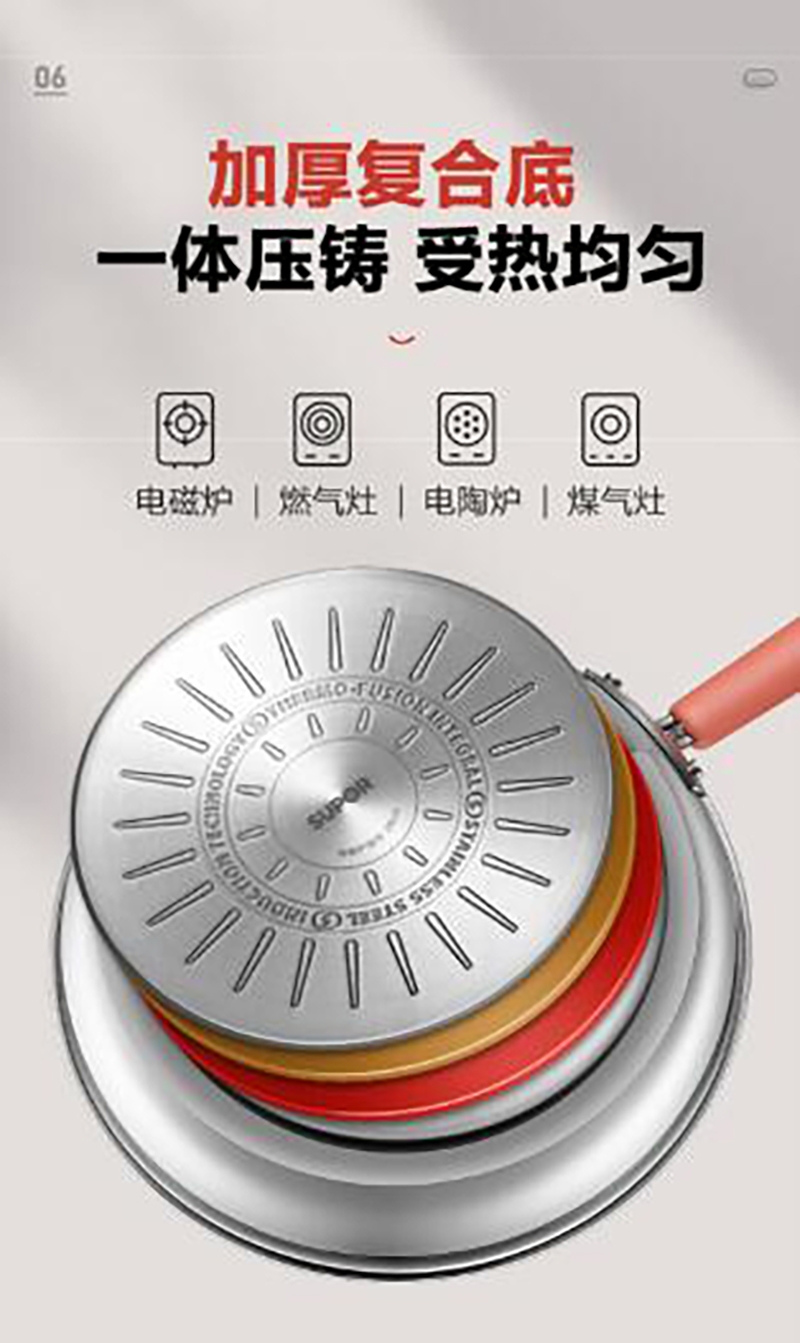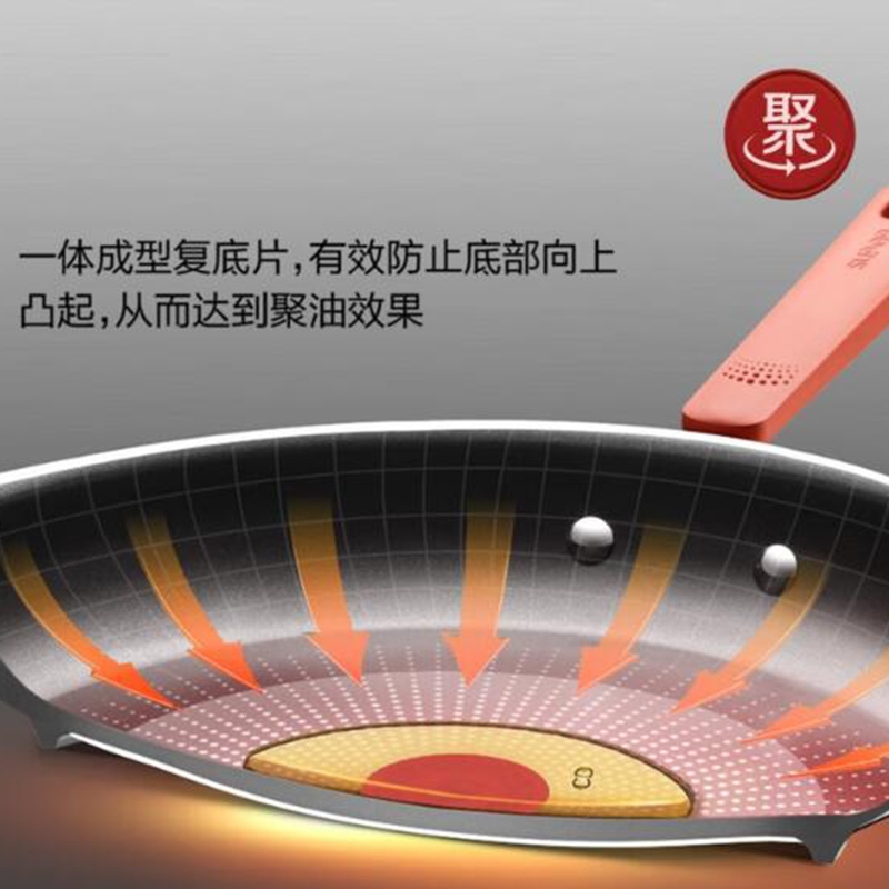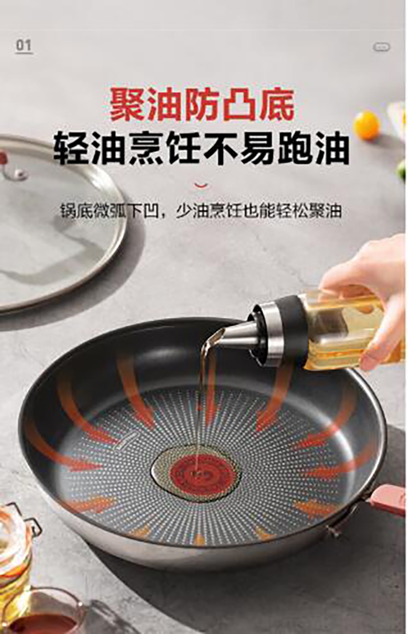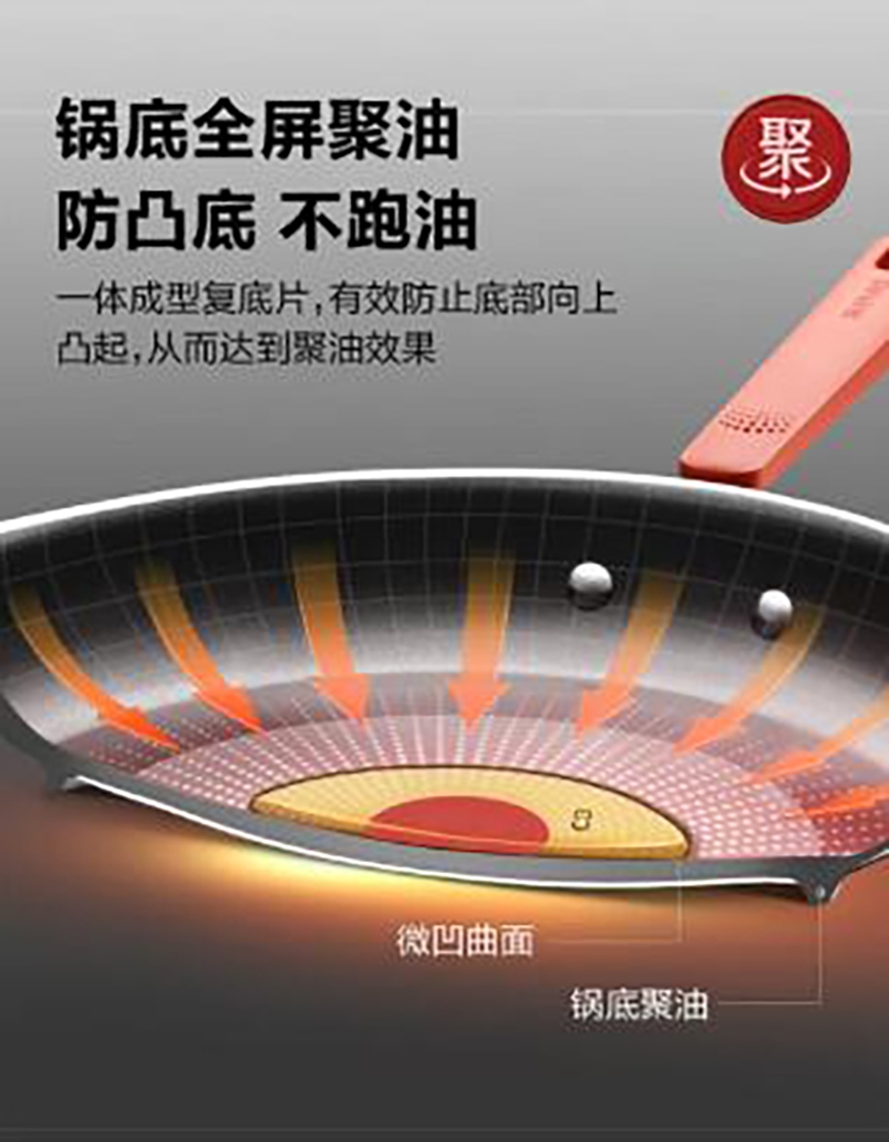 聚油防凸底轻油烹饪不易跑油锅底微弧下凹;少油烹饪也能轻松聚油;锅底全屏聚油防凸底 不跑油一体成型复底片;有效防止底部向上凸起,从而达到聚油效果