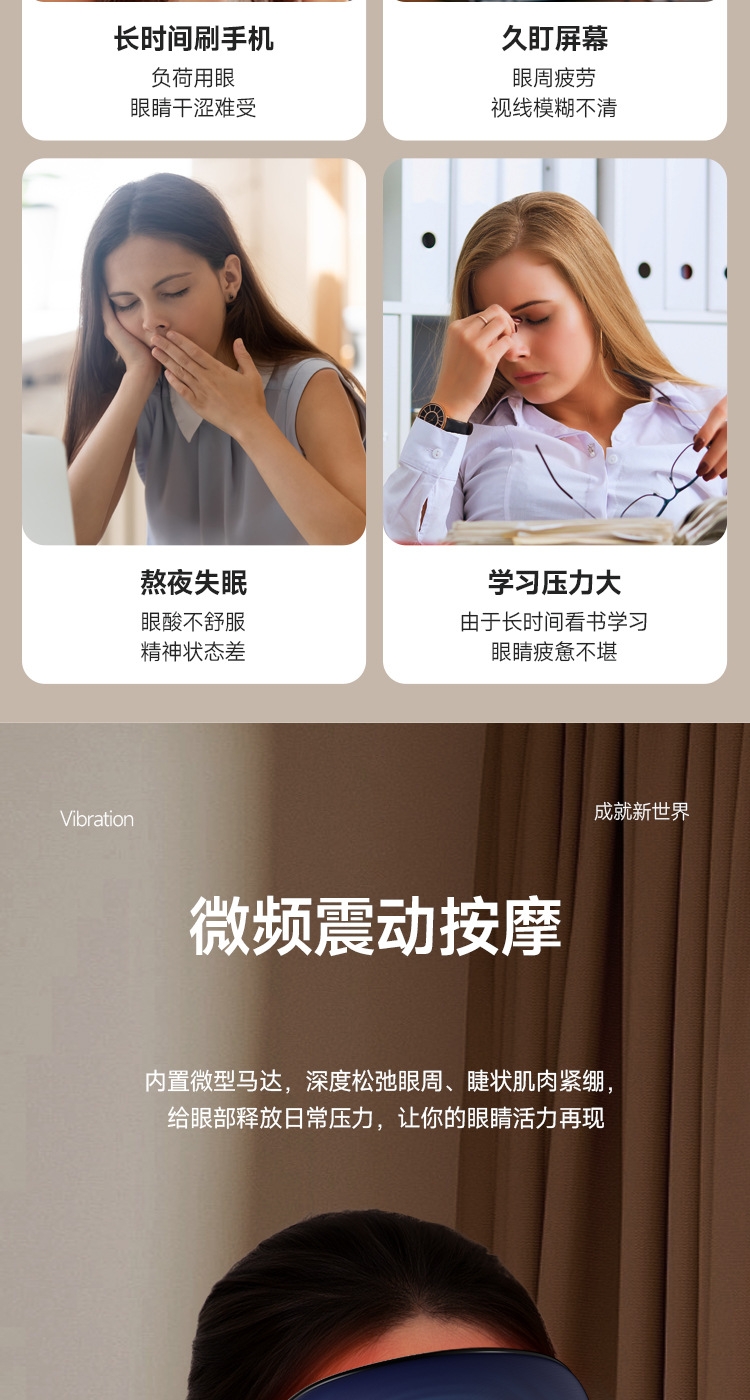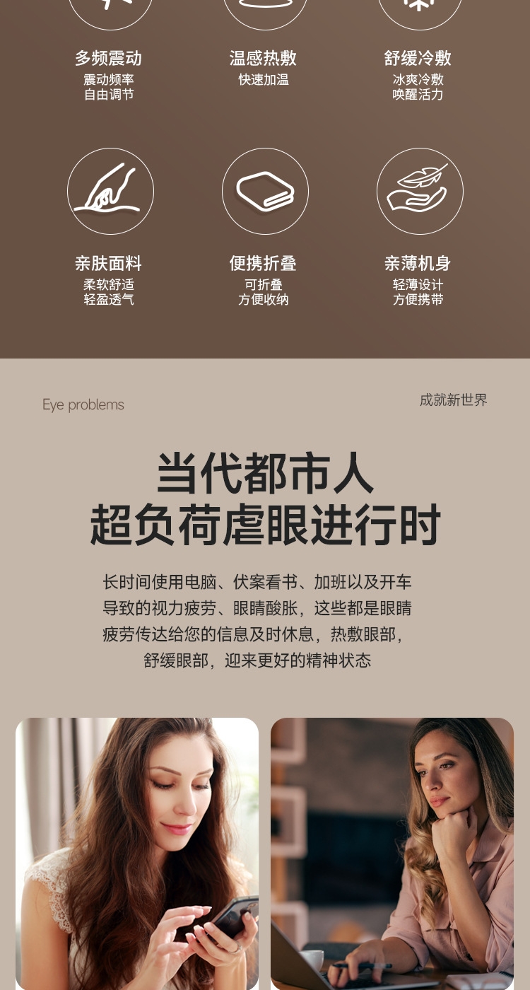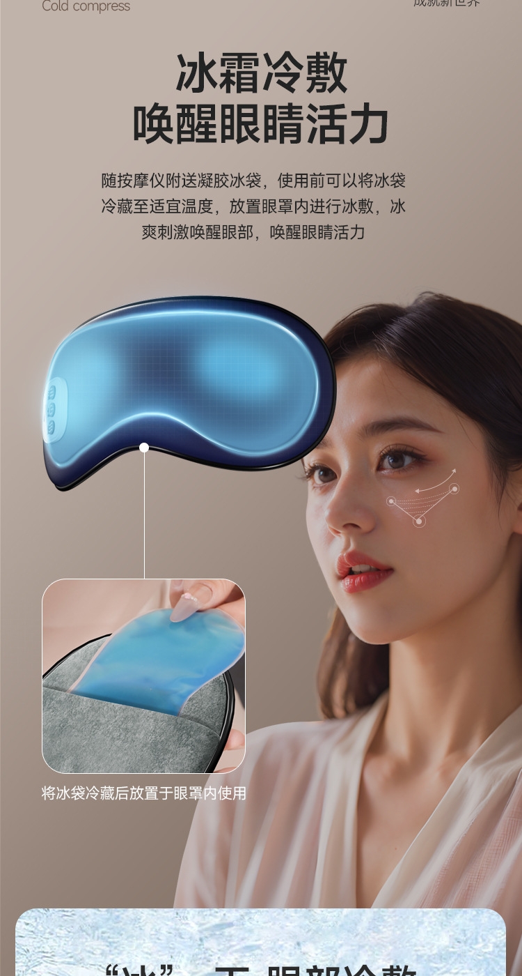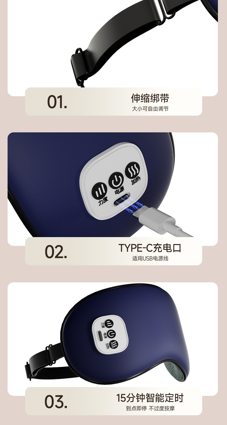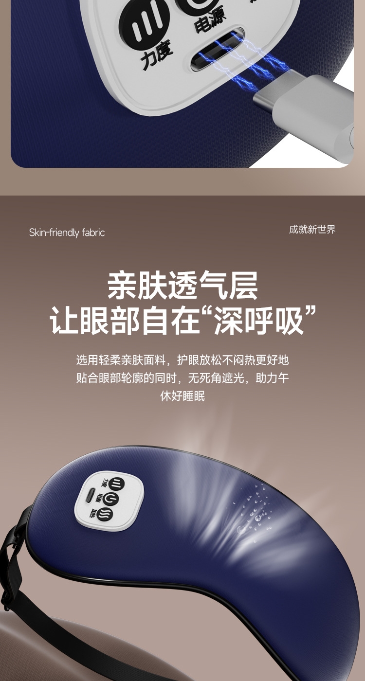 小巧精致可180°折叠,方便携带;遮光休息,振动按摩放松,;可热敷,冷敷,放松眼部