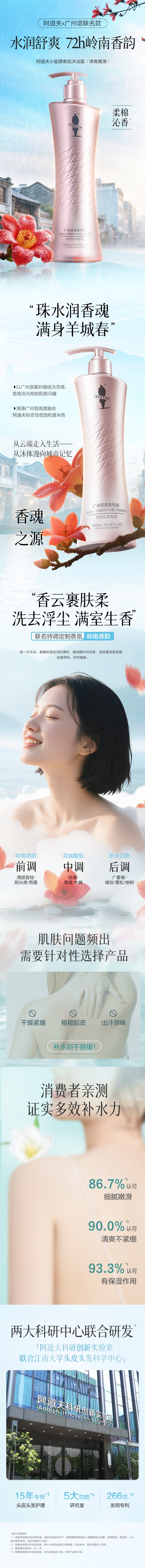 “珠水润香魂青丝系岭南”;“洗一头岭南韵做3日西关人;从云端走入生活一从发梢漫向城市记忆;修护丝滑 72h岭南香韵;阿道夫x广州塔联名款
