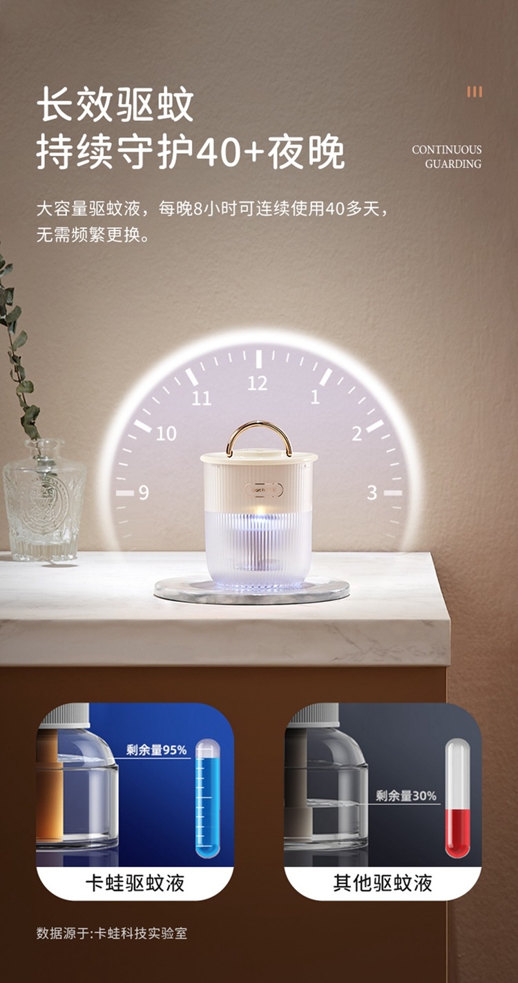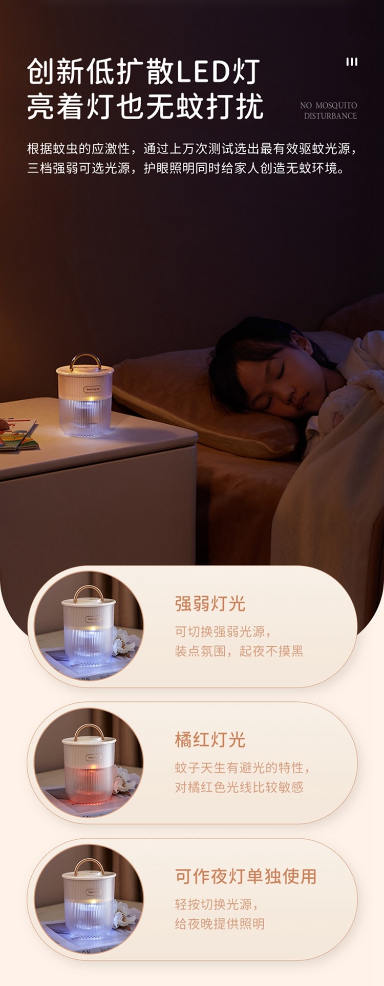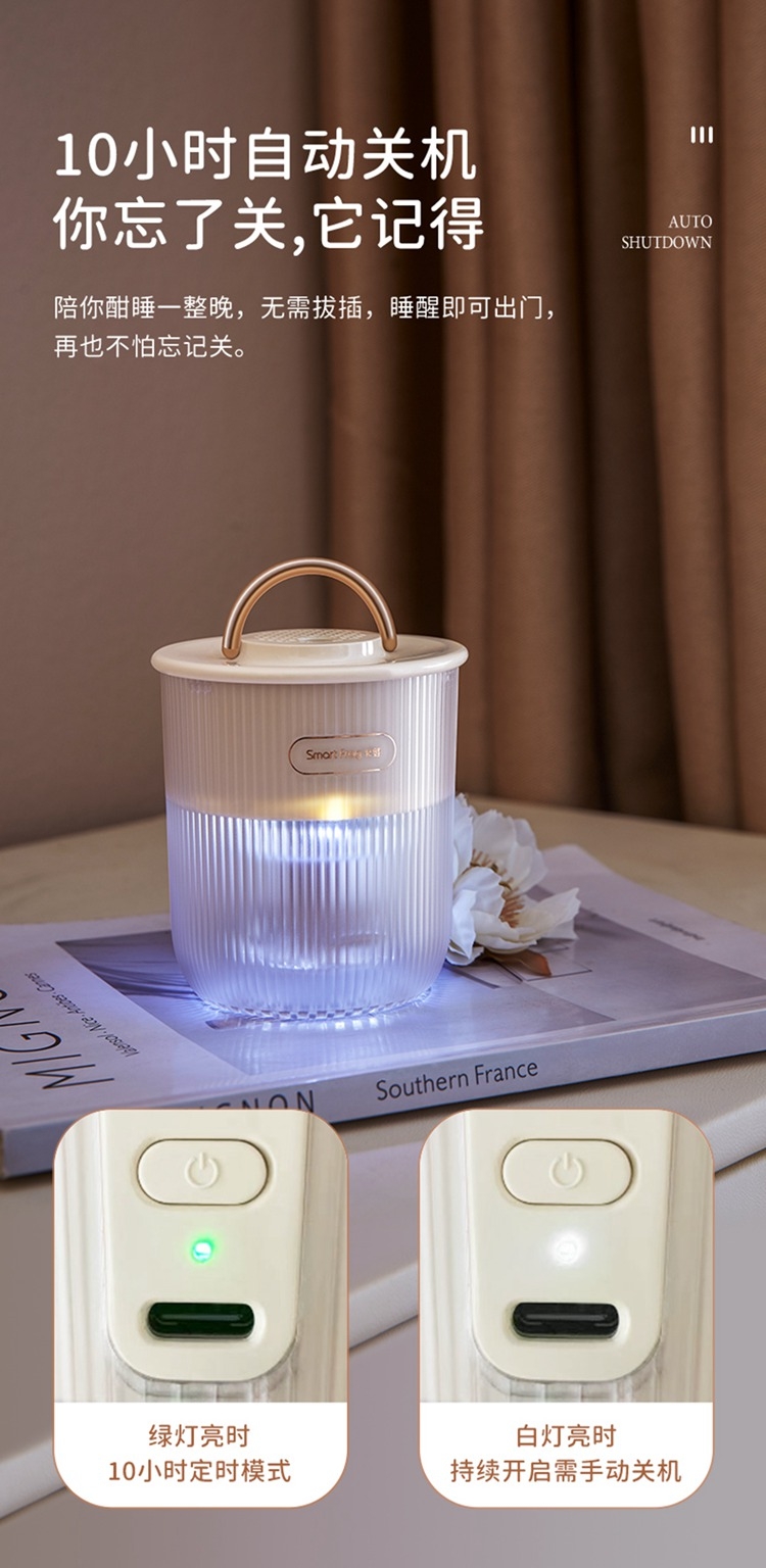 植物萃取配方,0香精0烟尘;创新低扩散护眼LED灯,可选三档光源,装点家居氛围;每晚8小时可连续使用40多天,无需频繁更换