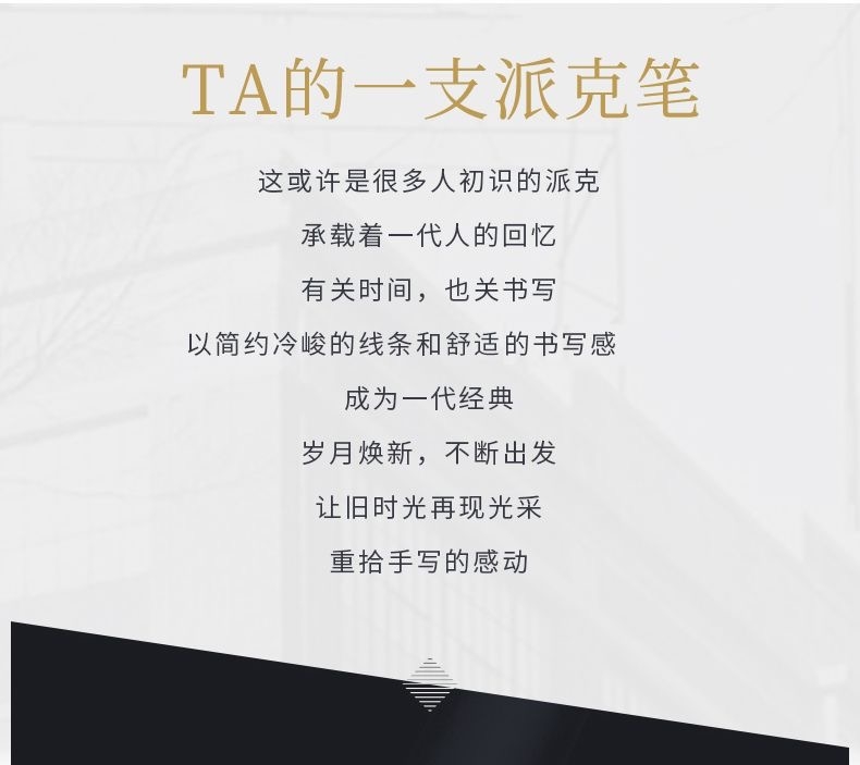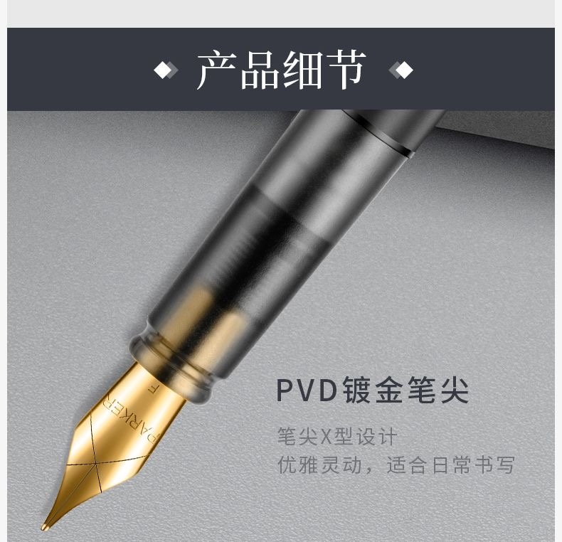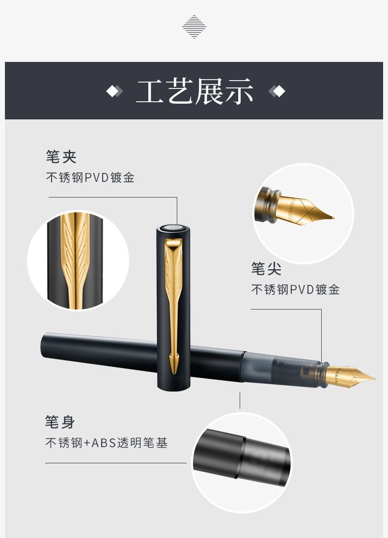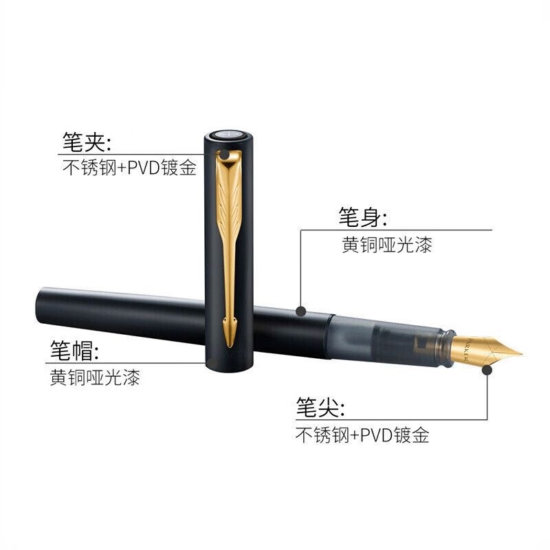 笔夹: 不锈钢+ PVD镀金;笔帽: 黄铜镀漆;笔尖X型设计