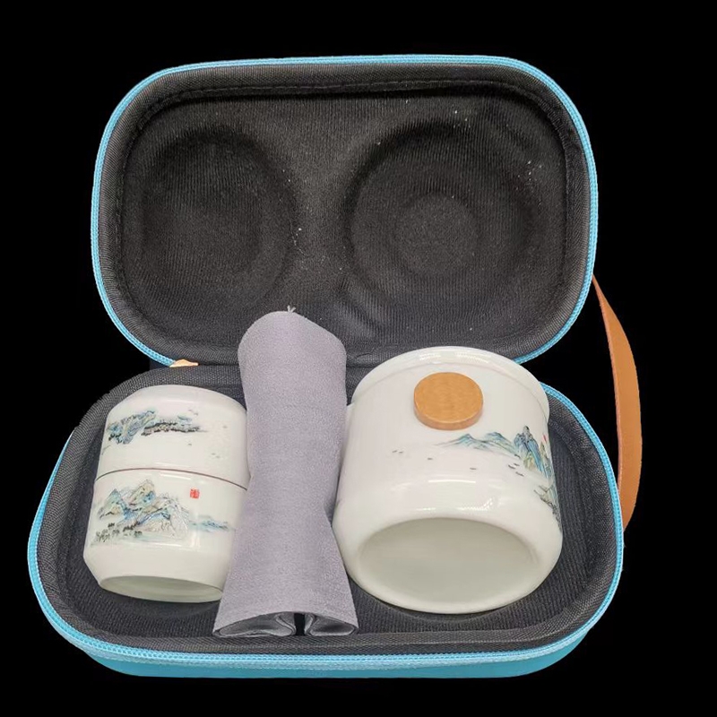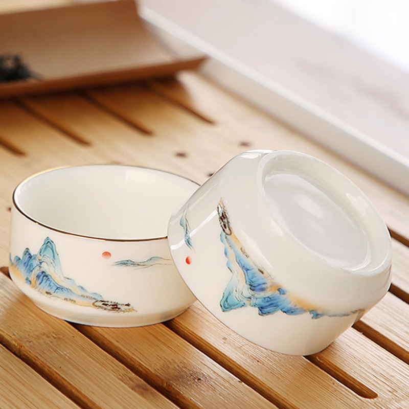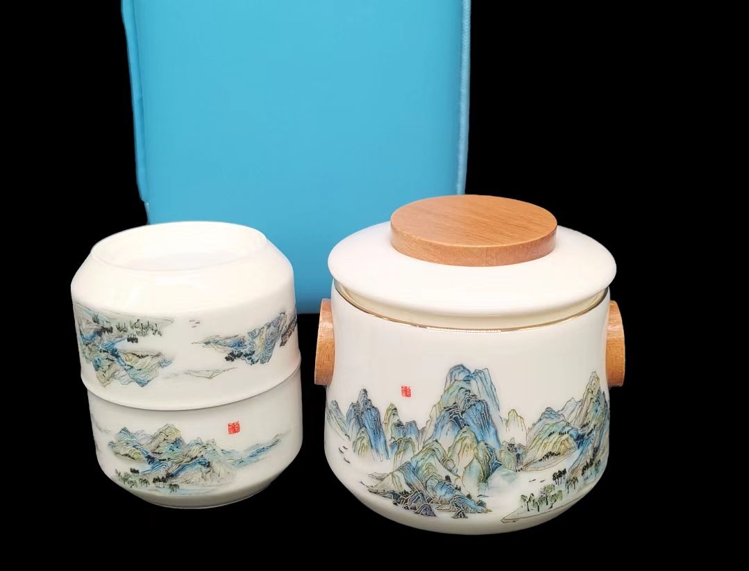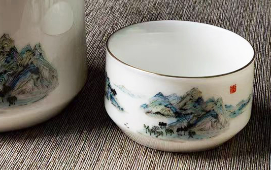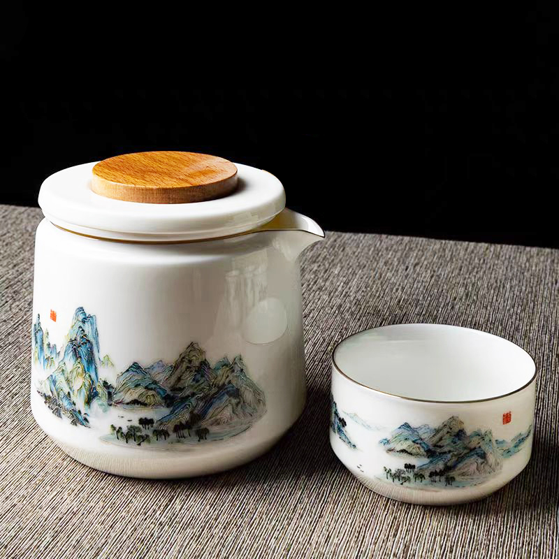 三个杯子可与壶上下重叠组合。实木盖子手柄,隔热防烫;壶盖自带过滤孔,过滤茶渣,方便携带,简单实用。;高档羊脂玉瓷,瓷质细腻温润,触感舒适。似凝脂,如美