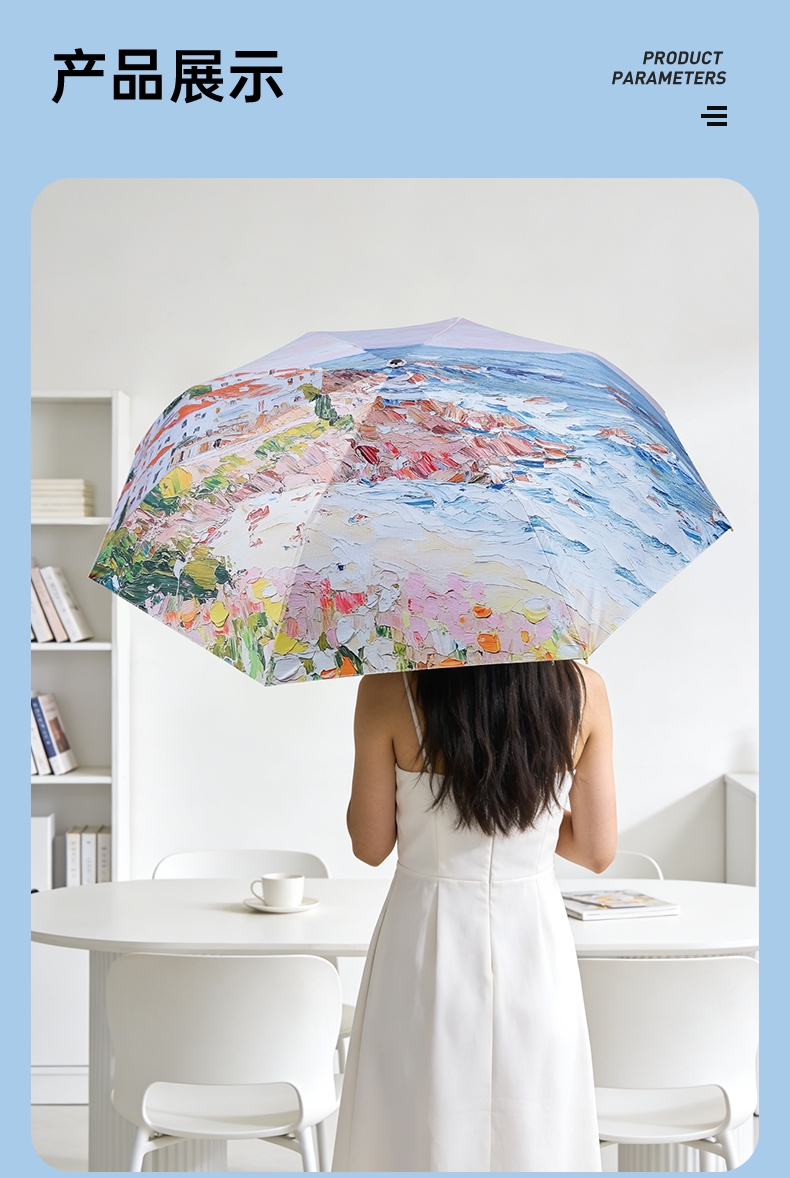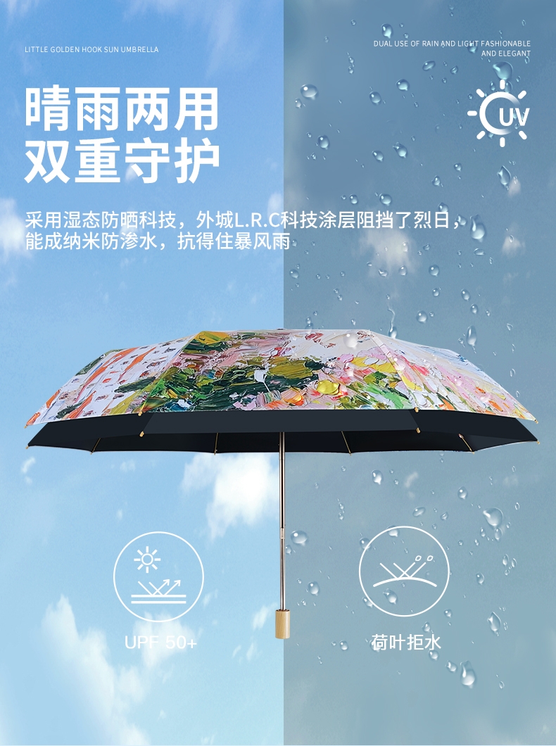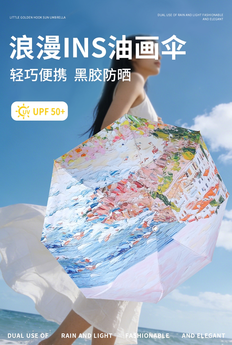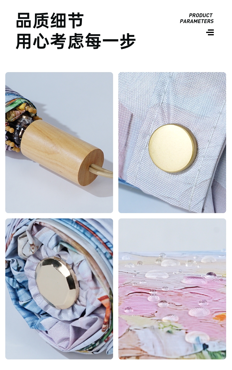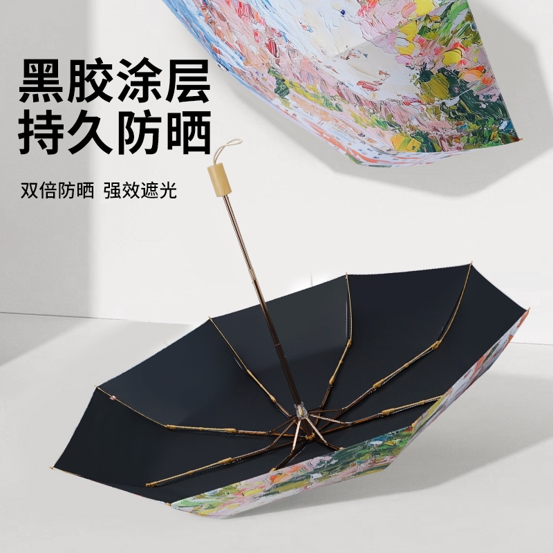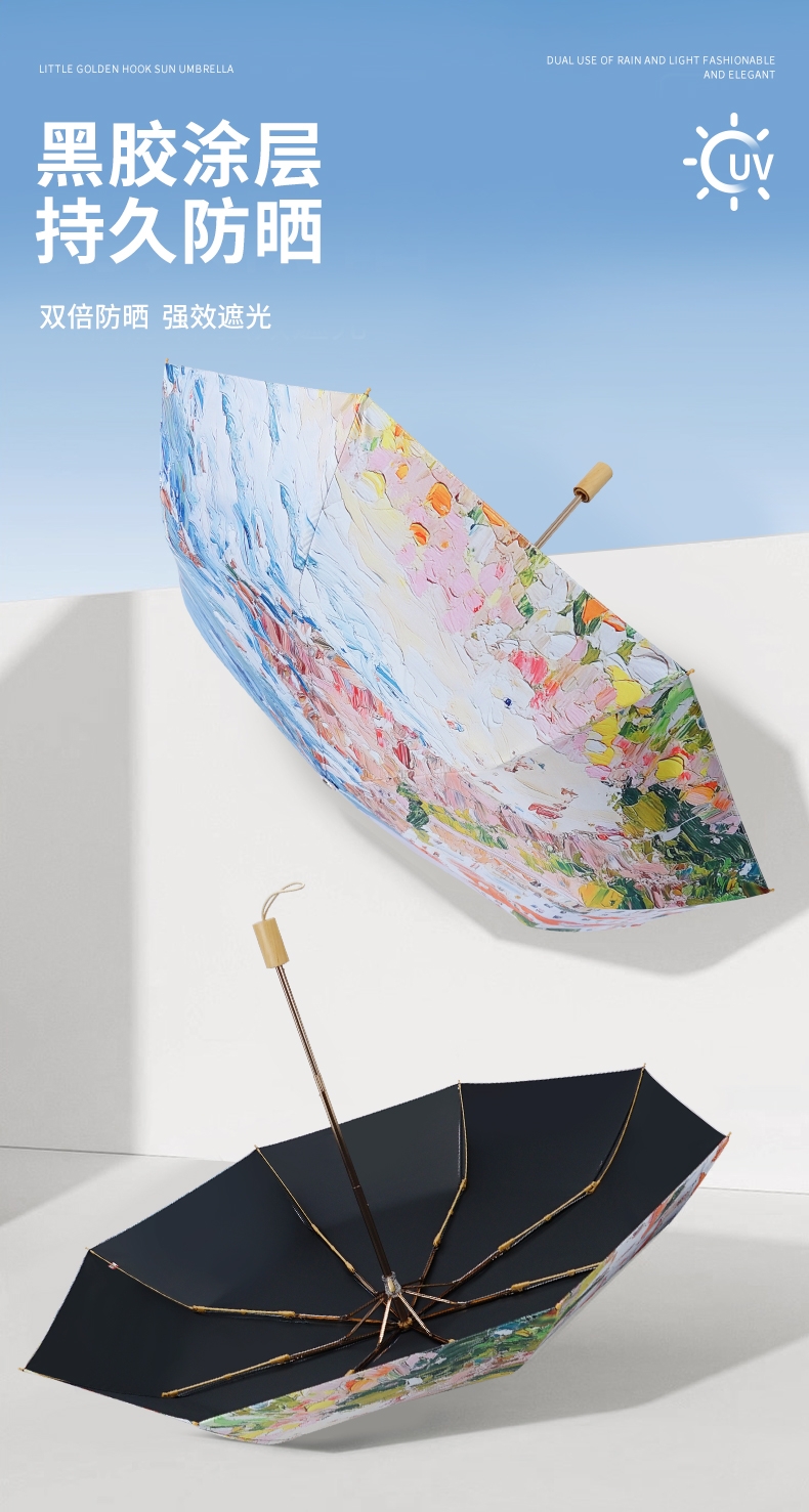 三折8骨香槟金伞架;210T高密度科技防晒黑胶涂层,高效隔热防晒防紫外;浪漫INS油画伞