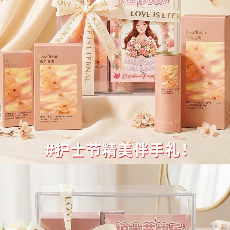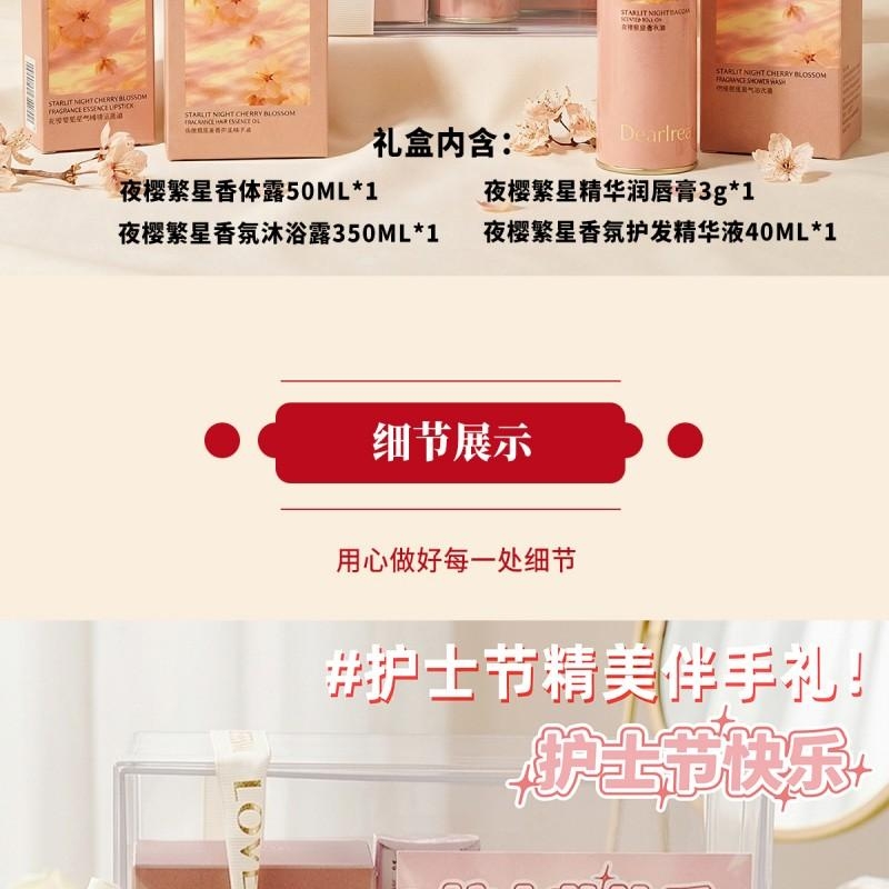 组合:夜樱繁星香体露50ML*1、夜樱繁星精华润唇膏3g*1、夜樱繁星香氛沐浴露350ML*1、夜樱繁星香氛护发精华油40ML*1