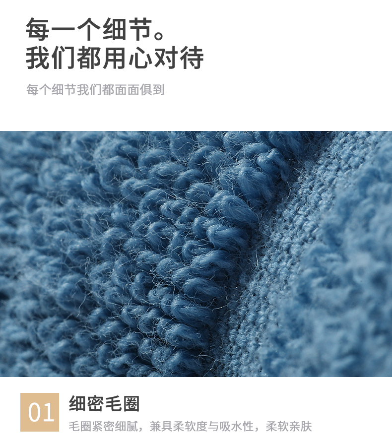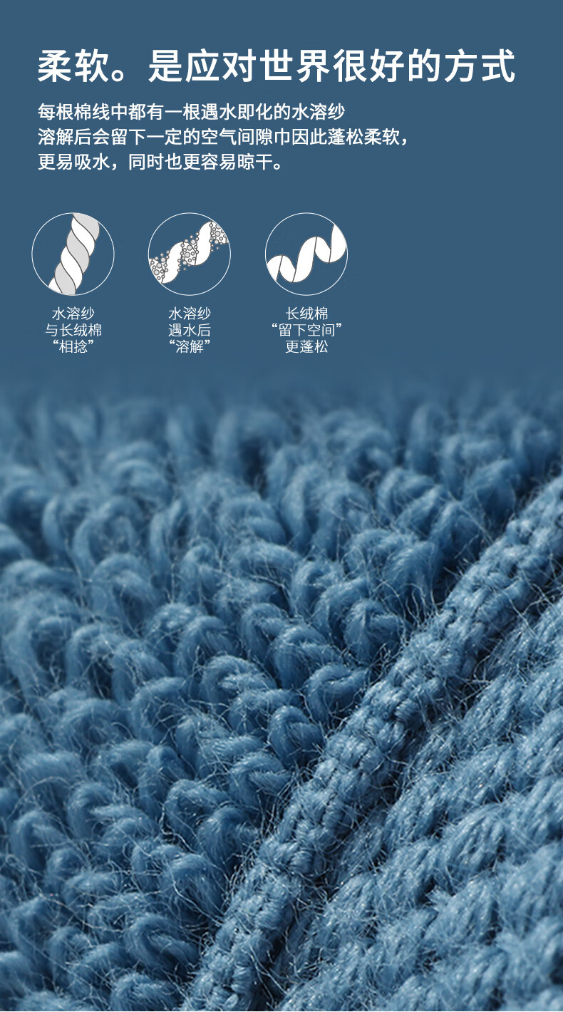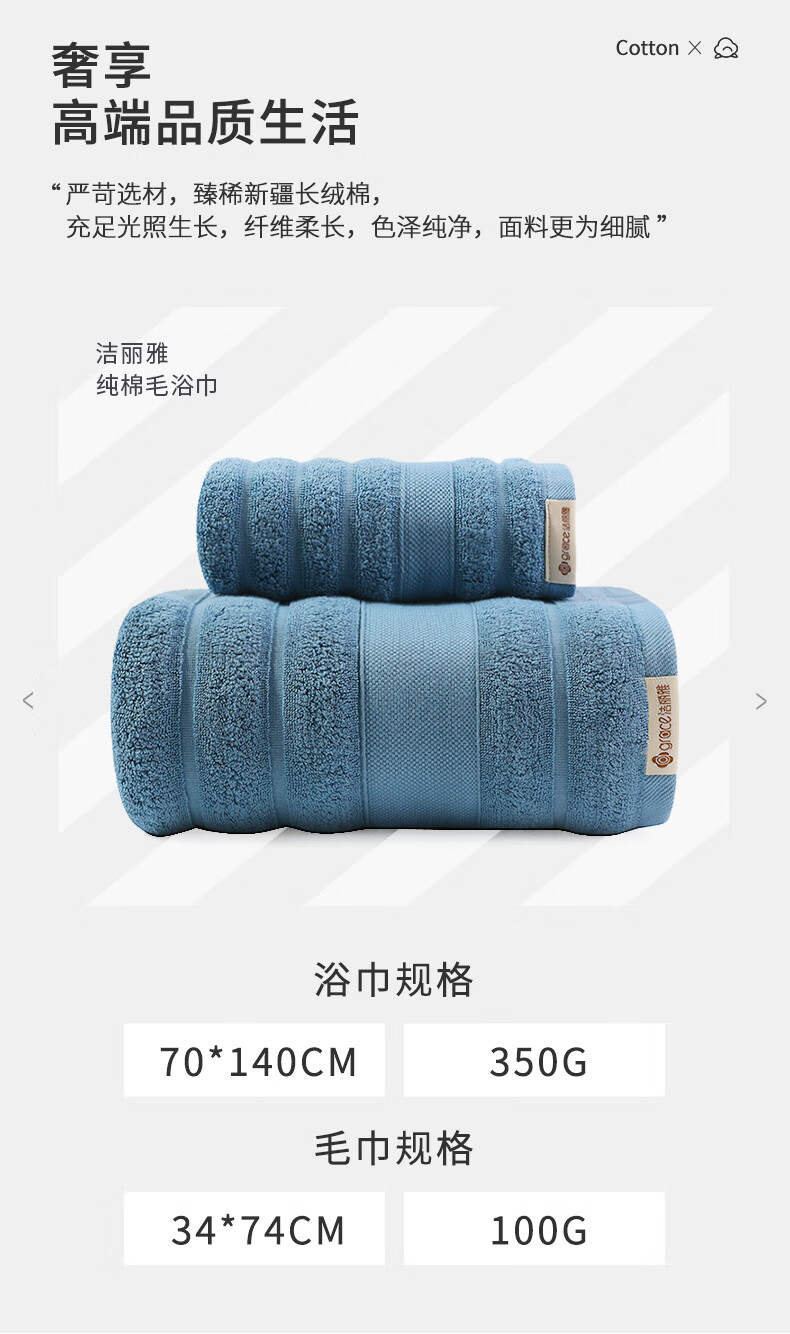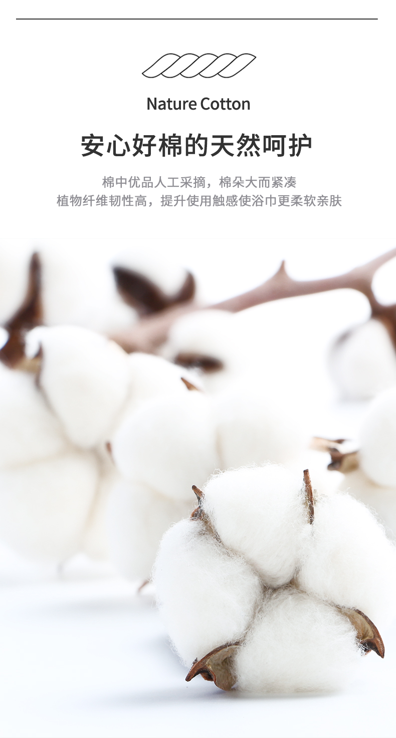 毛圈细密纤长,触感蓬松柔软,吸水性好;A类国家标准,婴幼儿可使用;源自新疆阿拉尔长绒棉黄金产地
