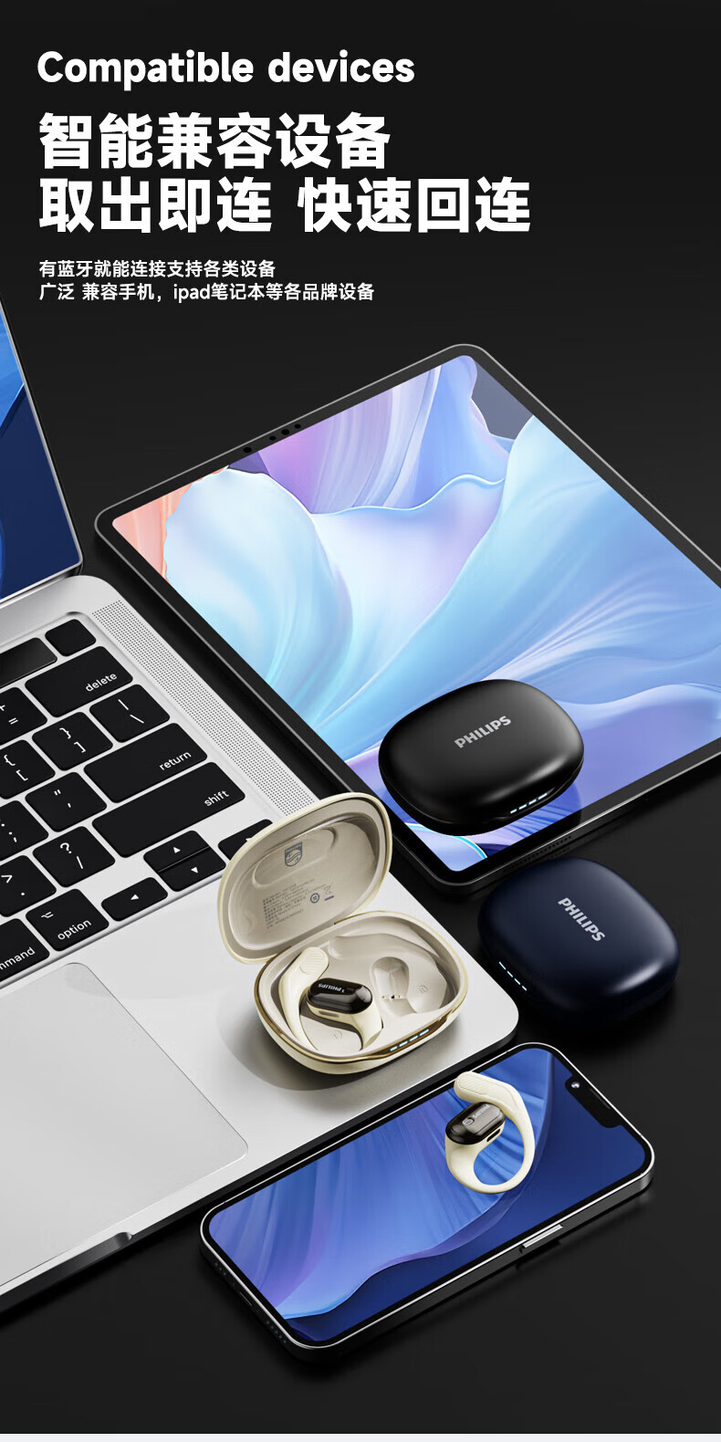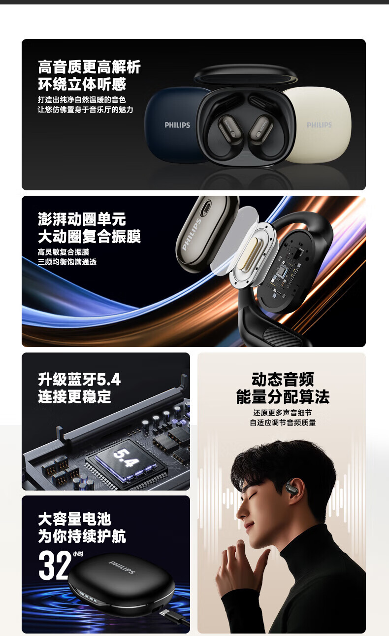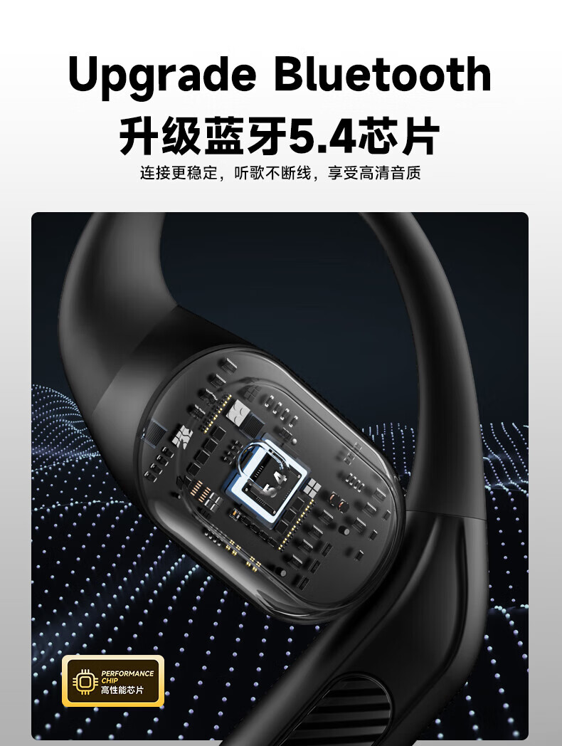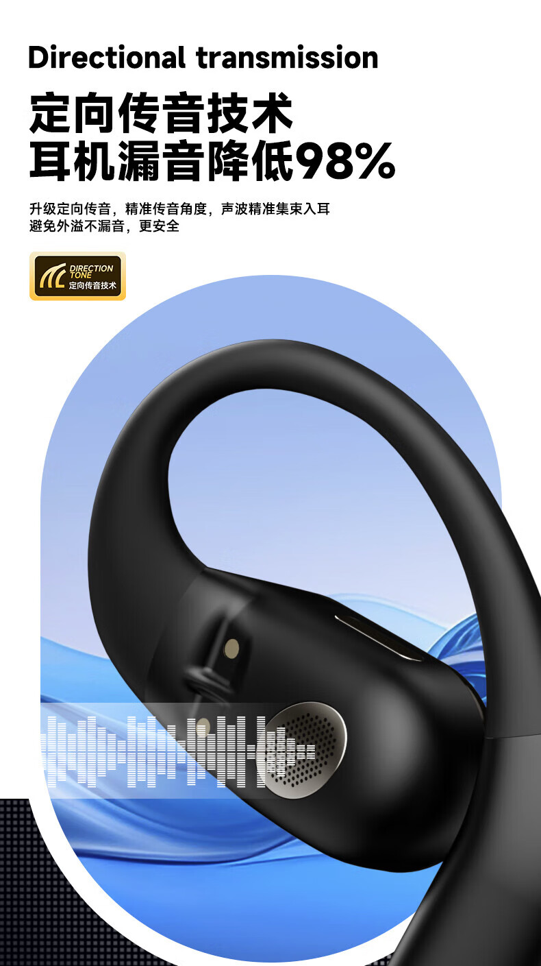 蓝牙5.4芯片,功耗低 不卡顿,左右耳都可拿起即用;开放式体验不入耳,更舒适更轻盈,佩戴更贴合稳固;IPX7生活运动级防水,无惧雨汗,全天候使用