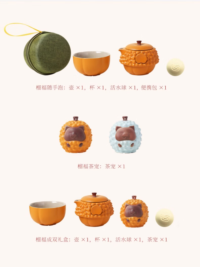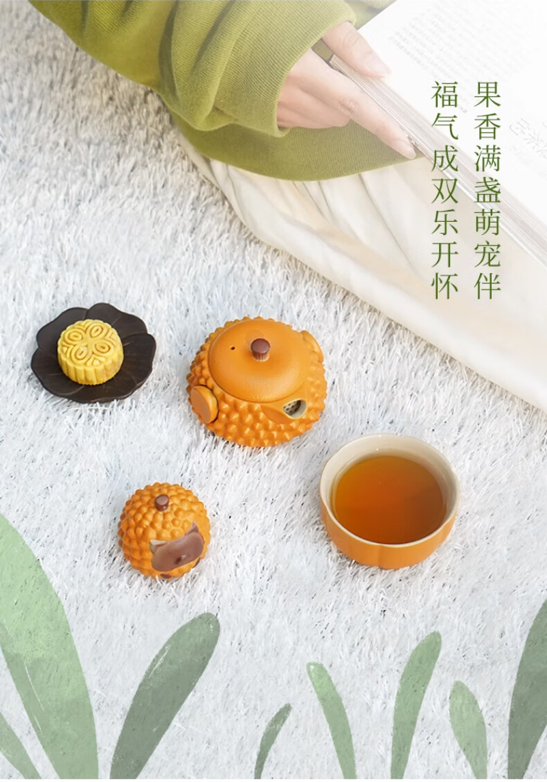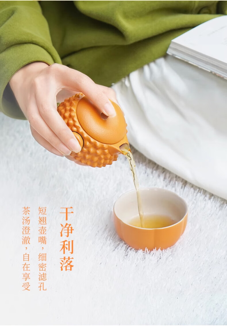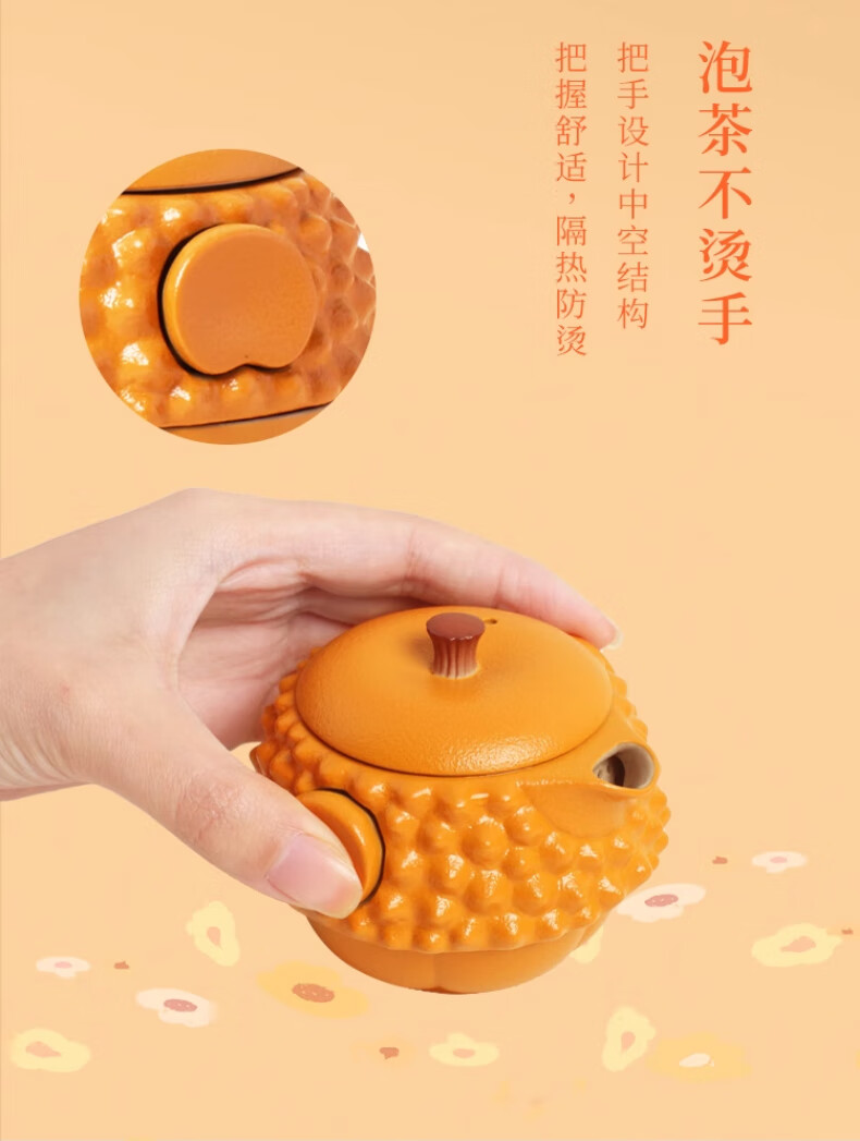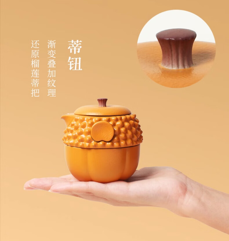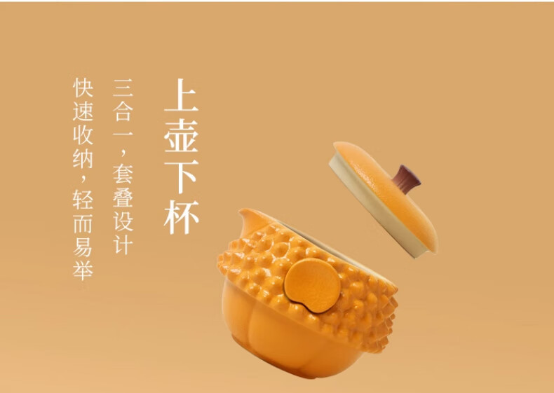 壶身仿果壳,繁复而细致;杯底用线条塑造「福」字;上壶下杯可套叠