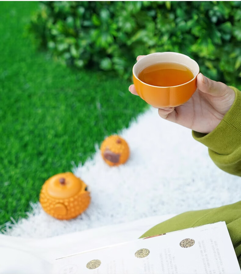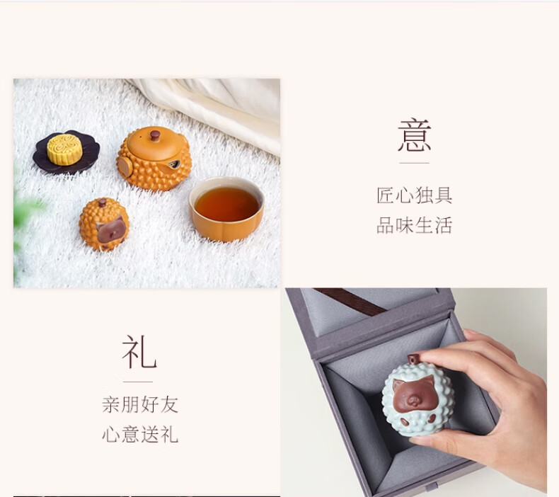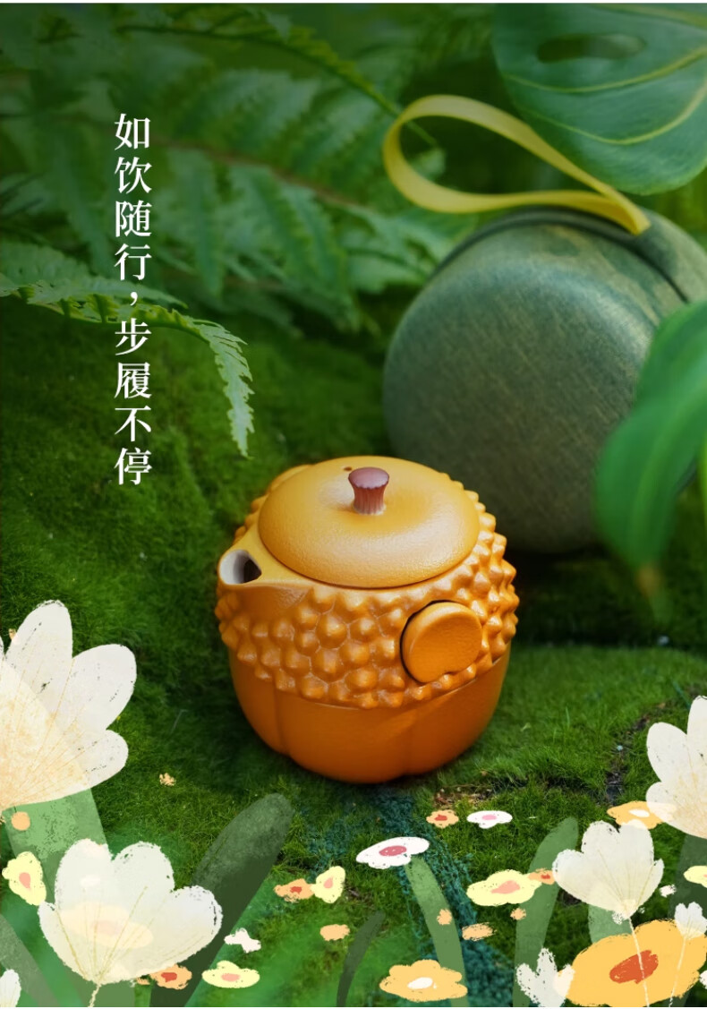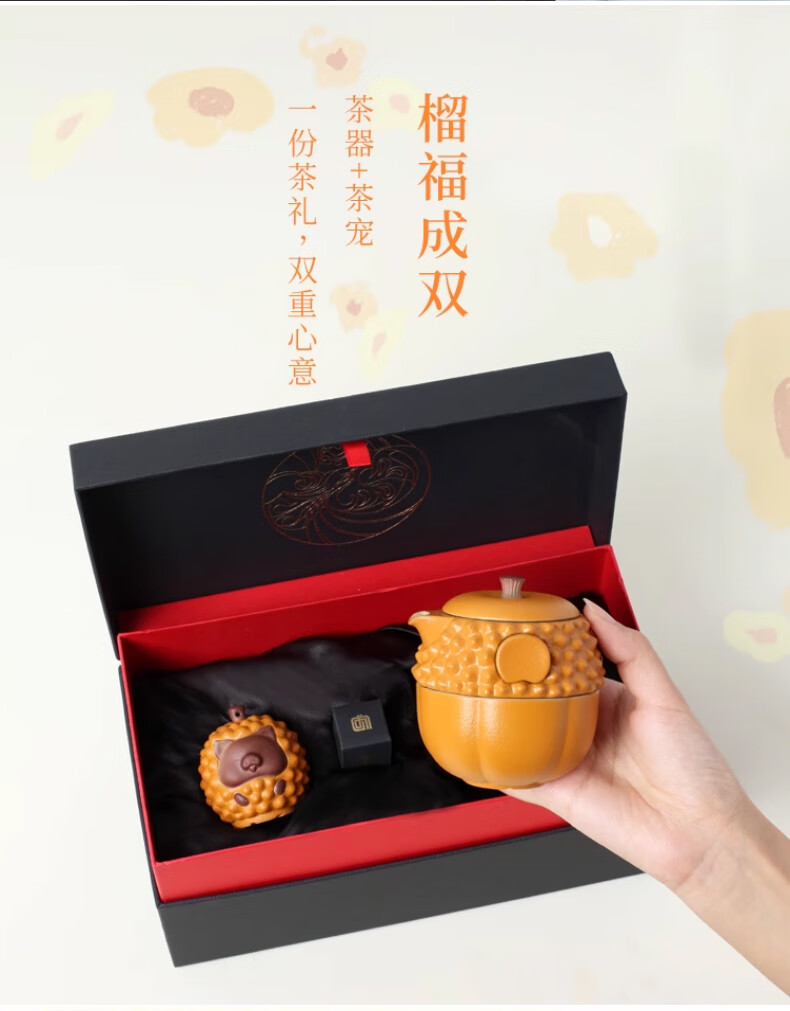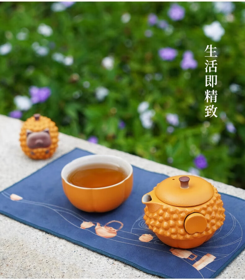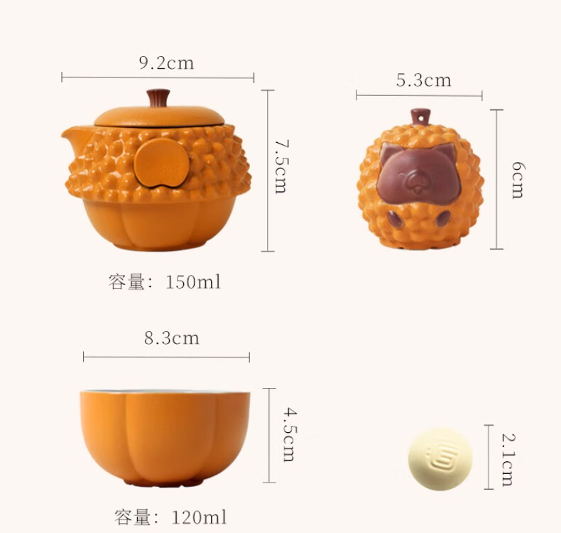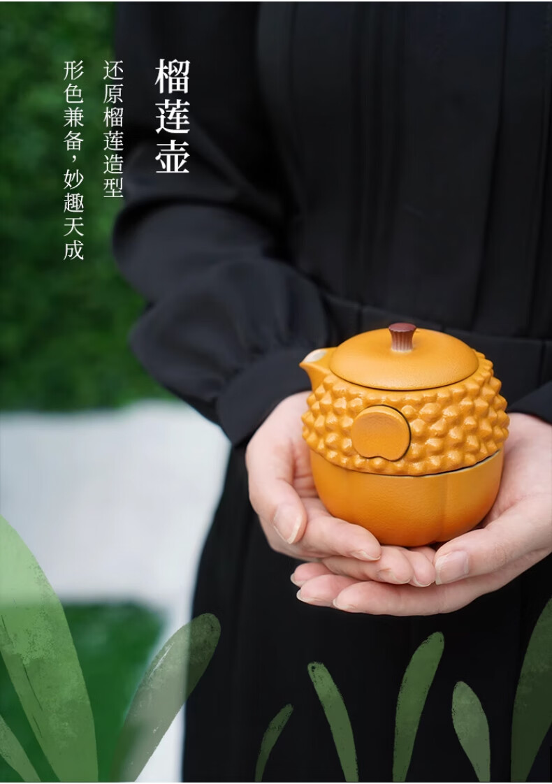 壶身仿果壳,繁复而细致;杯底用线条塑造「福」字;上壶下杯可套叠