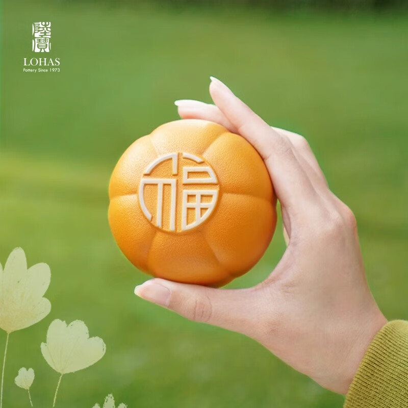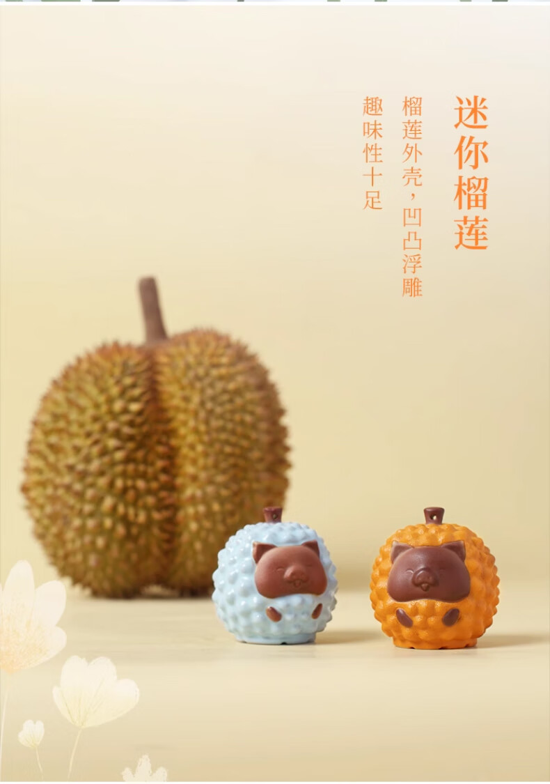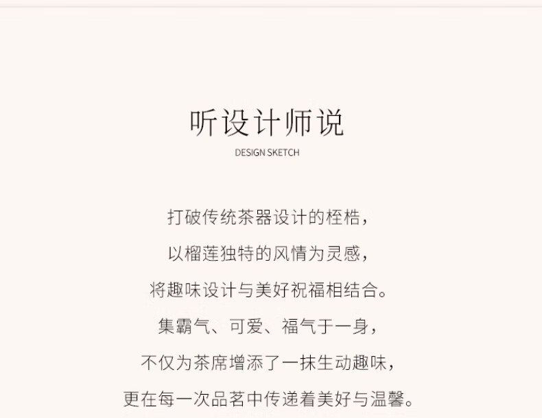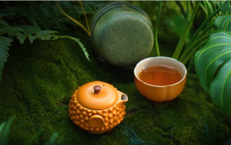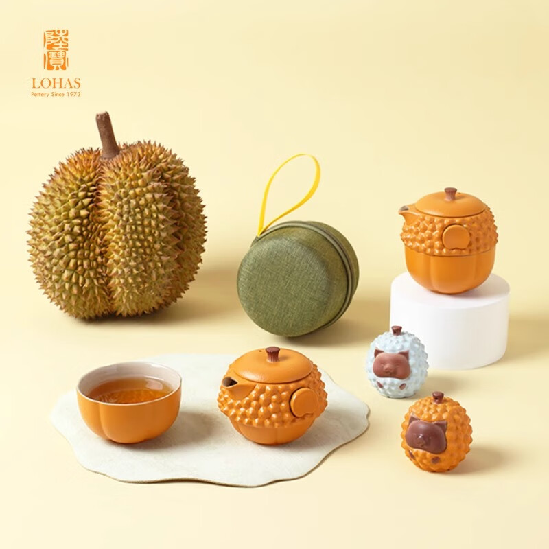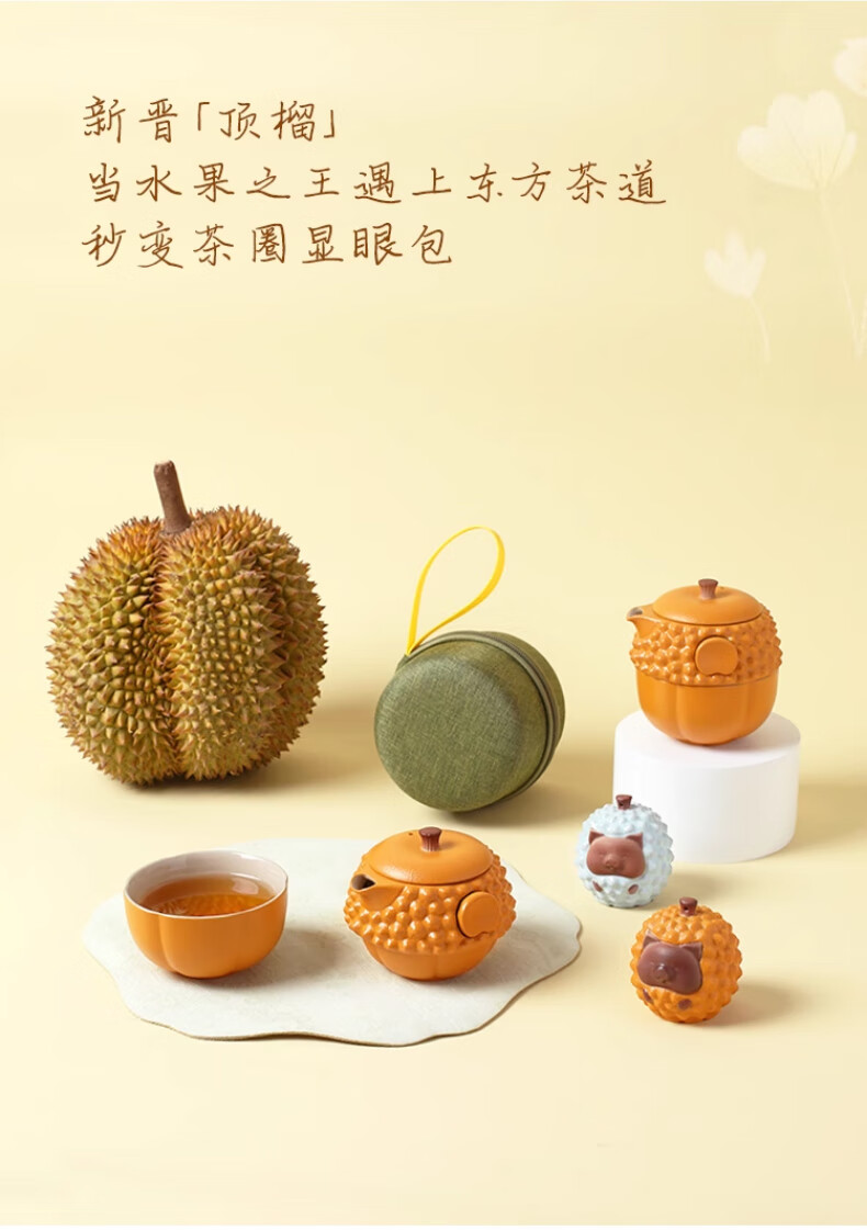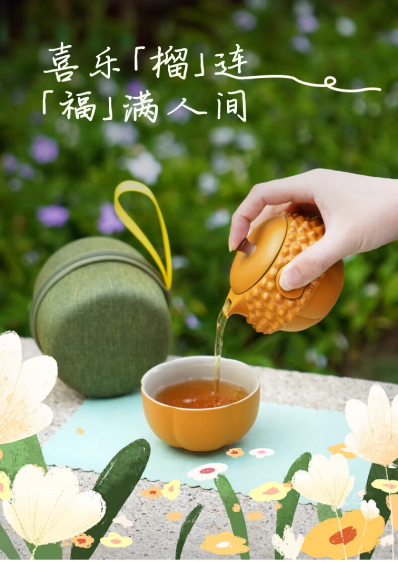 壶身仿果壳,繁复而细致;杯底用线条塑造「福」字;上壶下杯可套叠