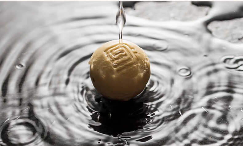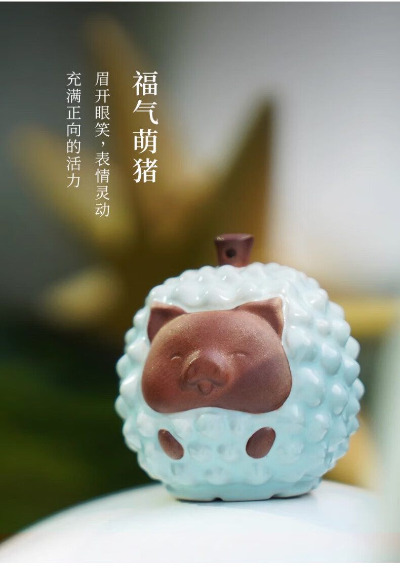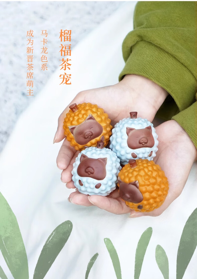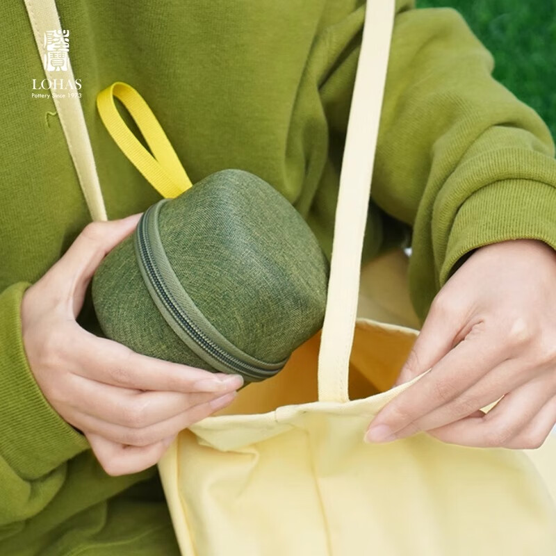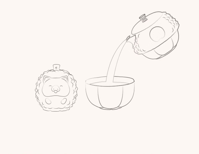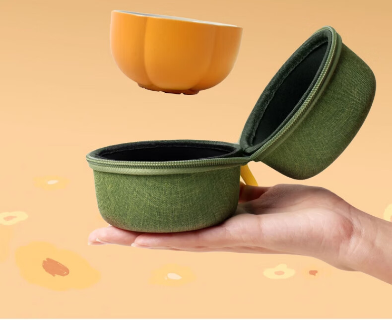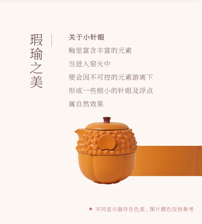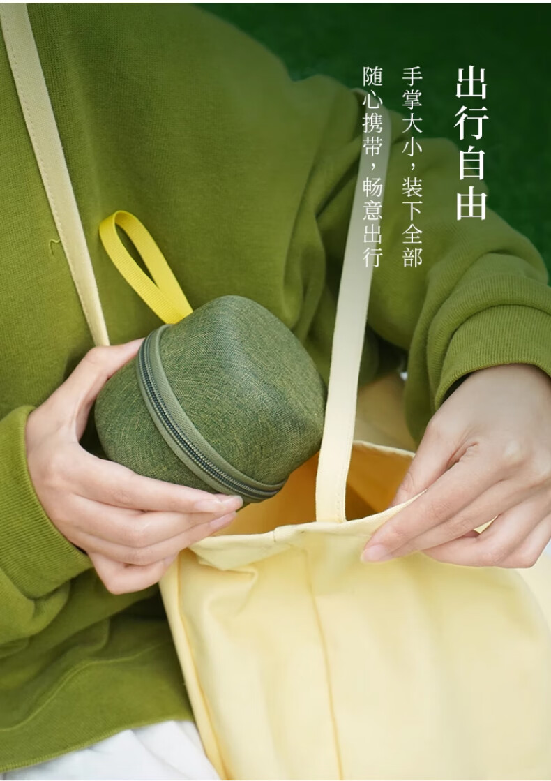 壶身仿果壳,繁复而细致;杯底用线条塑造「福」字;上壶下杯可套叠