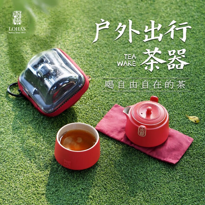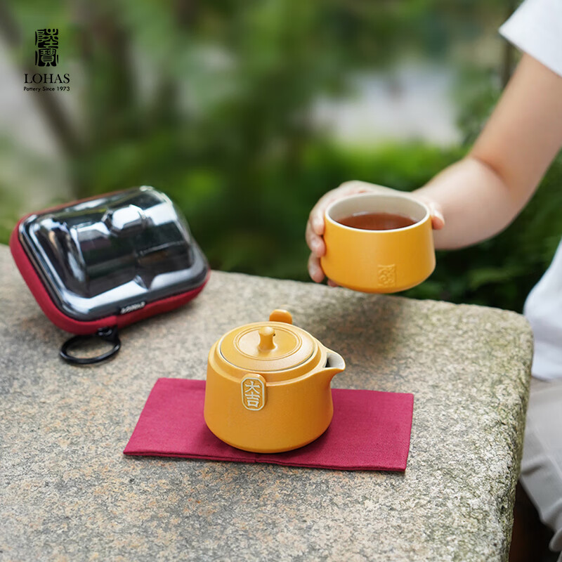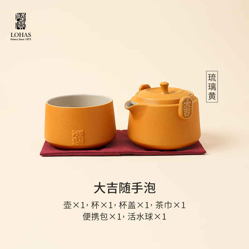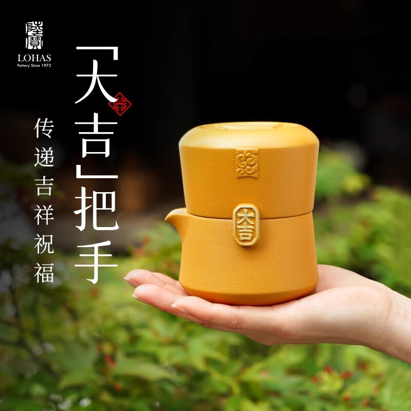 以浮雕工艺将汉字「大吉」融入器物,倾注美好祝福;一壶一杯,一体收纳;搭配便携包,给予舒适惬意的出行享受。
