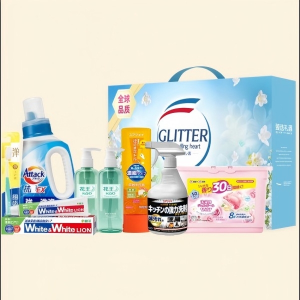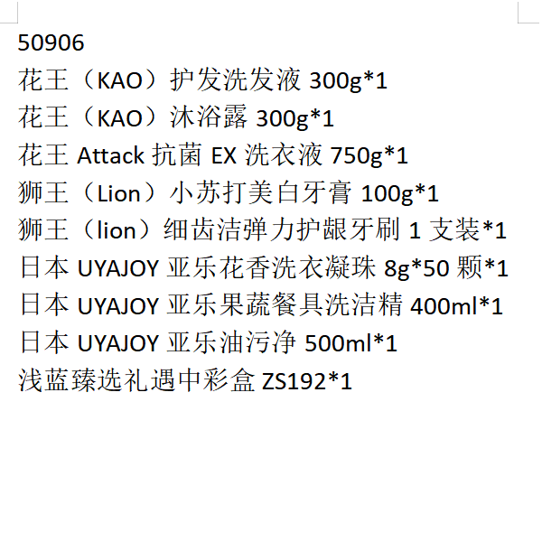 配置清单:50906 花王(KAO)护发洗发液300g*1 花王(KAO)沐浴露300g*1 花王Attack抗菌EX洗衣液750g*1 狮王(Lion)小苏打美白牙膏100g*1 狮王(lion)细齿洁弹力护龈牙刷1支装*1 日本UYAJOY亚乐花香洗衣凝珠8g*50颗*1 日本UYAJOY亚乐果蔬餐具洗洁精400ml*1 日本UYAJOY亚乐油污净500ml*1 浅蓝臻选礼遇中彩盒ZS192*1