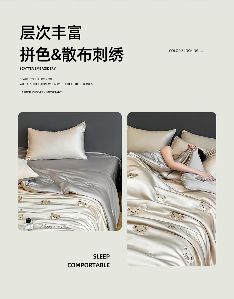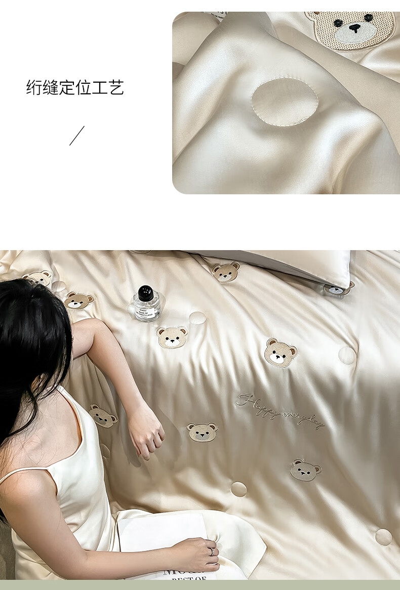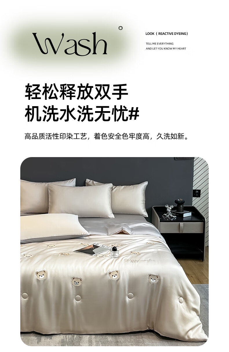 甄选水洗冰丝面料,丝滑触感,凉爽不冰;精湛刺绣工艺,提升卧室美学;高品质活性印染工艺,着色安全,色牢度高