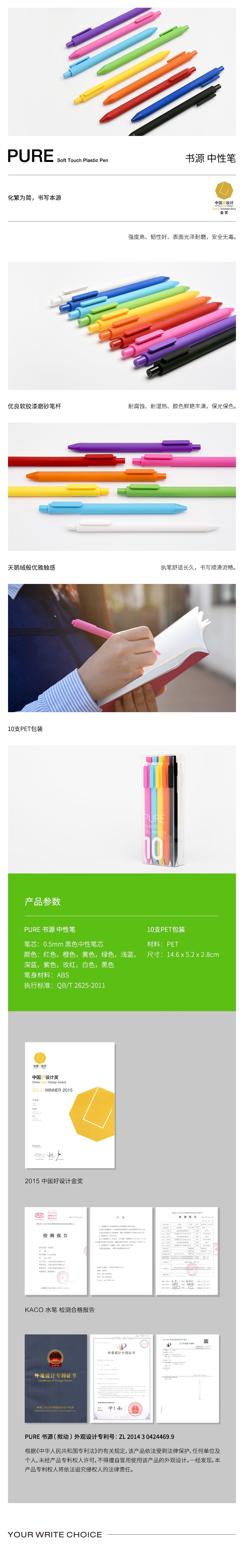 笔杆采用优良软胶喷漆,触感柔和细腻,执笔舒适;选用优良油墨/笔头,落笔顺滑,不易飞白断墨;多款版本,甜蜜糖果色,书写多彩好心情