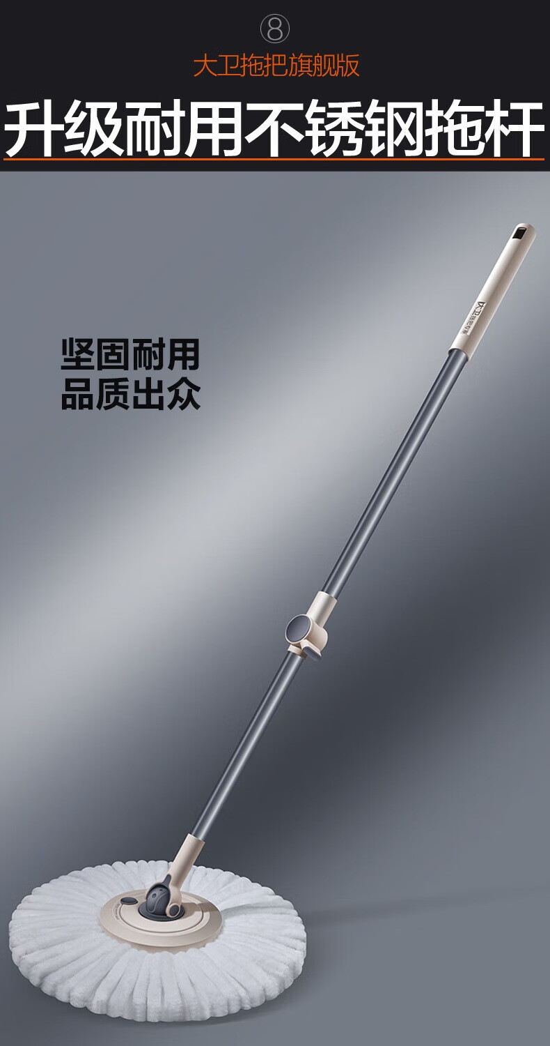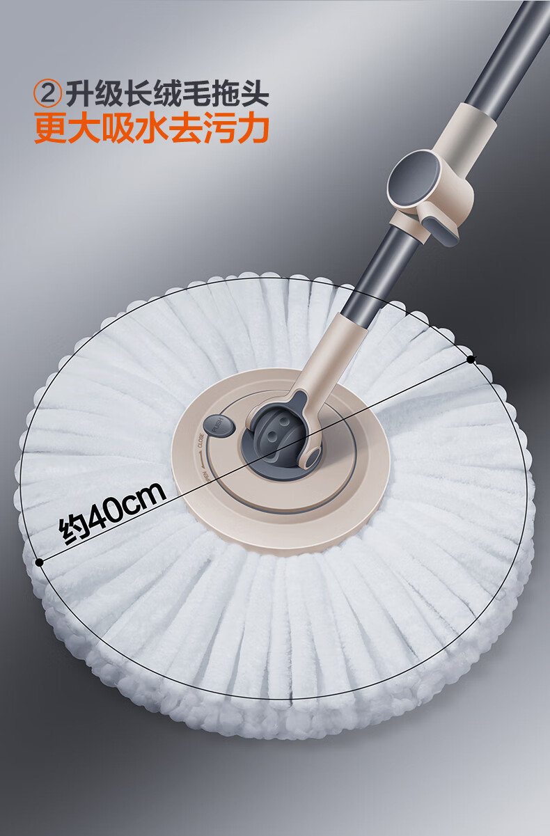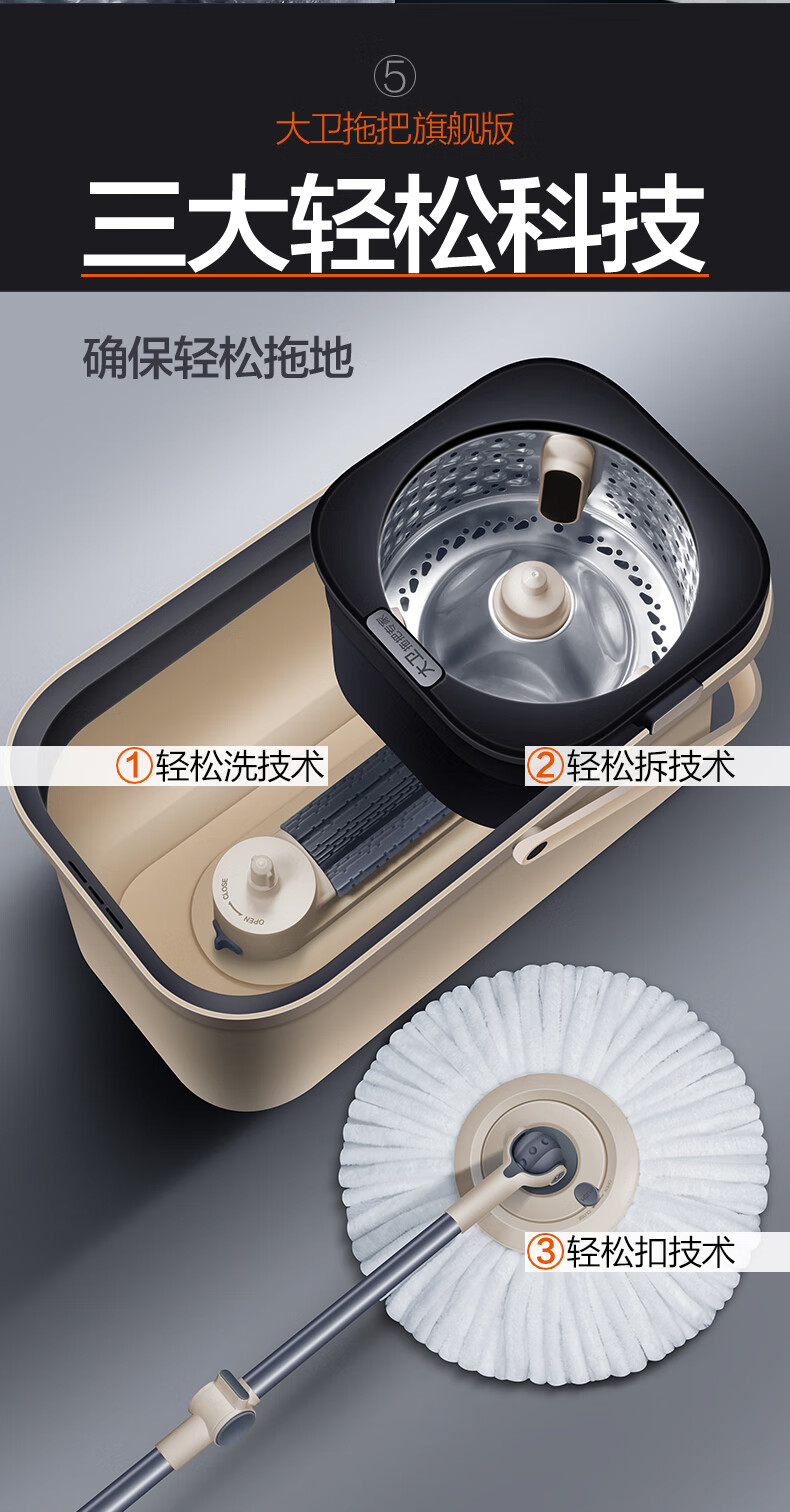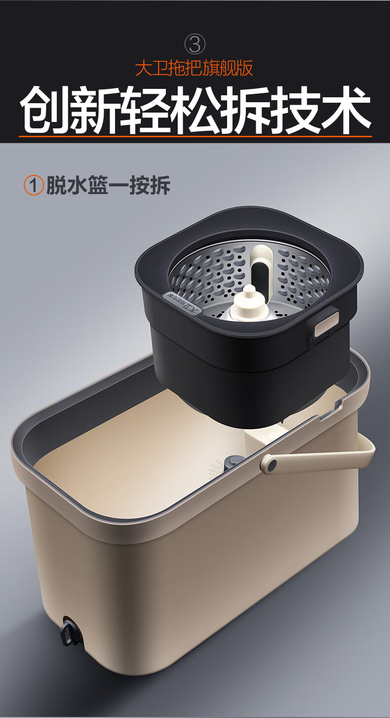 升级长绒毛拖头,更大吸水去污力;创新轻松拆技术,脱水篮一按拆,桶体清洁方便;全新加粗不锈钢拖杆,坚固耐用,品质出众